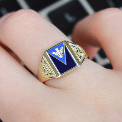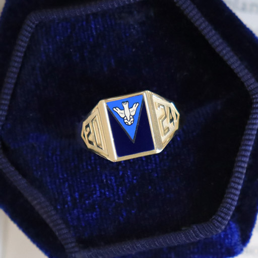 Rings are available in 4 head sizes. The “head size” refers to the square crest across the top of the ring, not the wearer’s ring size. All rings are available in Sterling Silver, Yellow, and White Gold, in either 10 KT , 14 KT or 18 KT. You can choose between a plain or antiquing background for your graduation year. Backdating is also available for an additional $15 charge. A fifty percent deposit is required when ordering your Graduation Ring, the remainder is due upon arrival.