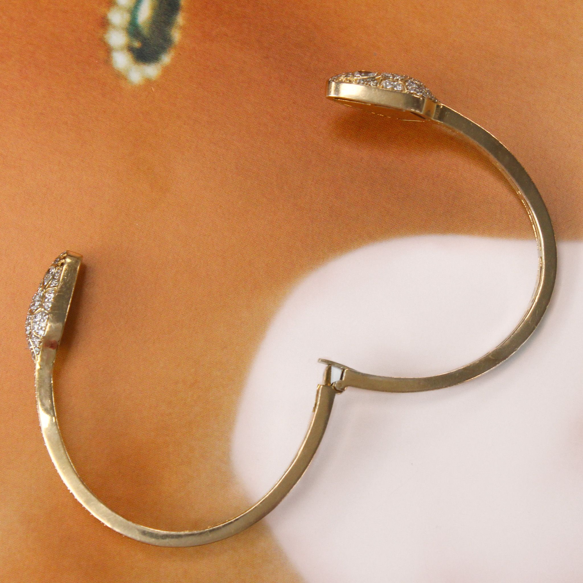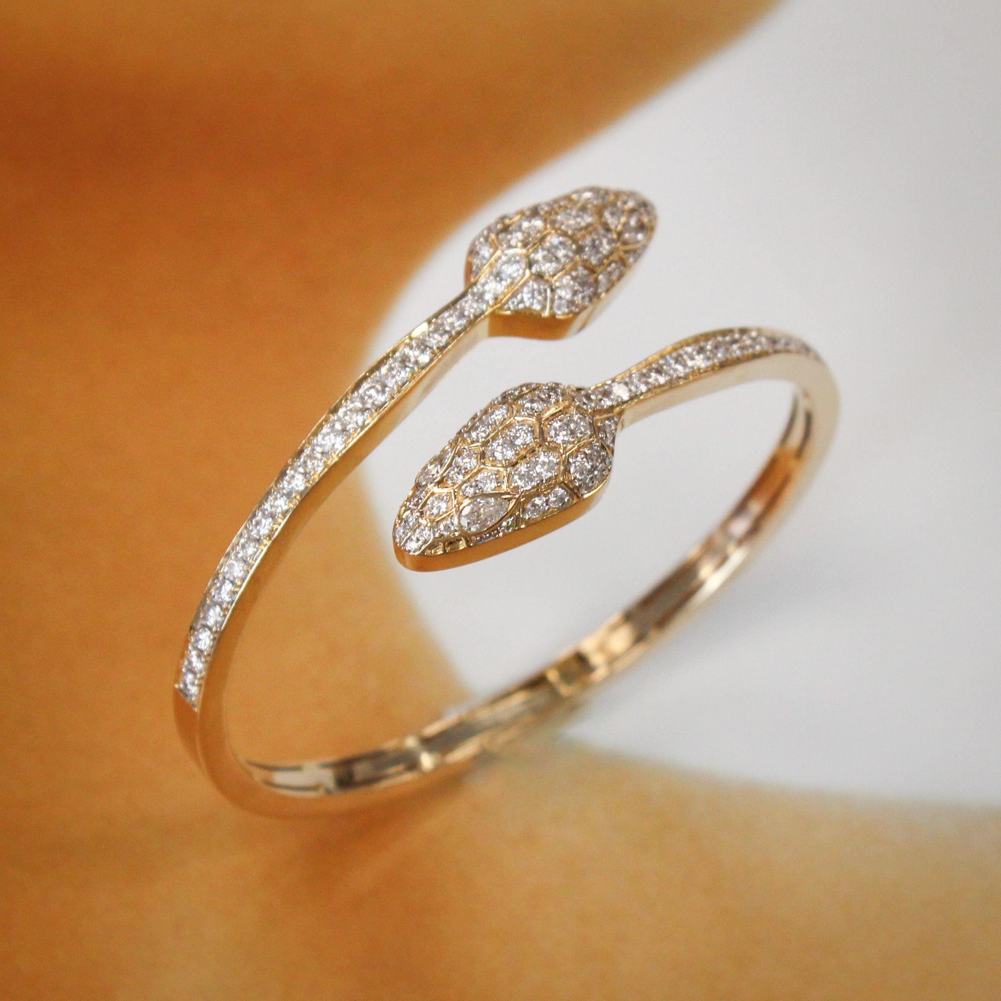 This chic double headed, hinged snake bangle adds an edgy touch of sophistication to your wrist. The diamond encrusted details are incredible, especially the pear shaped diamond eyes. We'd love to see this everyday piece layered in an arm stack!