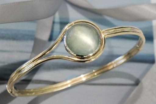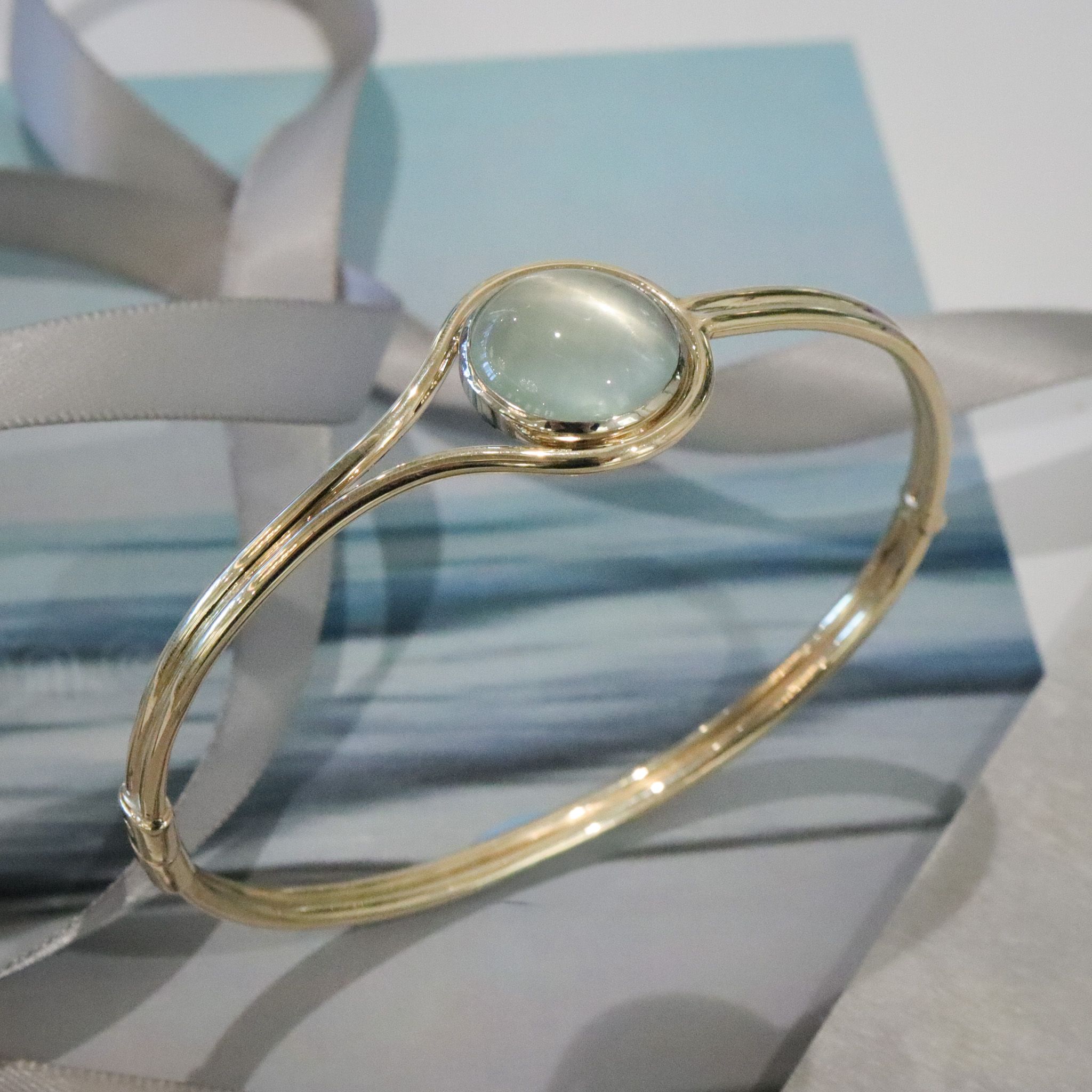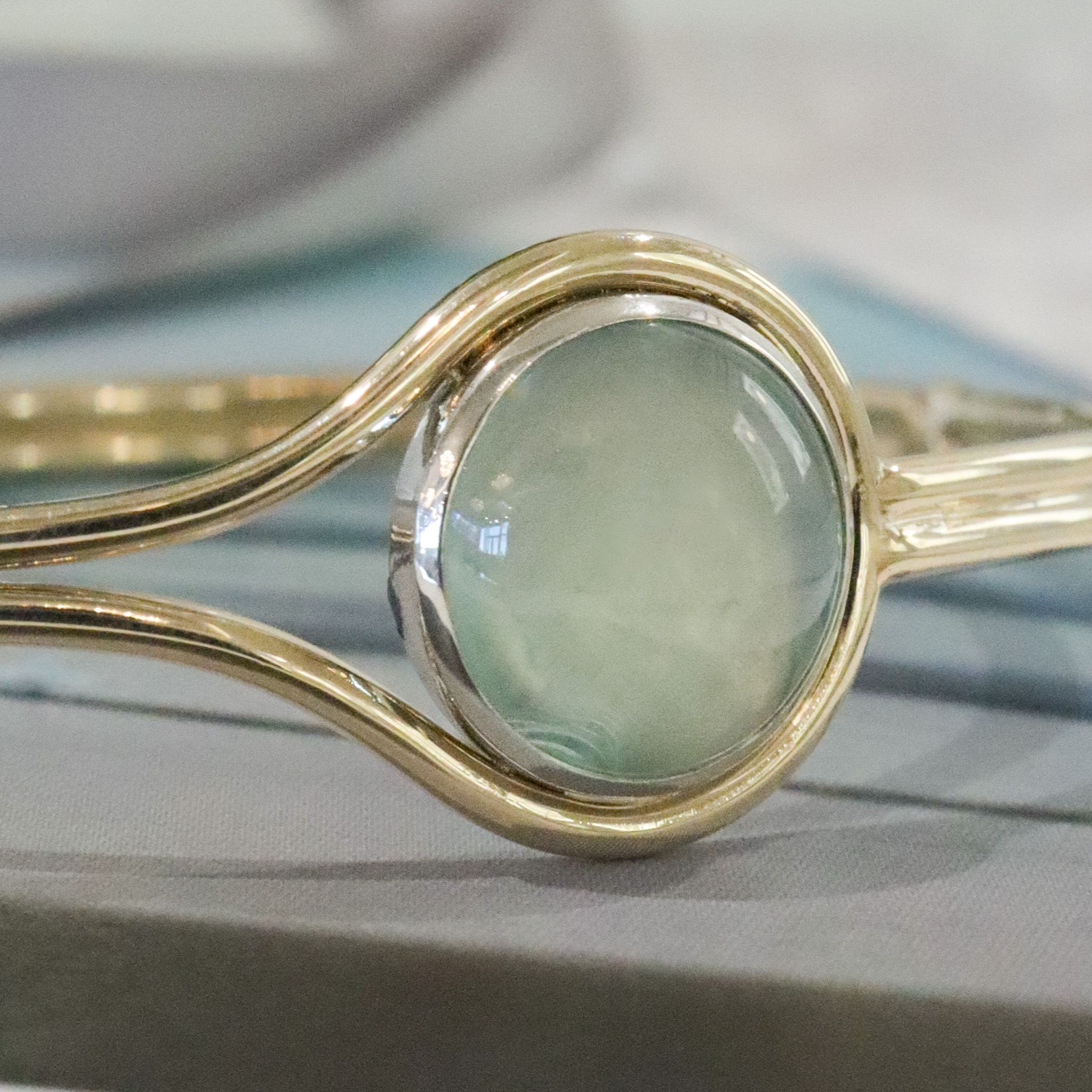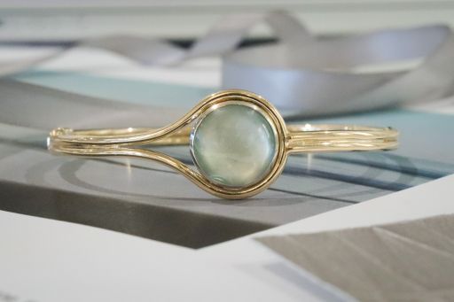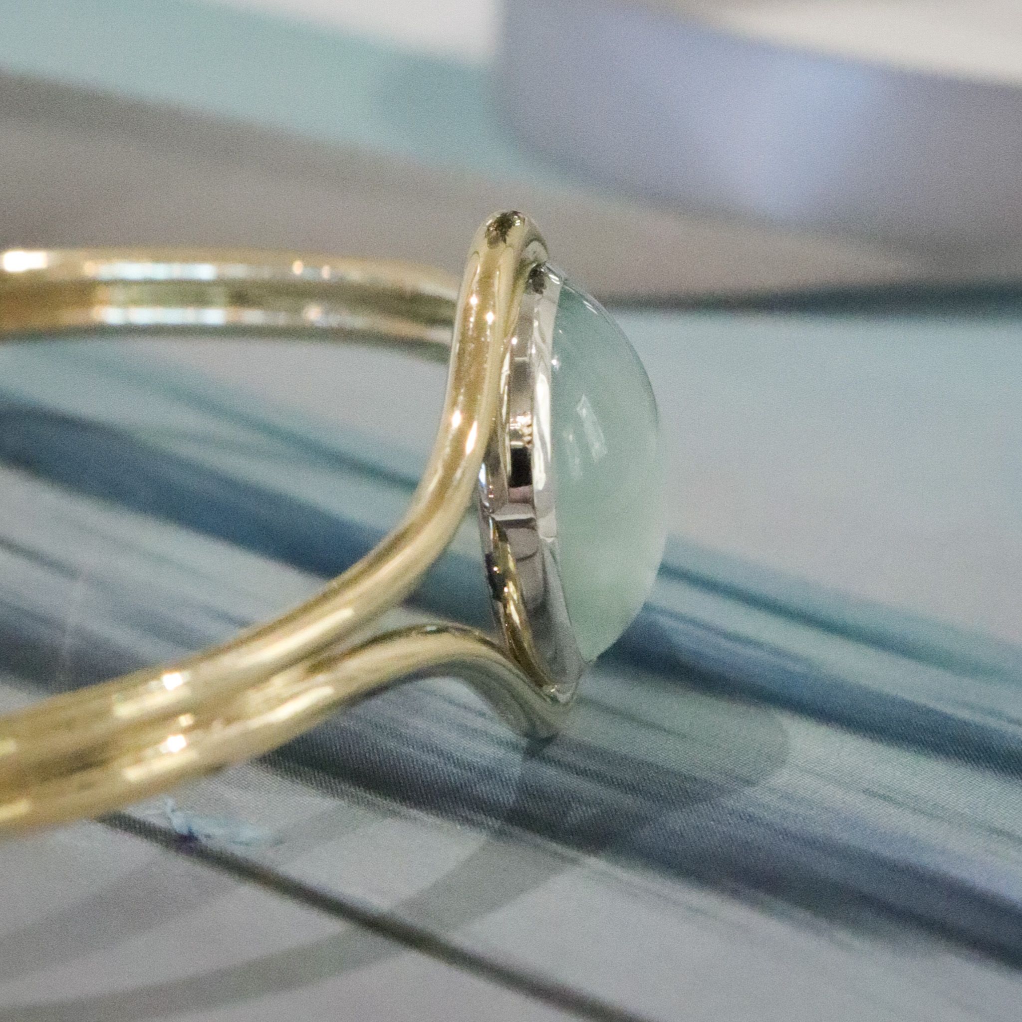 Highlighted by an 14k white gold bezel, this light and airy cabochon aquamarine captures the peaceful feeling of a misty morning by the water. Warm yellow gold lassos itself softly around the stone. Cool, calm, and now collectible.
