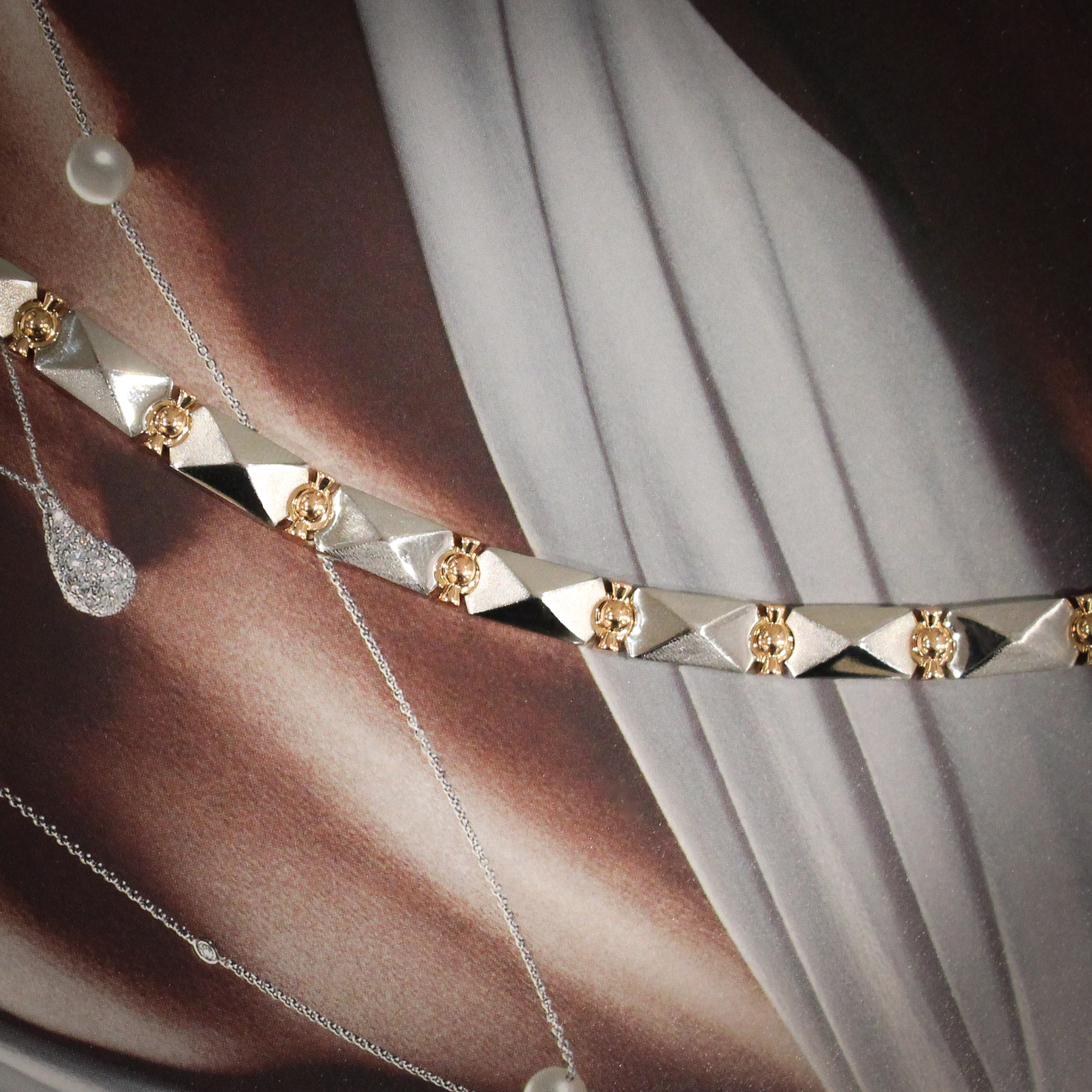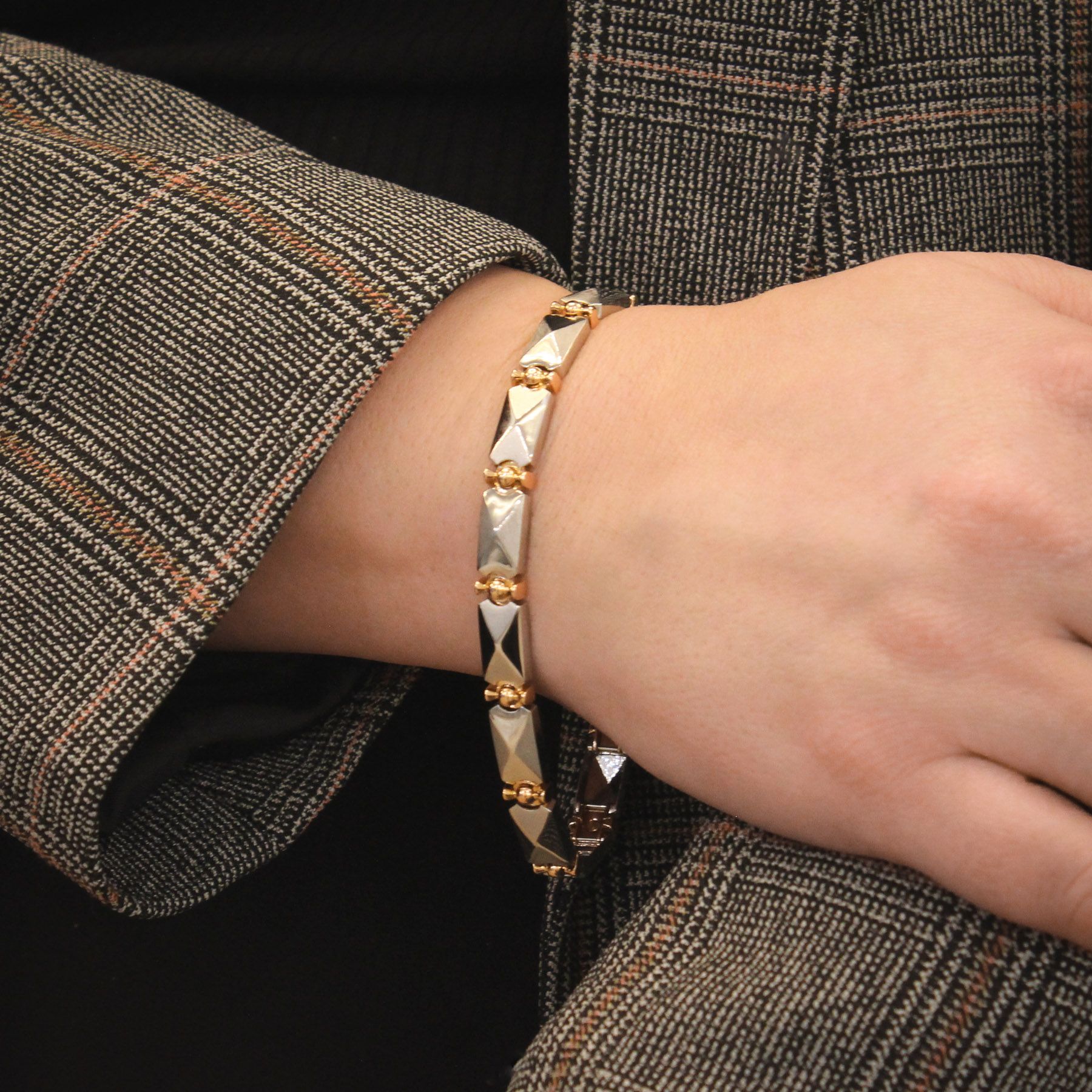 A sturdy, well made platinum and rose gold bracelet with an eye-catching geometric pattern. The mixed metal two-tone design gives this piece stylish flair.