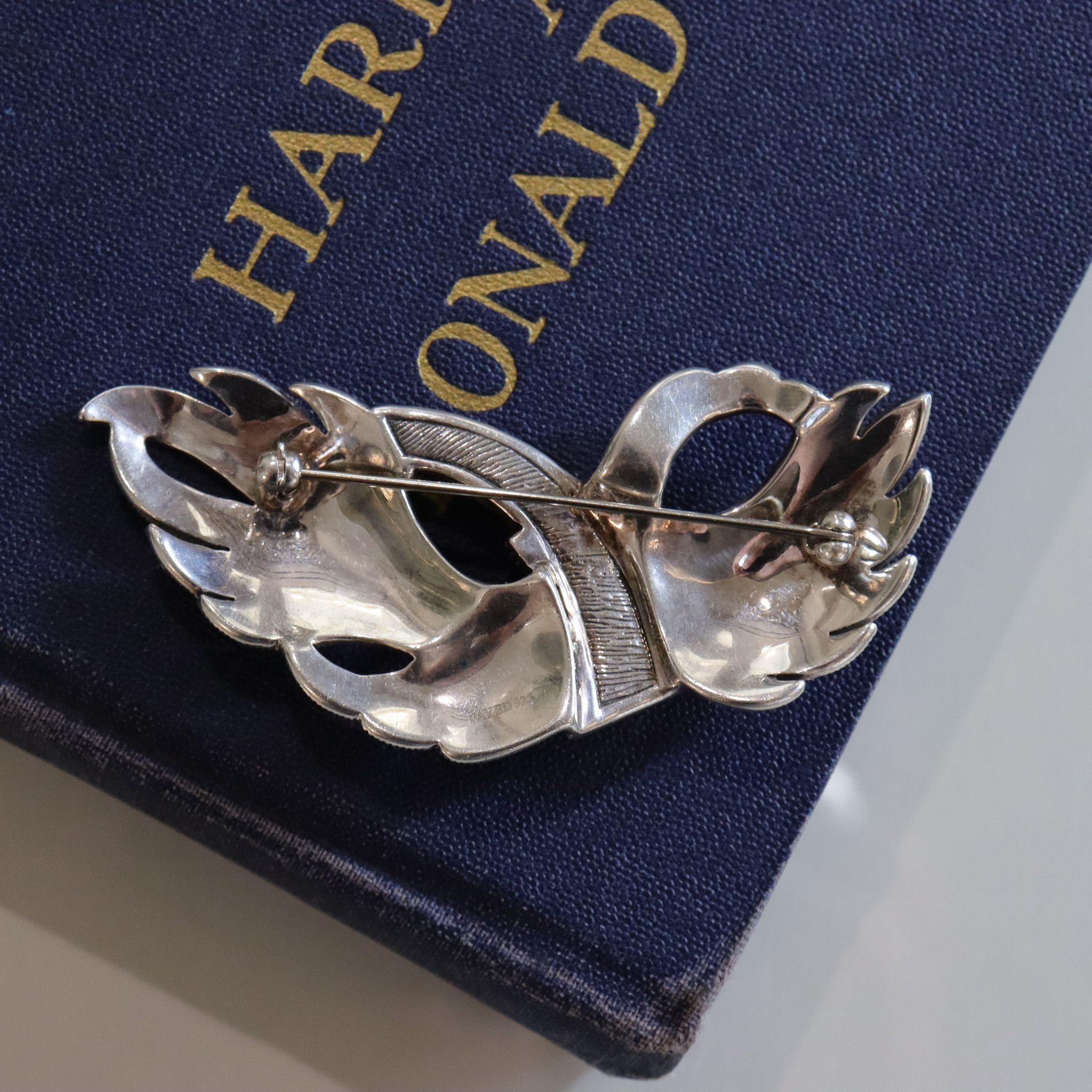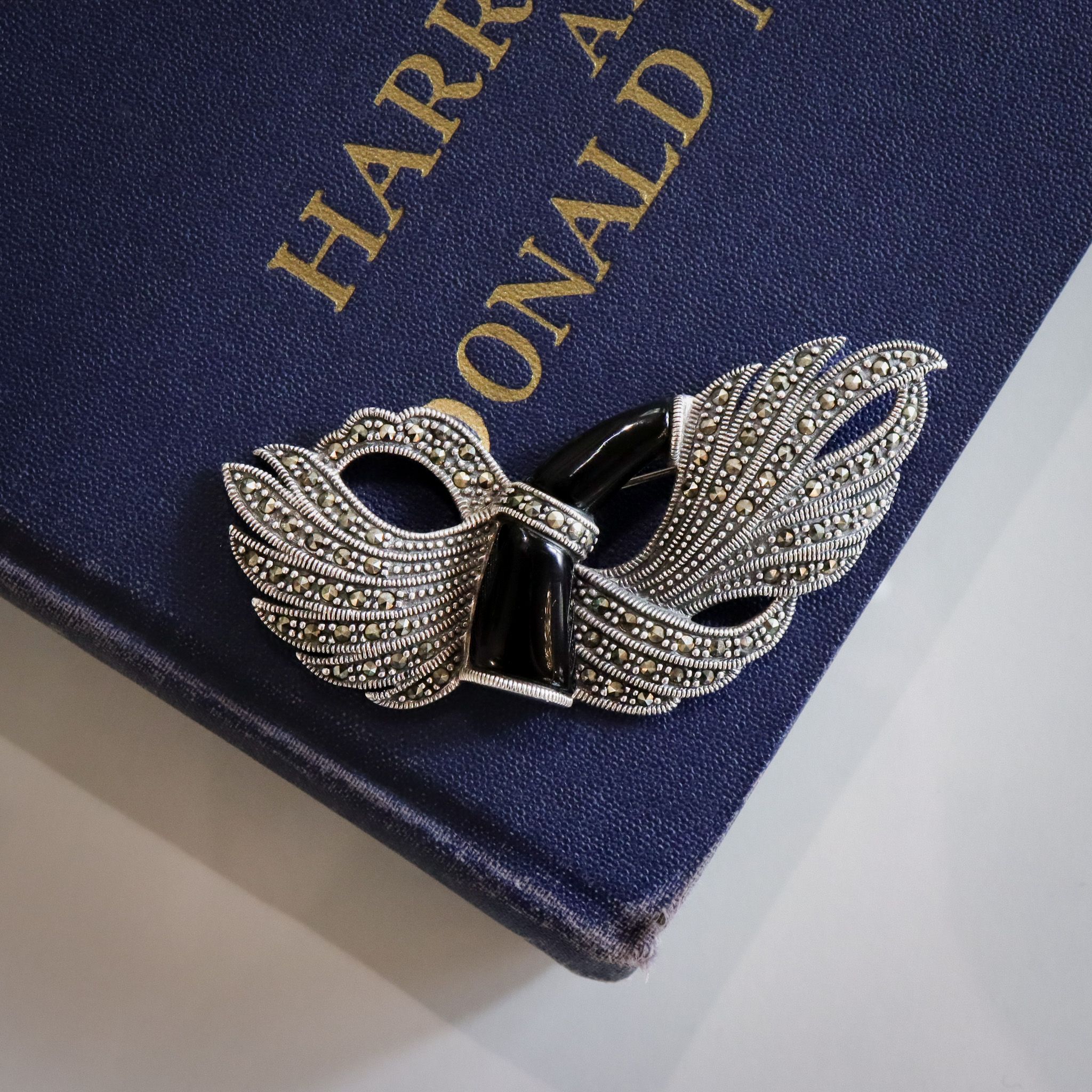 A classic showcase of Art Deco jewellery: marcasites & onyx! This unique and bold brooch features feather-like silver that surrounds the cut onyx.