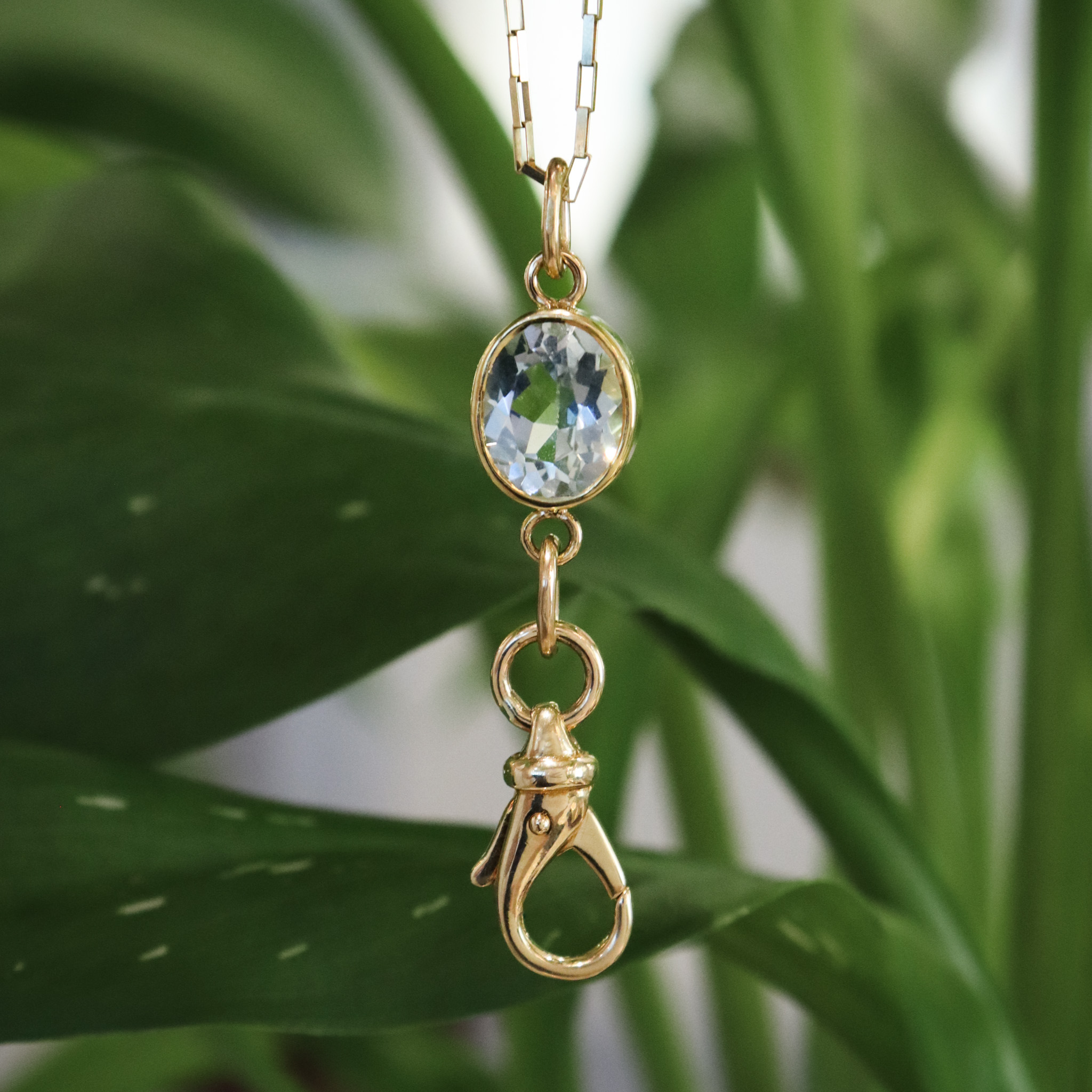 This soft aquamarine has been bezel-set in buttery 18k yellow gold and extended with a large 14k rosy-yellow gold antique lobster clasp. This sweet charm is a versatile addition to any collection; wear as a chain extender, pendant, bag charm - the choice is yours!