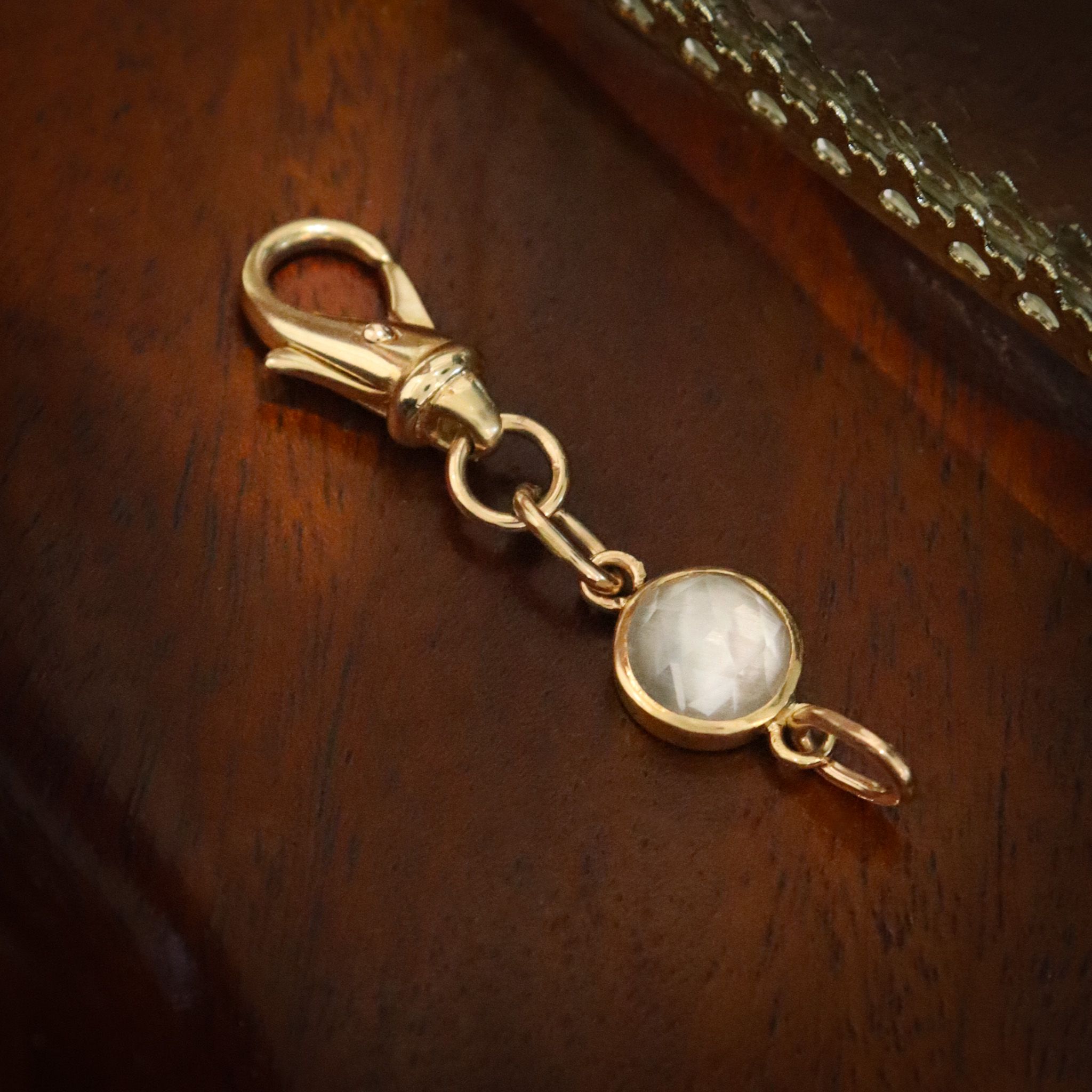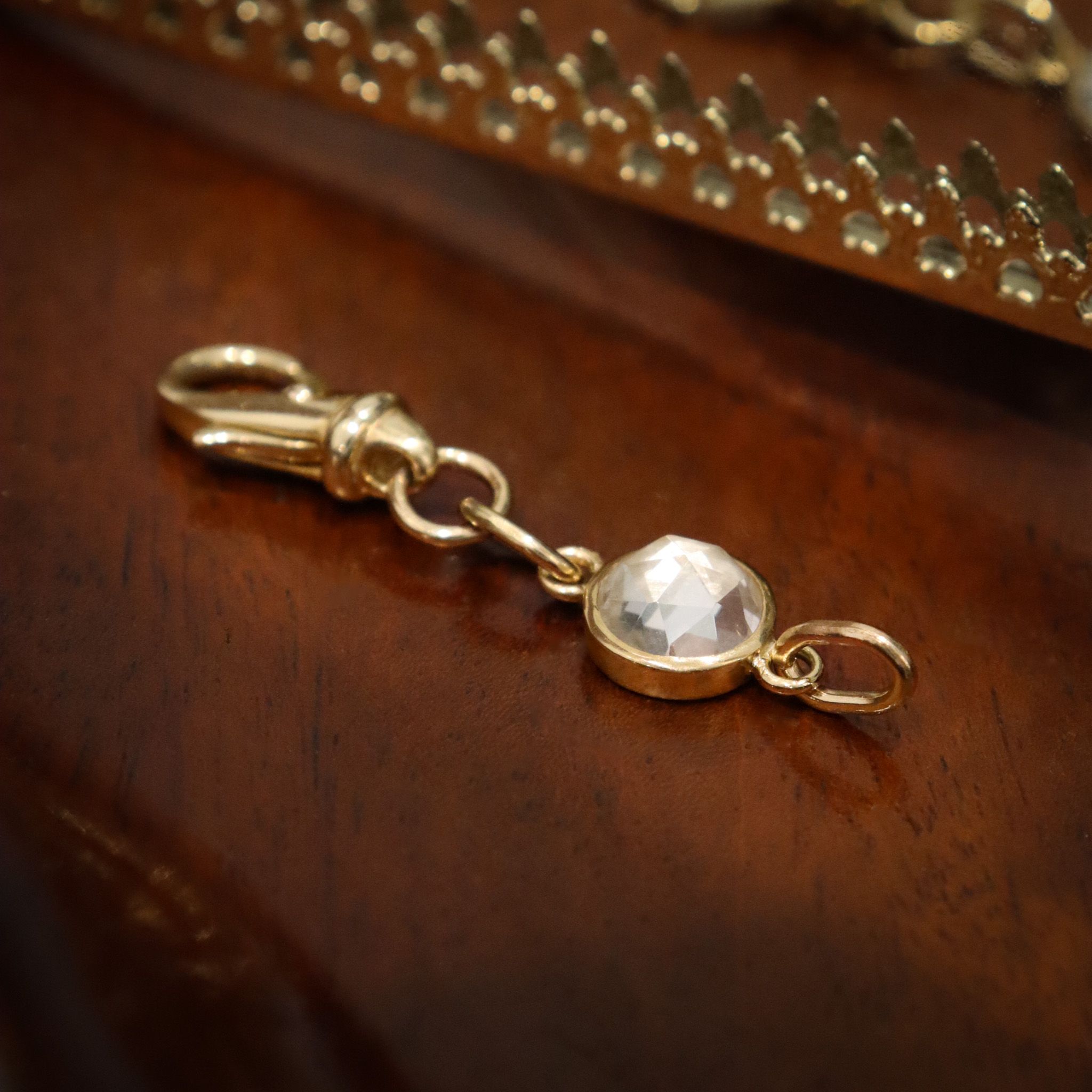 A sweet rose-cut white topaz charm, set in buttery 18k yellow gold and extended with a large 14k yellow gold antique lobster clasp. This darling charm can be an alternative birthstone for the month of April. A versatile addition to your collection; this can be used as a chain extender, pendant, bag charm - get creative with it!