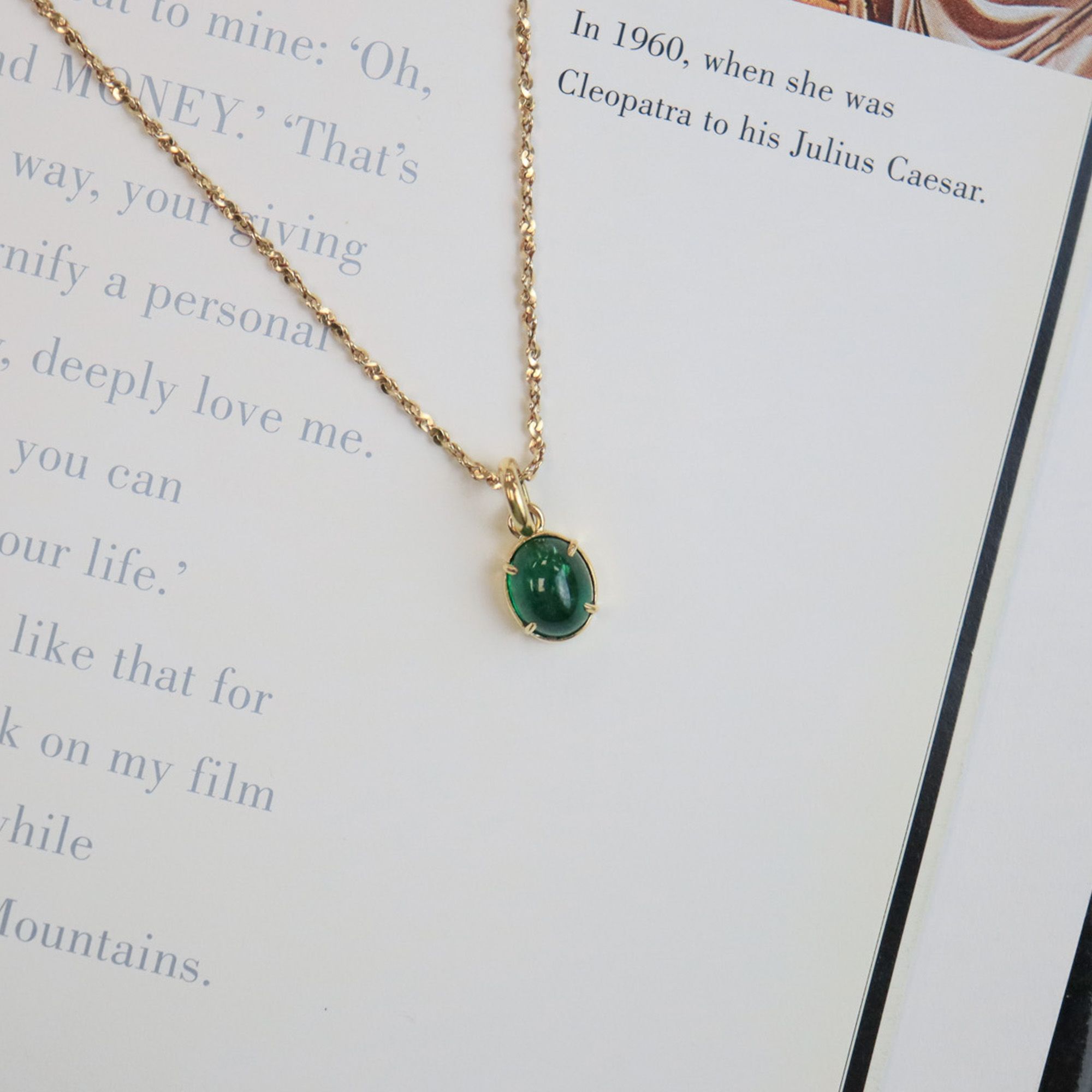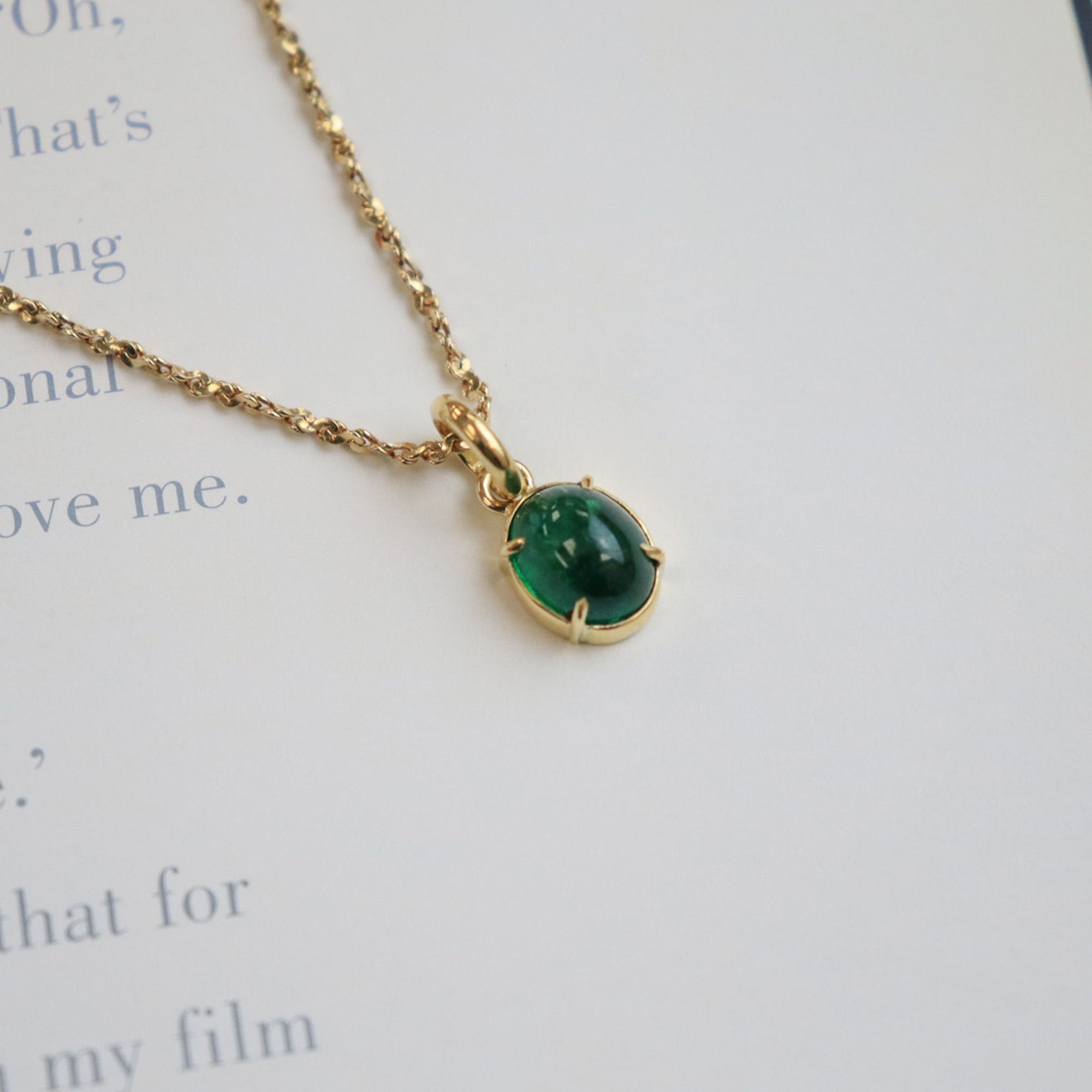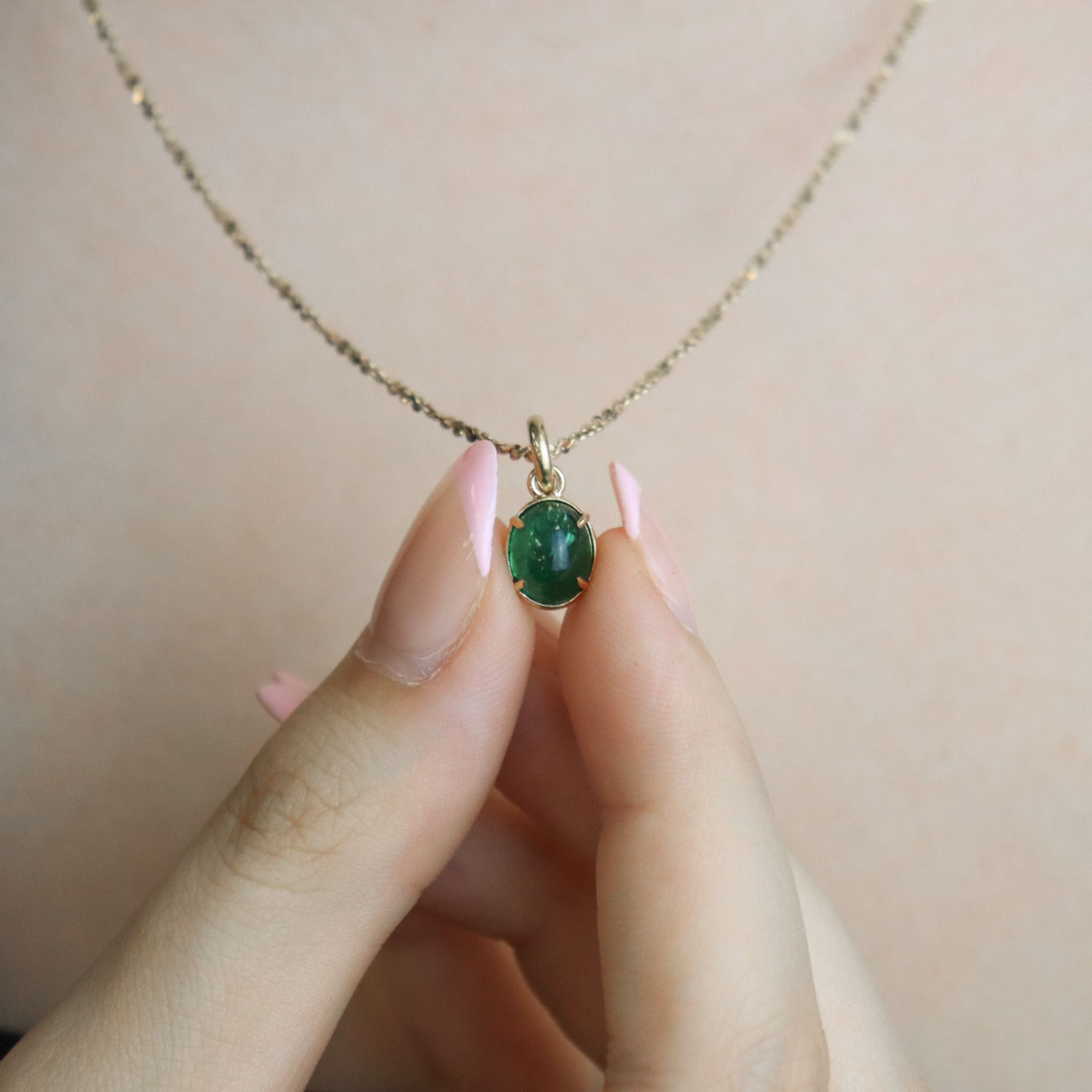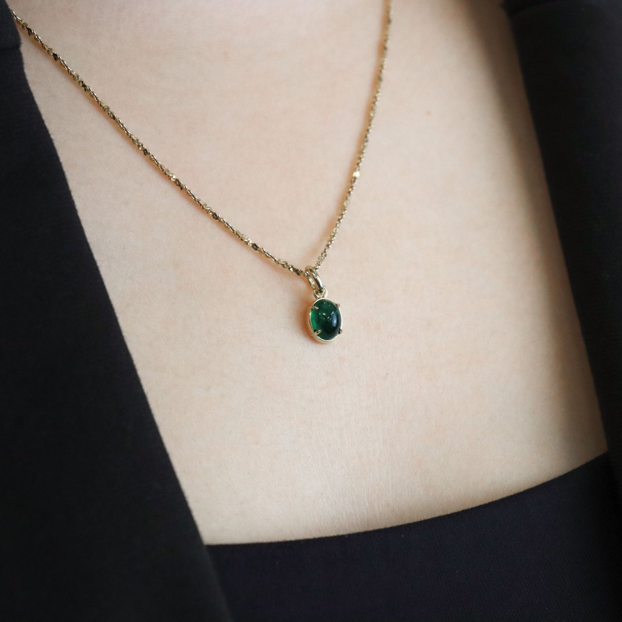 A vibrant green cabochon emerald, set in 18k yellow gold to enhance that beautiful colour.