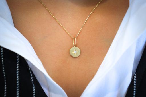 A vintage inspired charm - a thick round disk of buttery 18k yellow gold, star set with a 0.05ct round brilliant diamond. This north star charm is sure to add whimsy to any neck stack or keep as a romantic statement on its own. Accompanied by 16.5 inches, 14k rolo chain