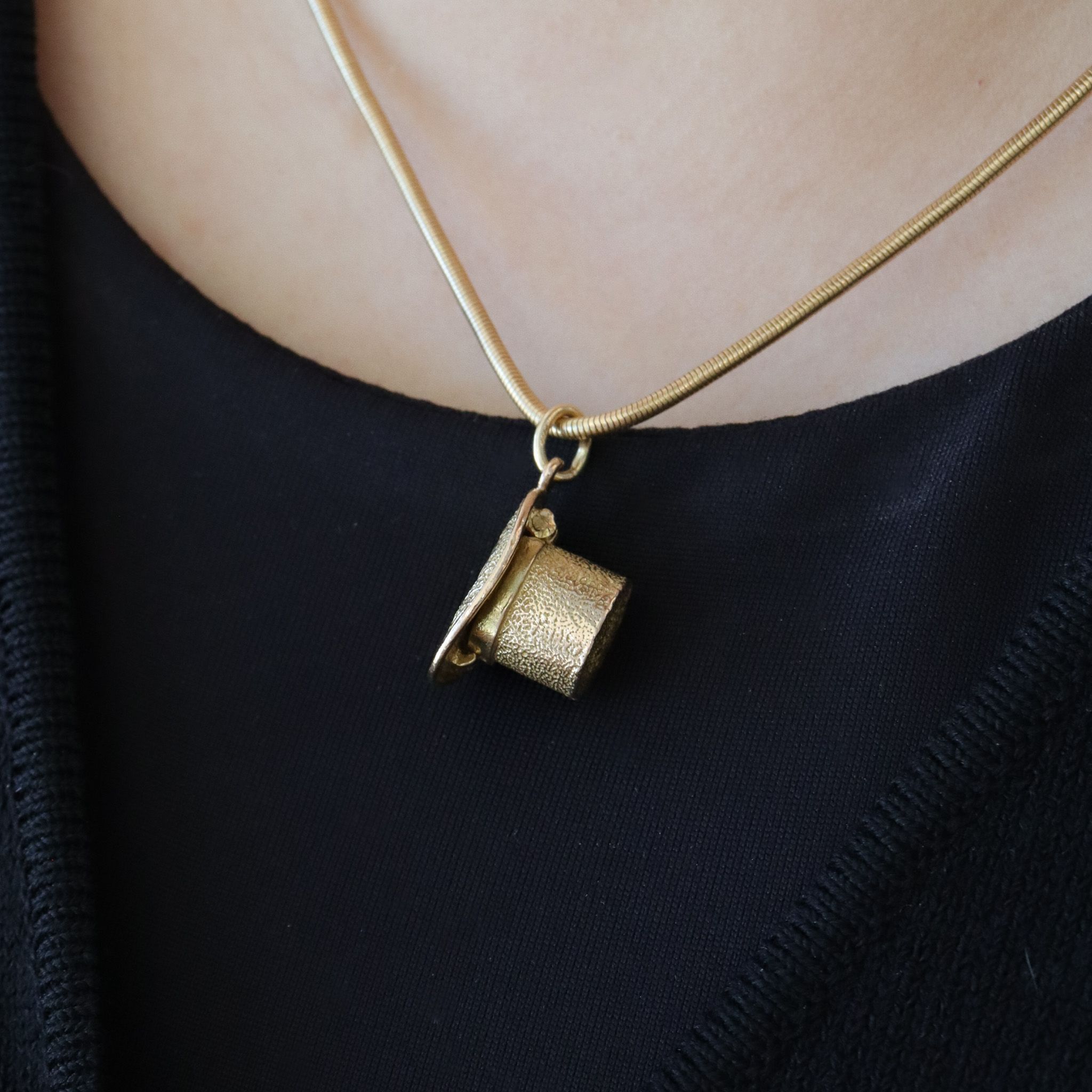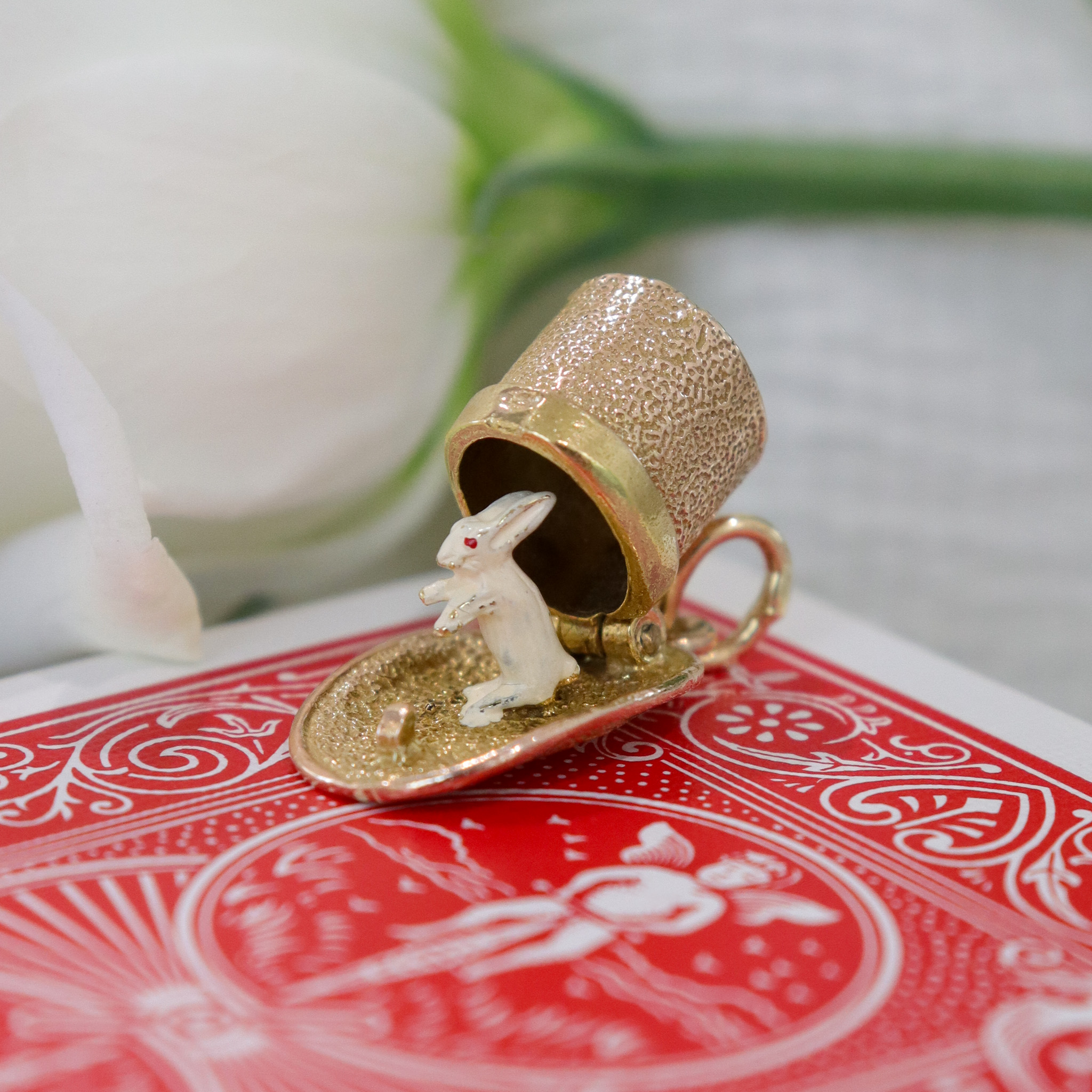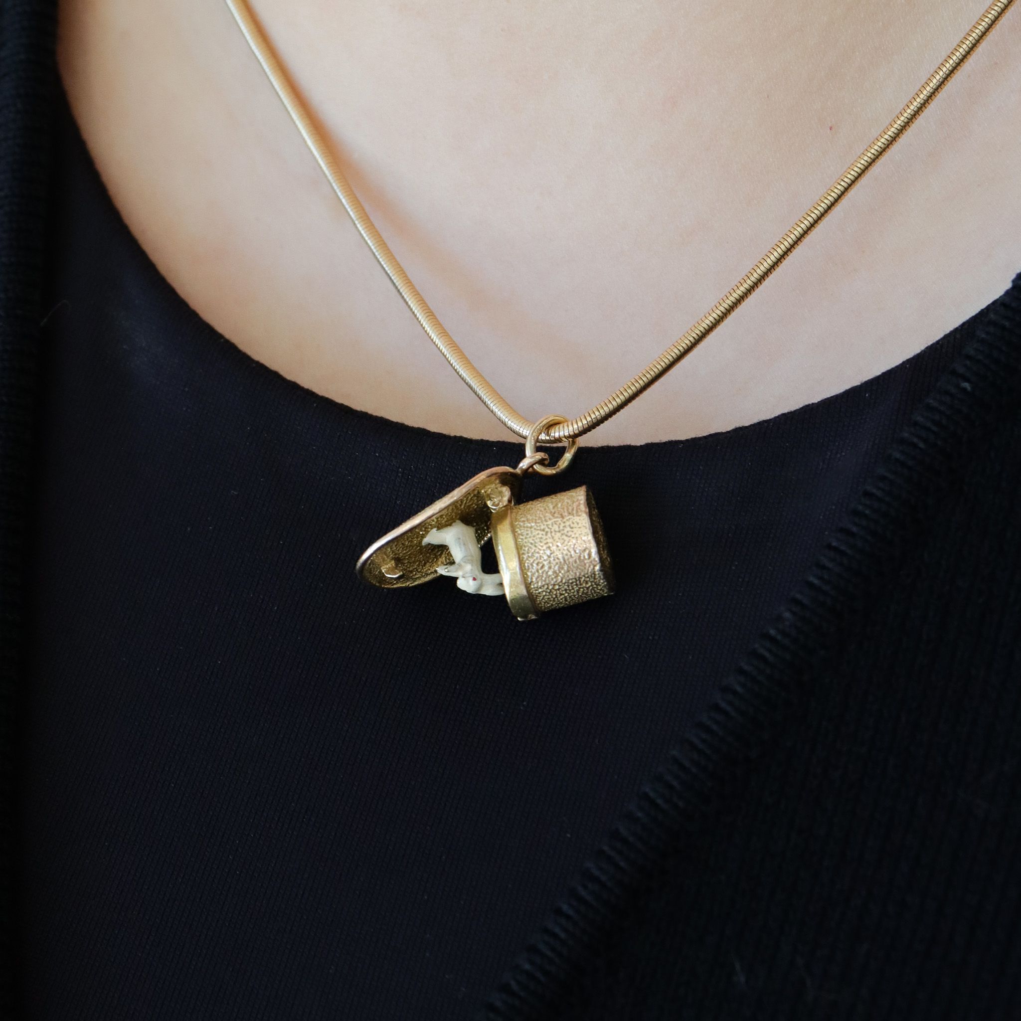 Top of hat opens to reveal white enamel rabbit.