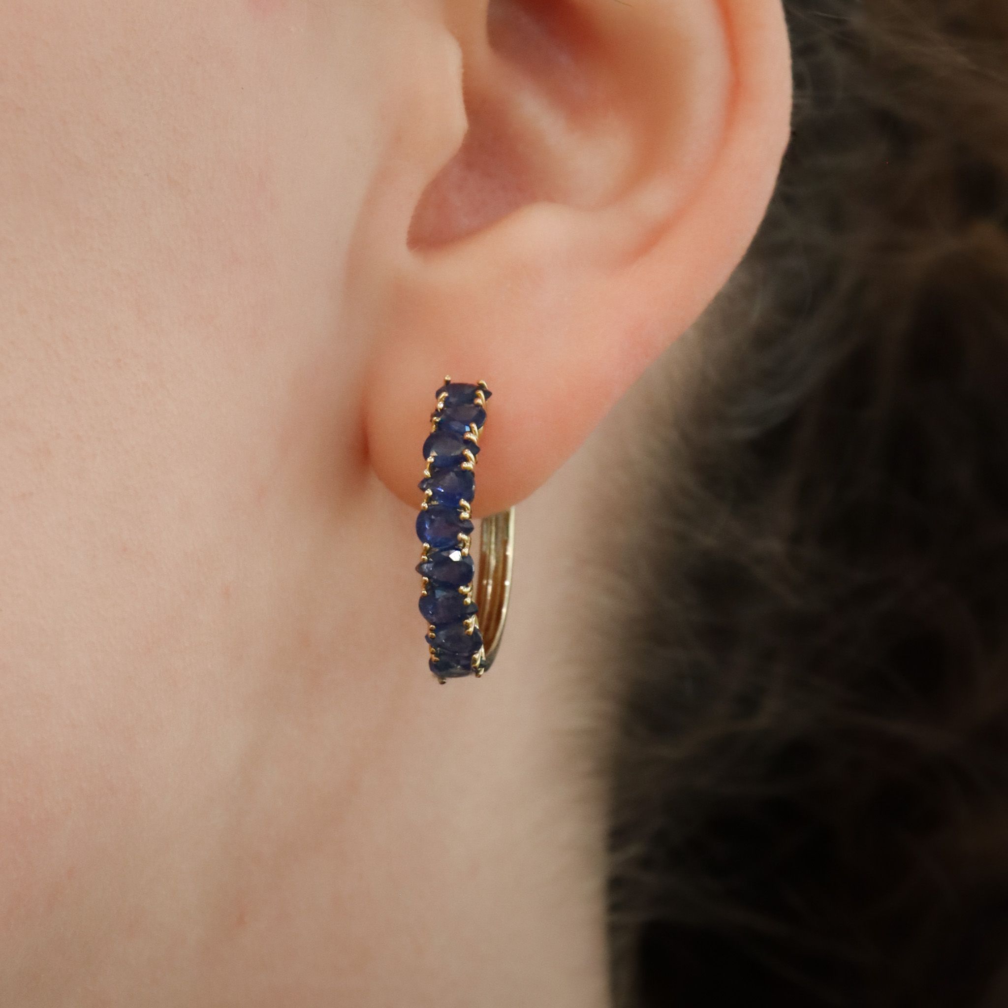 An alternating line-up of pear-shaped nearly-cornflower blue sapphires are a sophisticated and unique variation of a classic gemstone hoop.