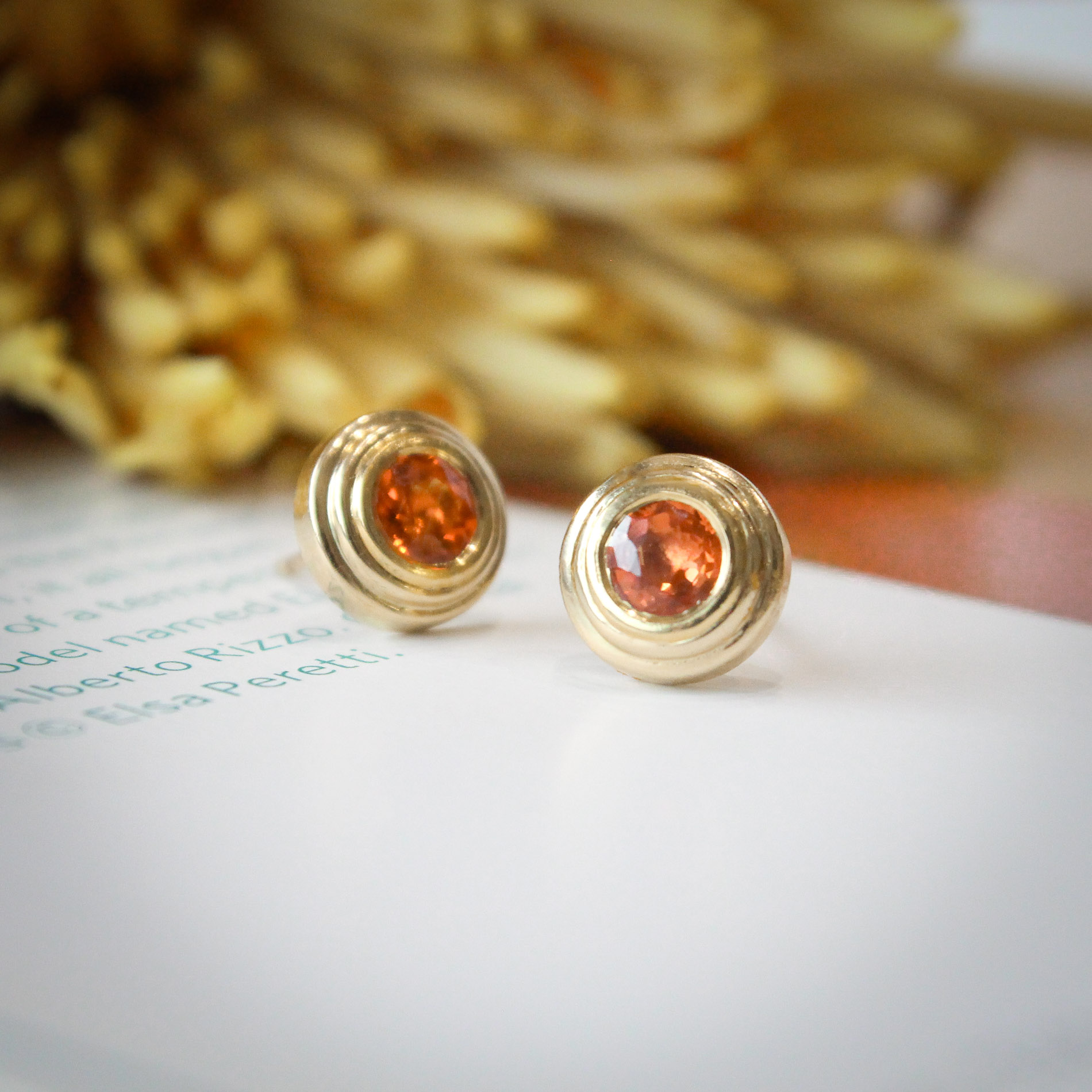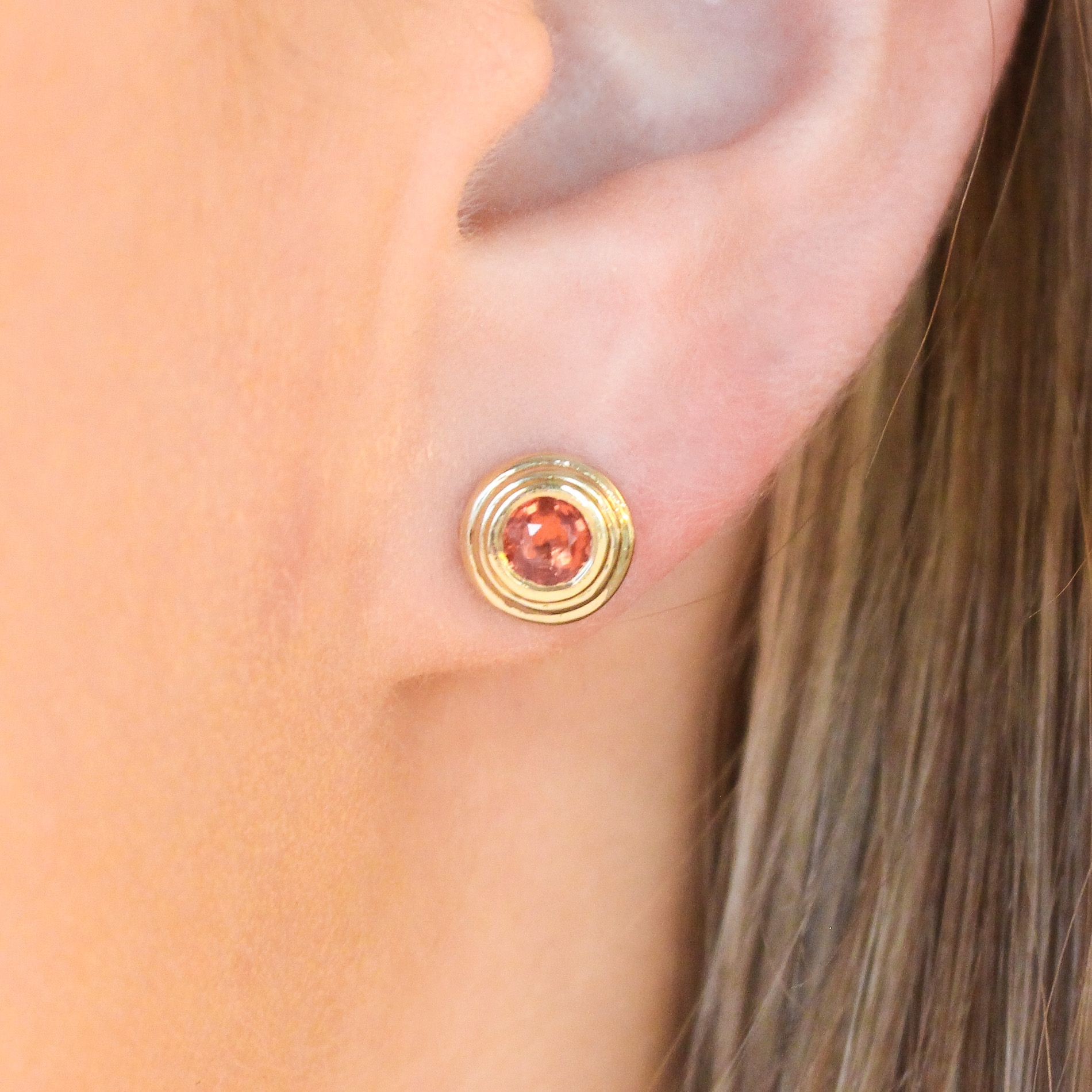 A vivid pair of round brilliant cut orange sapphires are surrounded by 3 rings of buttery rich 18k gold, in these stud earrings. Set securely in a bezel, made to be sleek, comfortable & easy for everyday wear. A stylish nod to the maritime legacy of this place.