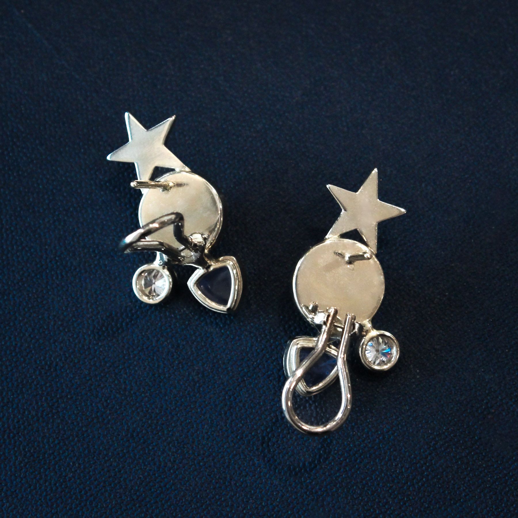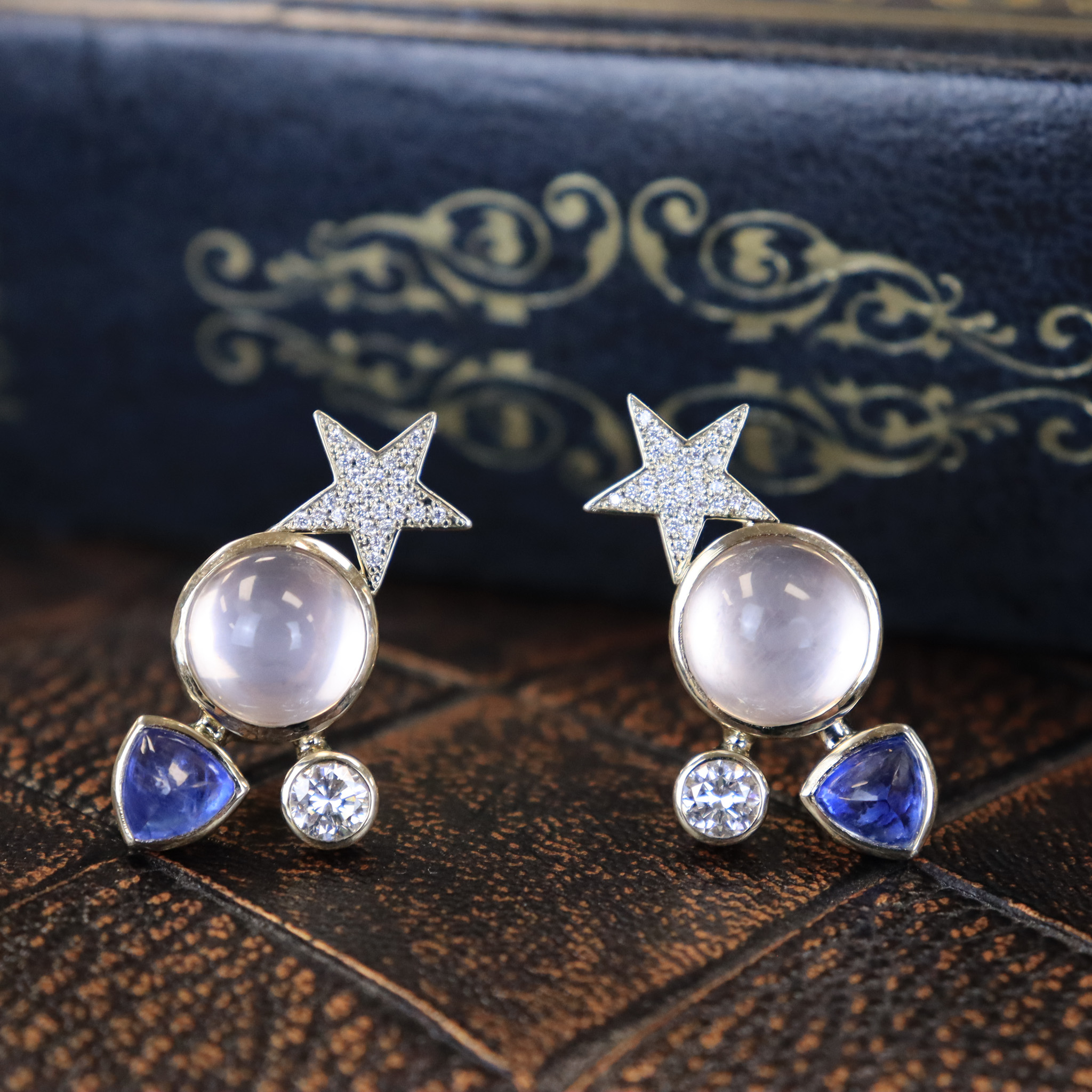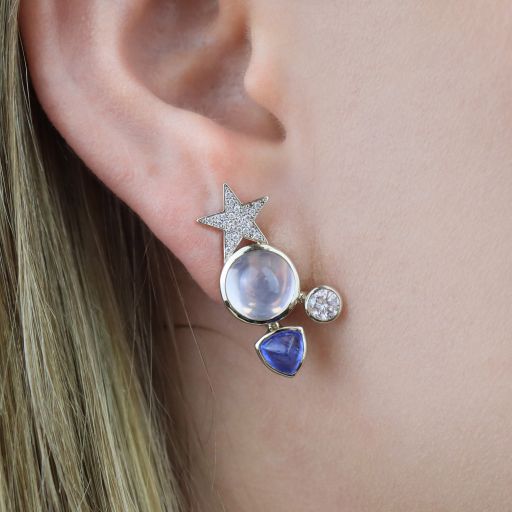 These celestial earrings travel across your ear with star rose quartz, cabochon sapphires, and sparkling diamonds. An omega back securely holds them in place, and simple bezel settings allows these stones to glow. This spectacular custom-made pair of earrings are perfect for any lovers of the night sky.