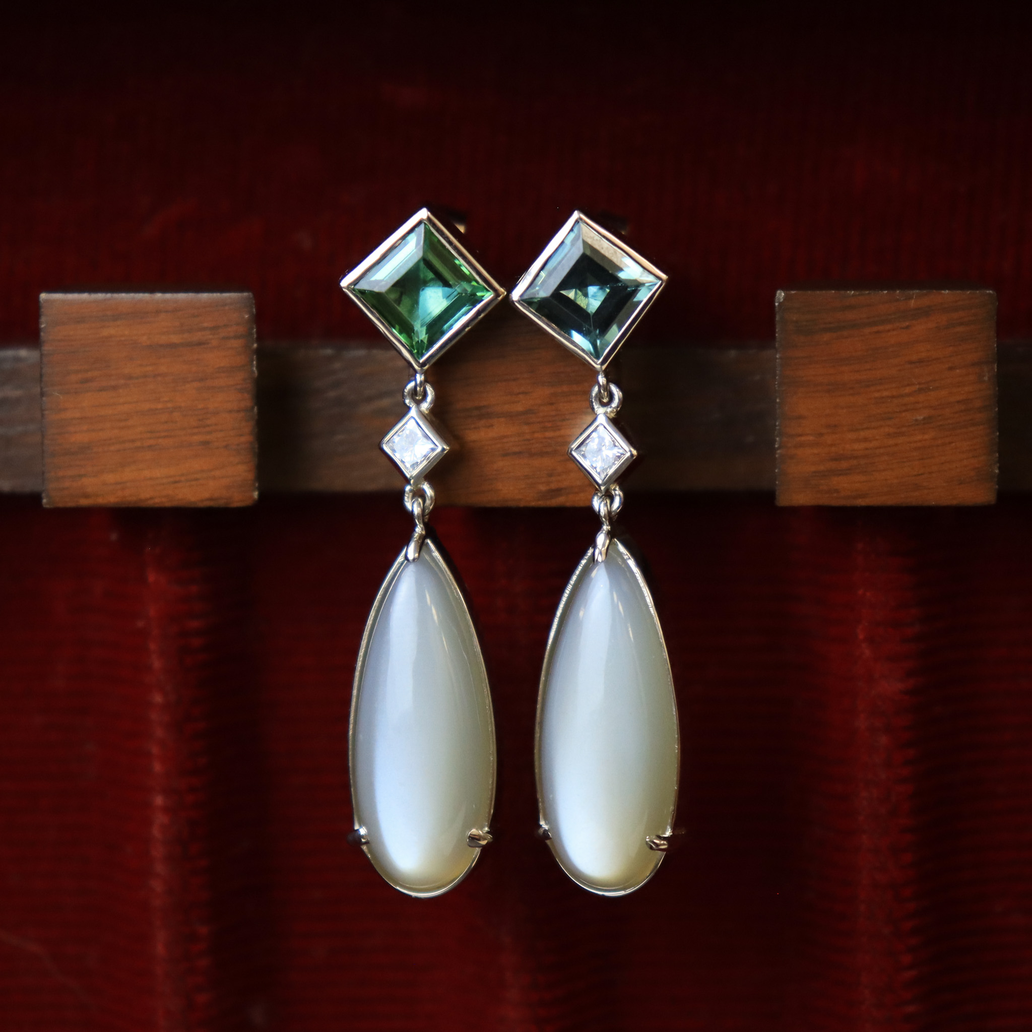 18kw Tourmaline, Diamond & Moonstone Earrings