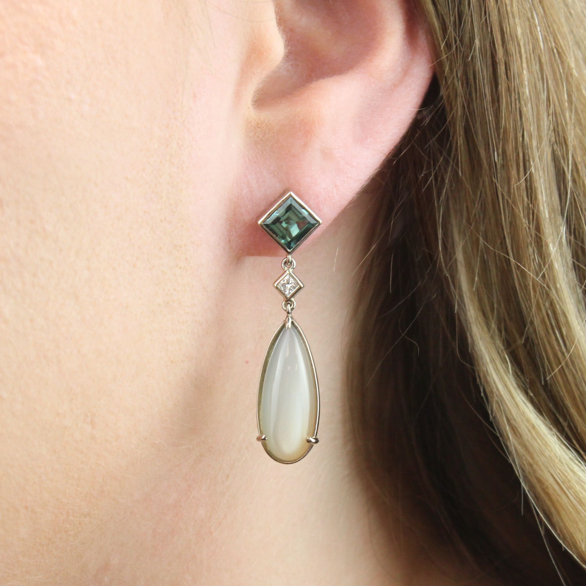 While being soft and muted, these 18kw dangles also have a bit of an edge to them. Moody green tourmalines balance out the pale opaque moonstone drops. This pair of earrings are everything you need for day-to-day, or as a special occasion.