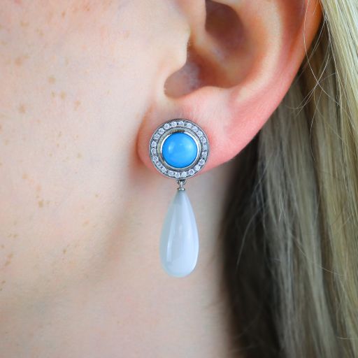 We love versatility in jewellery pieces. These earrings were designed with removable Moonstone drops, giving the wearer two distinct looks. Refined & classic as studs, the turquoise cabochons are surrounded by a halo of round brilliant cut diamonds. Adding the moonstone drops give a more sophisticated & elevated look to this pair of earrings.