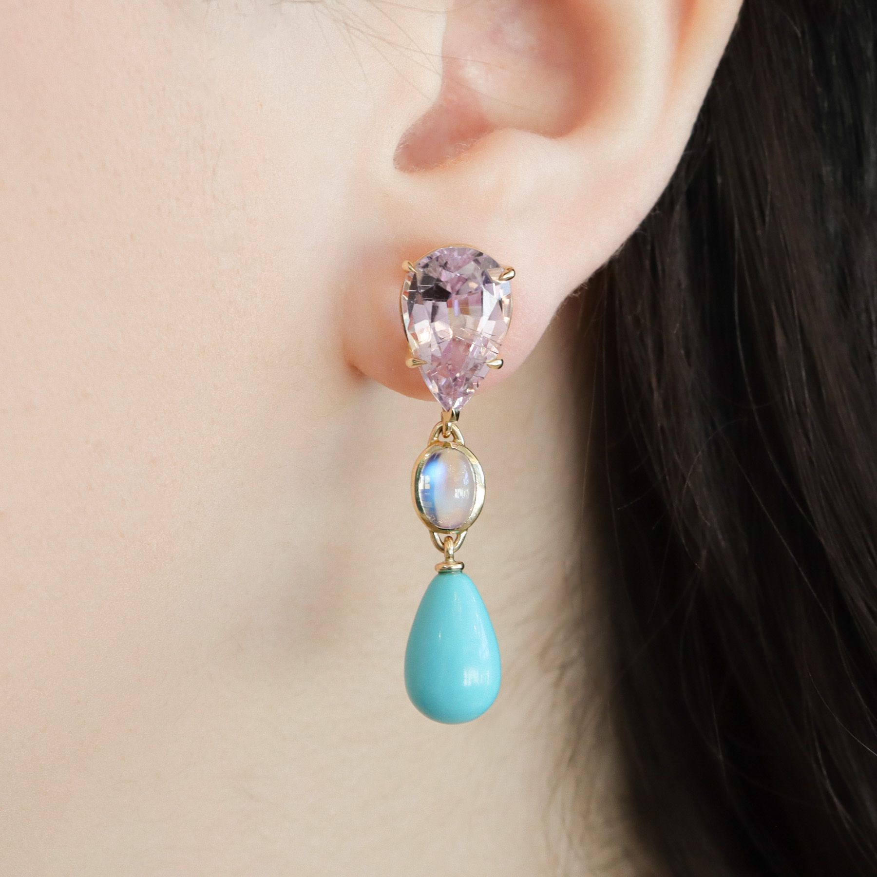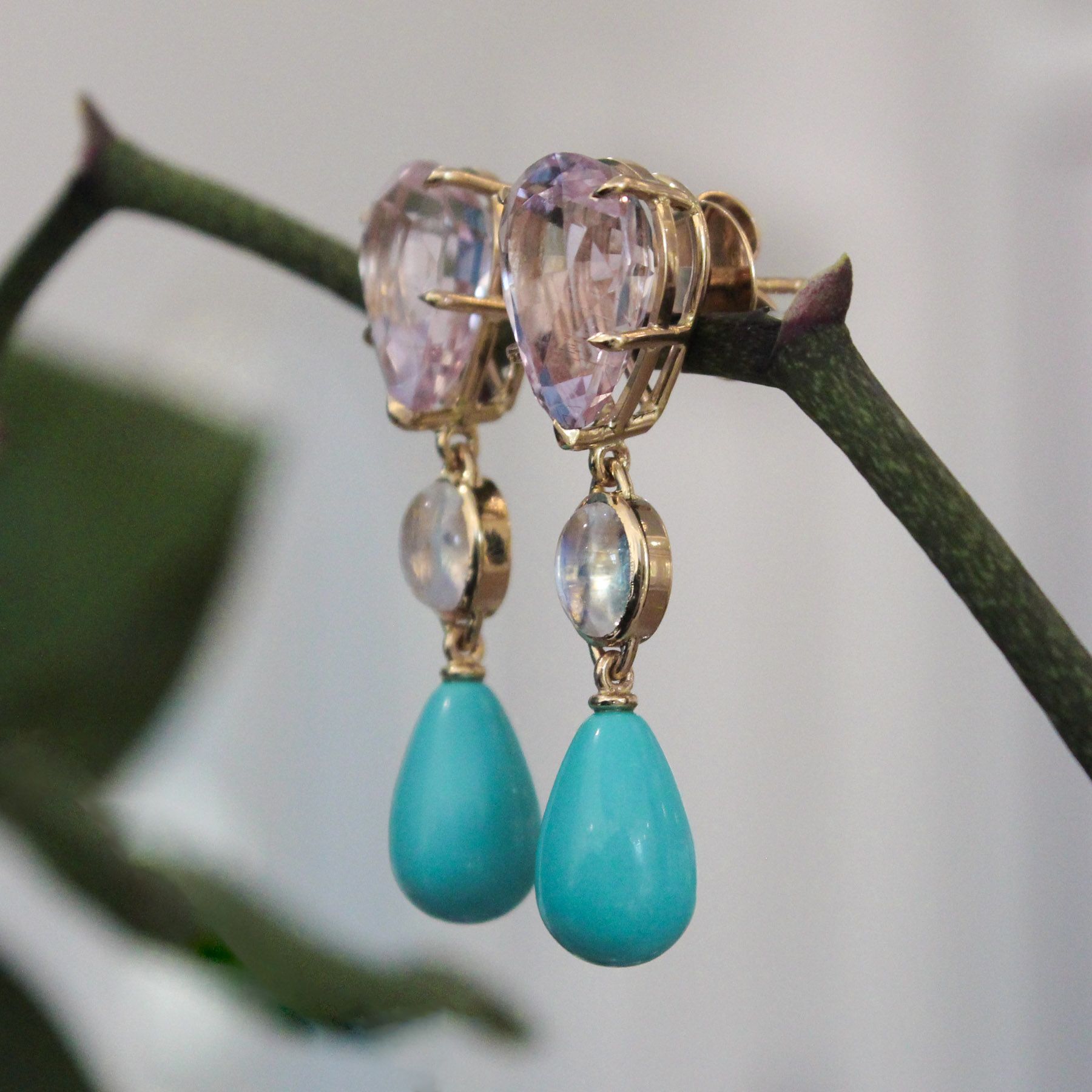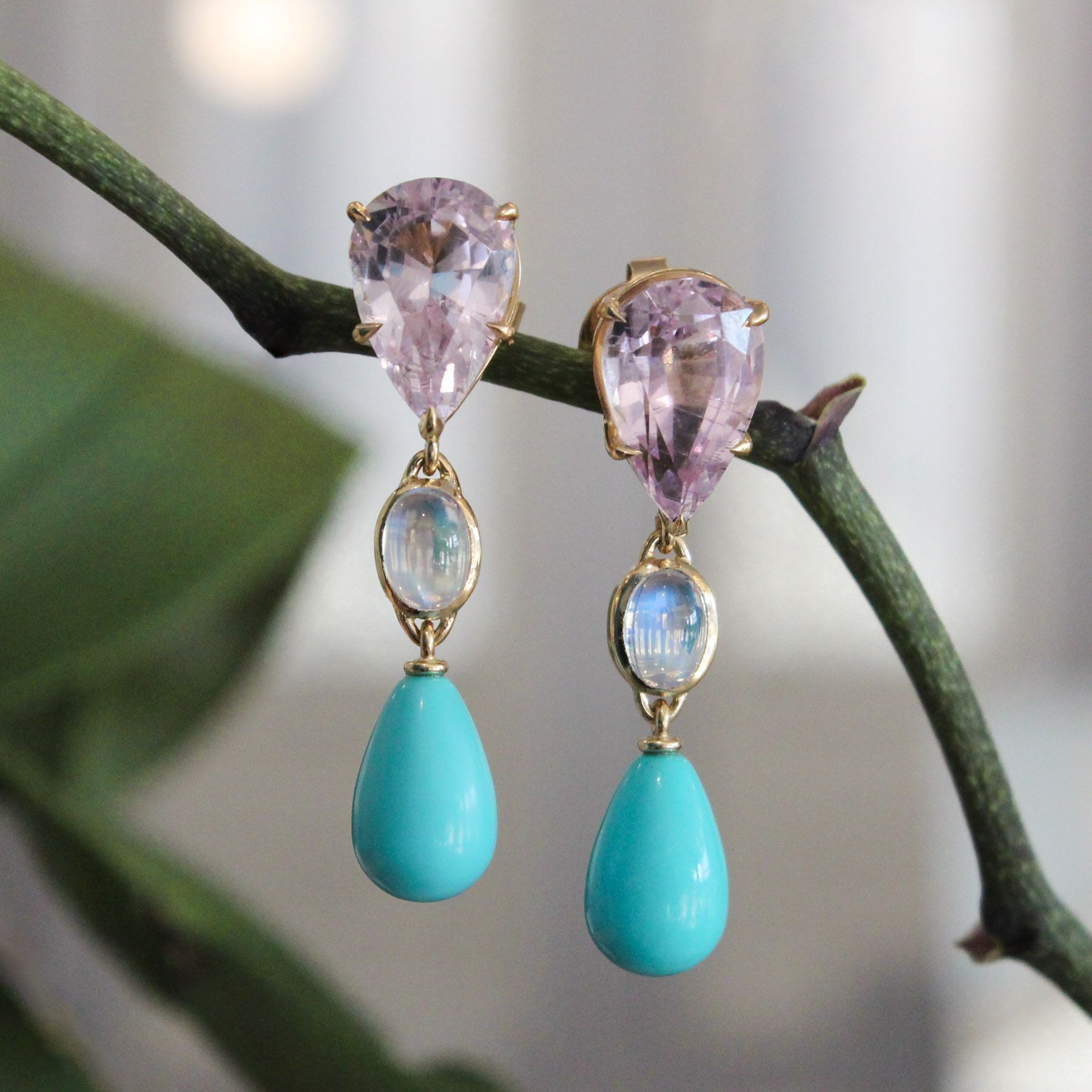18ky Kunzite, Moonstone & Turquoise Drop Earrings