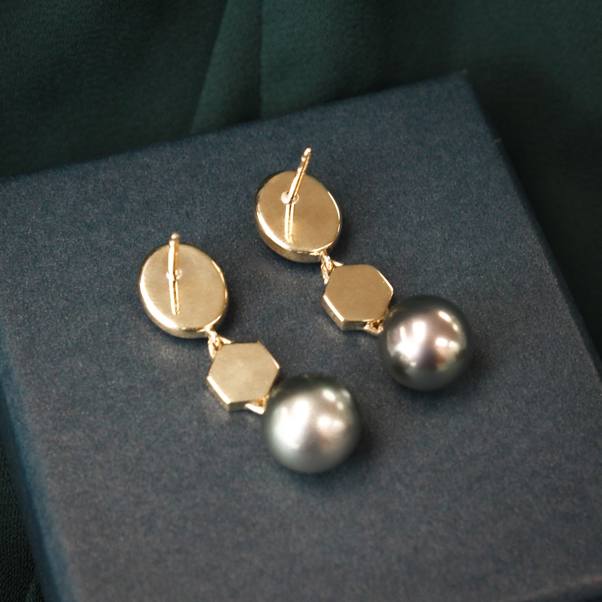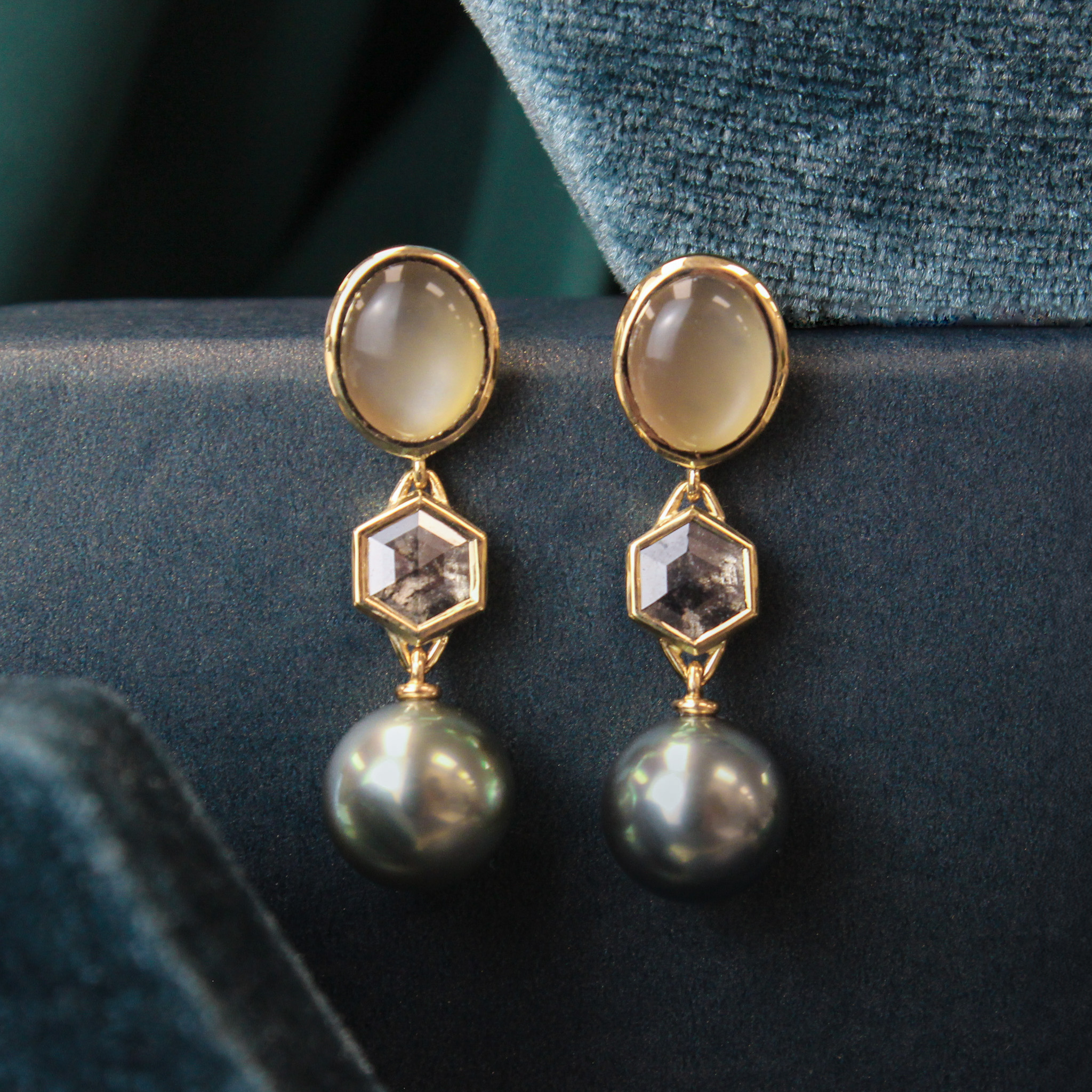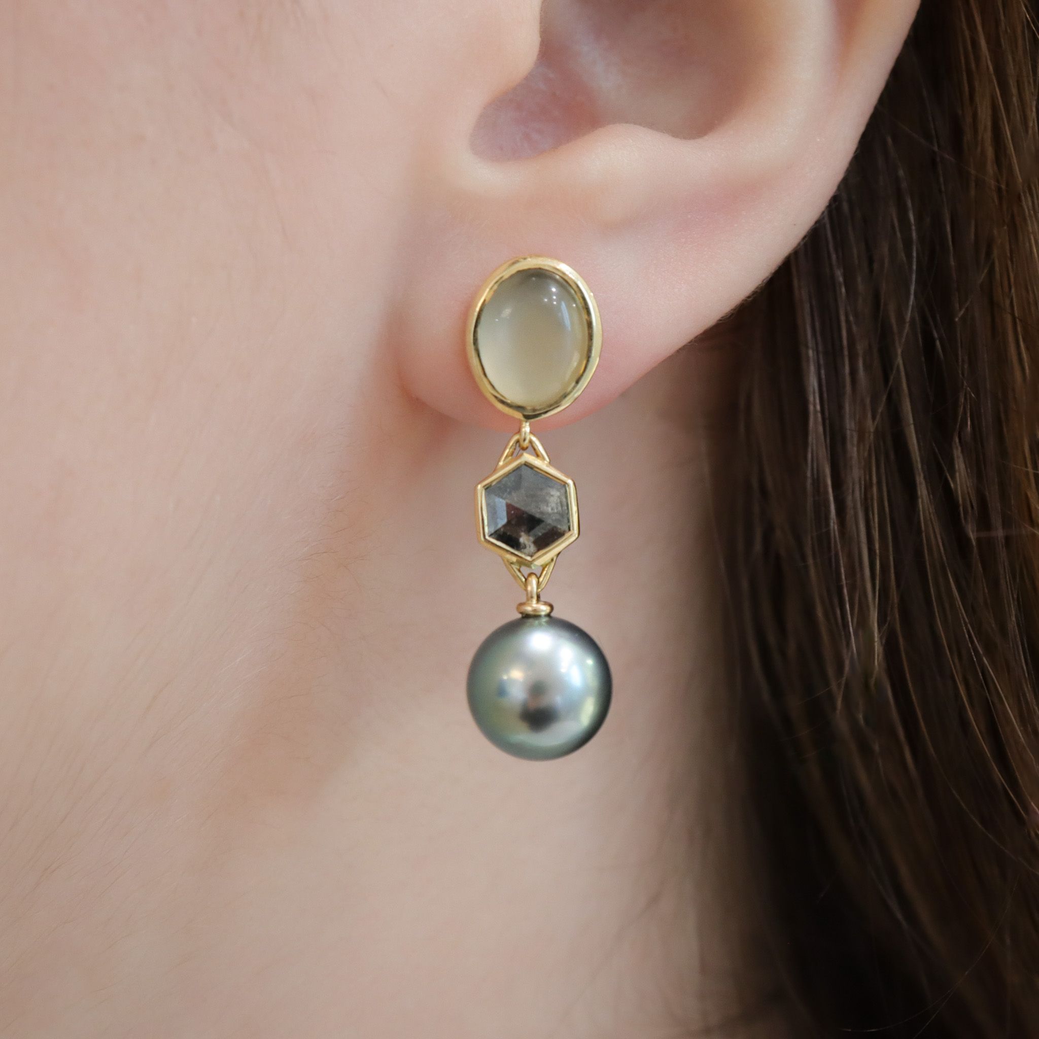 18ky Moonstone, Salt & Pepper Diamond, and Pearl Drops