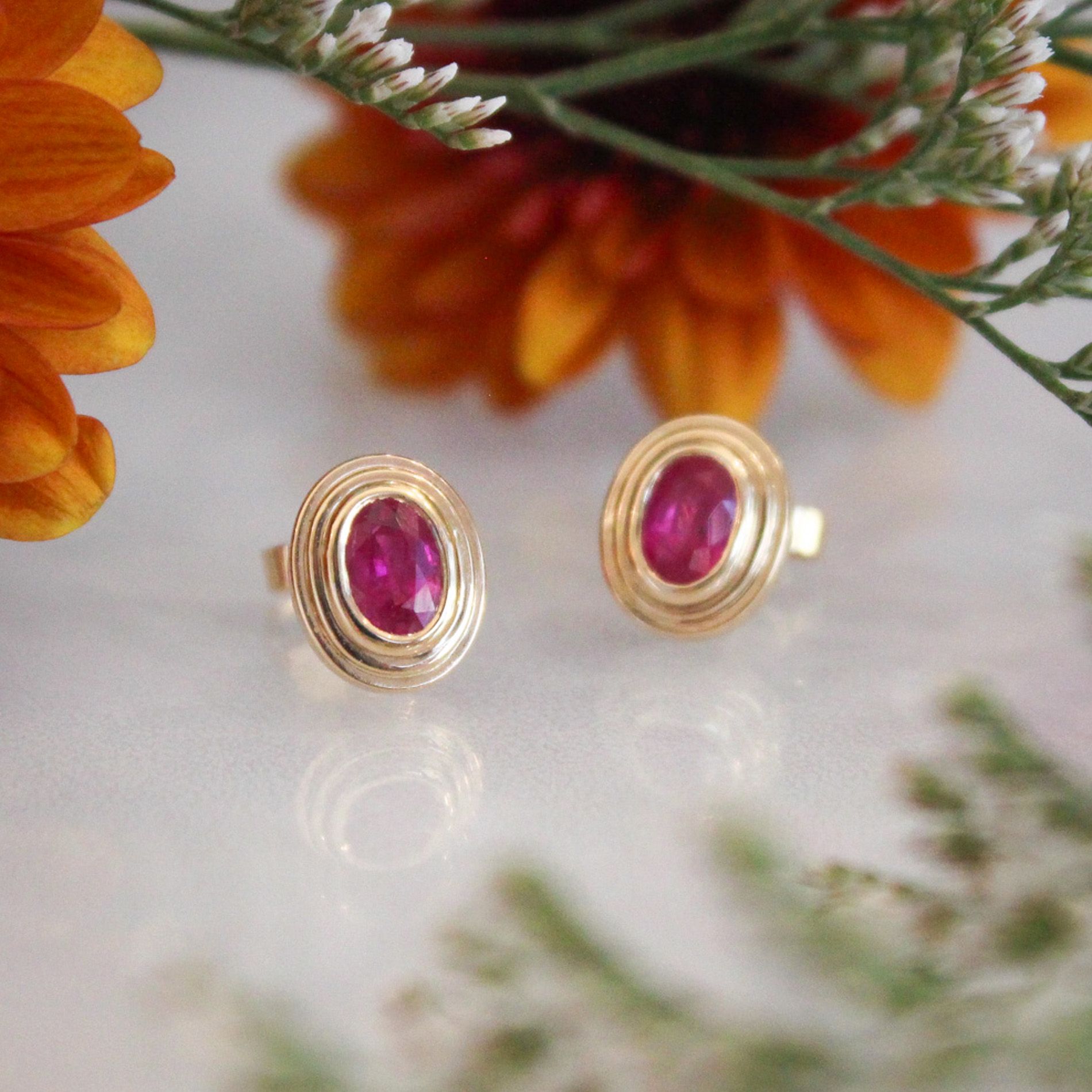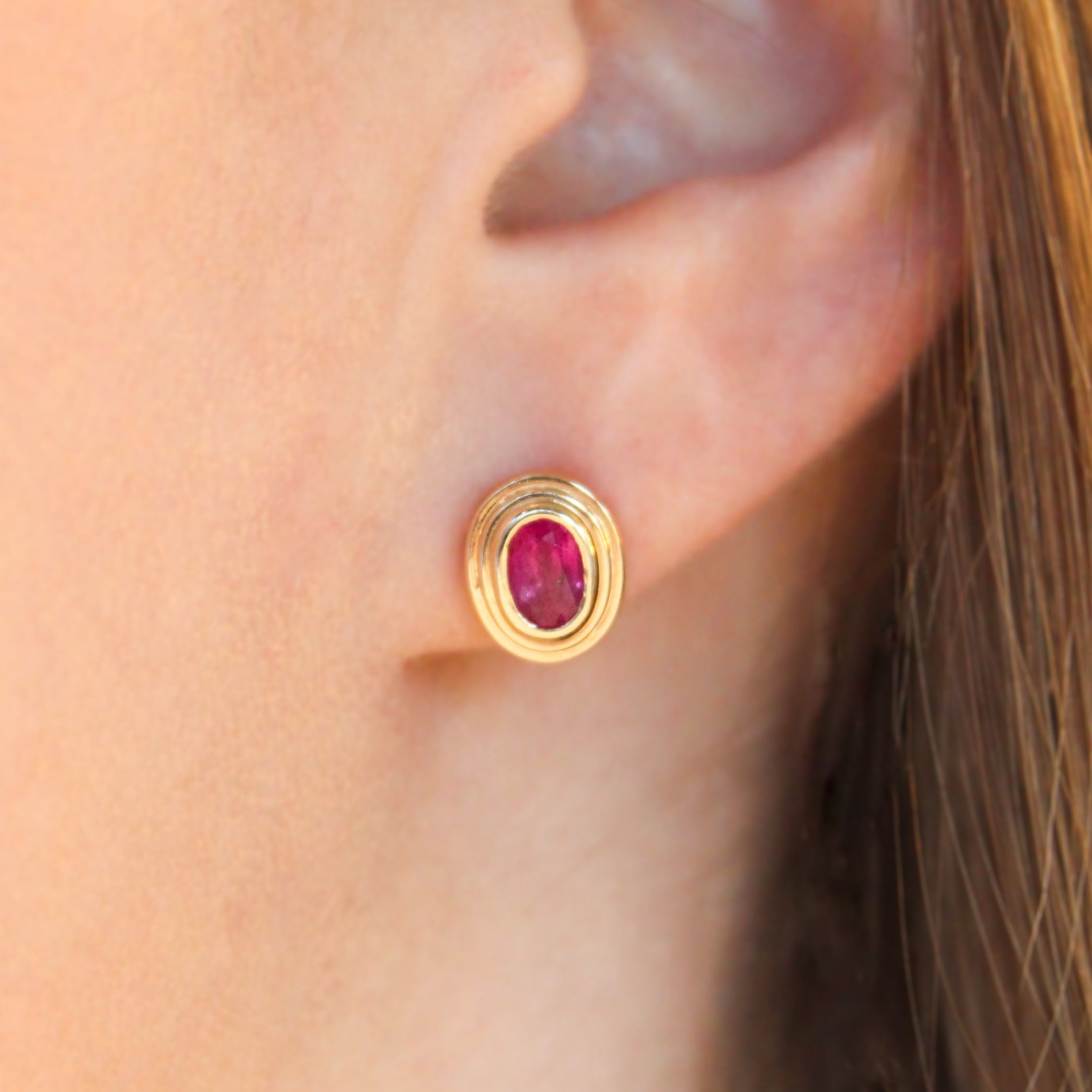 A vivid pair of oval brilliant-cut rubies are surrounded by 3 rings of buttery rich 18k gold, in these stud earrings. Set securely in a bezel, made to be sleek, comfortable, and easy for everyday wear.