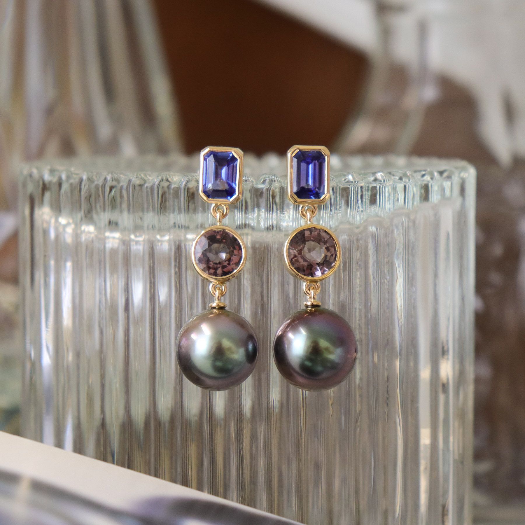 The pearls on this pair of drop earrings are mesmerizing! The shine with a sparking array of green, purple with hints of blue & pink. Paired perfectly with step cut sapphires & round brilliant cut lavender spinel. A lovely statement pair of dangle earrings.