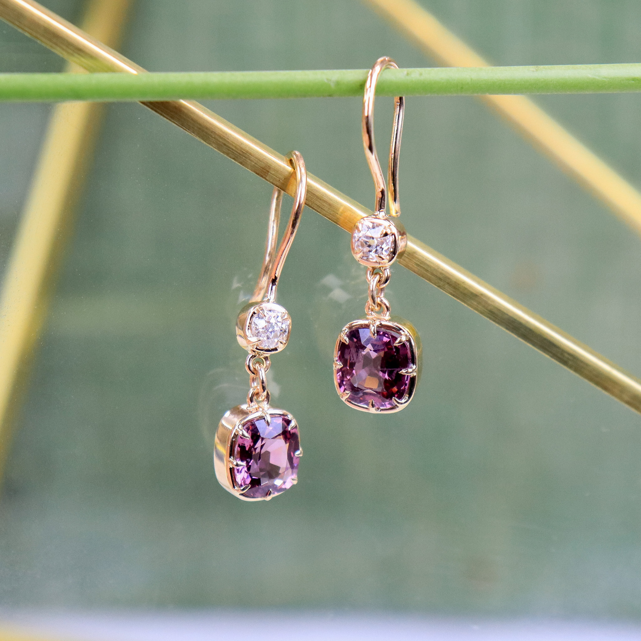 Lavender spinel & rescued old mine cut diamonds make a stunning pairing in these hook dangle earrings. Custom made Collet settings & talon claws add an antique feeling to these new earrings. The diamonds sparkle & spinels catch the light with lovely with flashes of pink, soft grey, lavender, and maroon colours with each movement of the head.