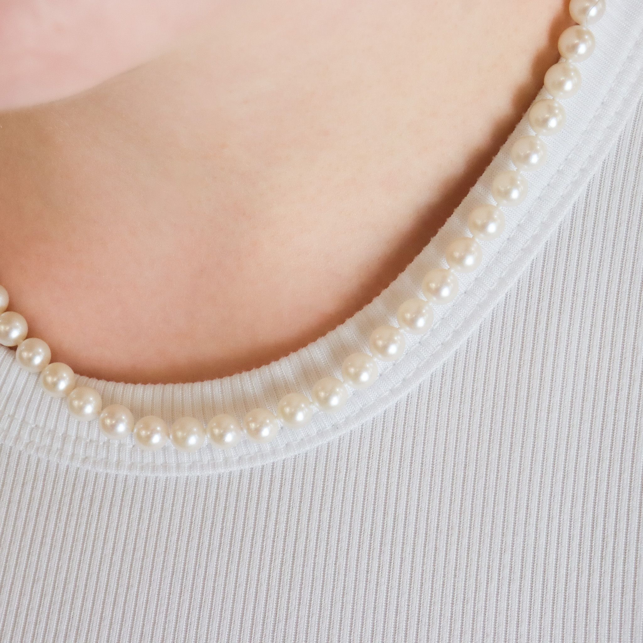 This lovely strand of cool-toned, pinkish white pearls are an absolute classic, and measuring at approximately 6.40mm in diameter.