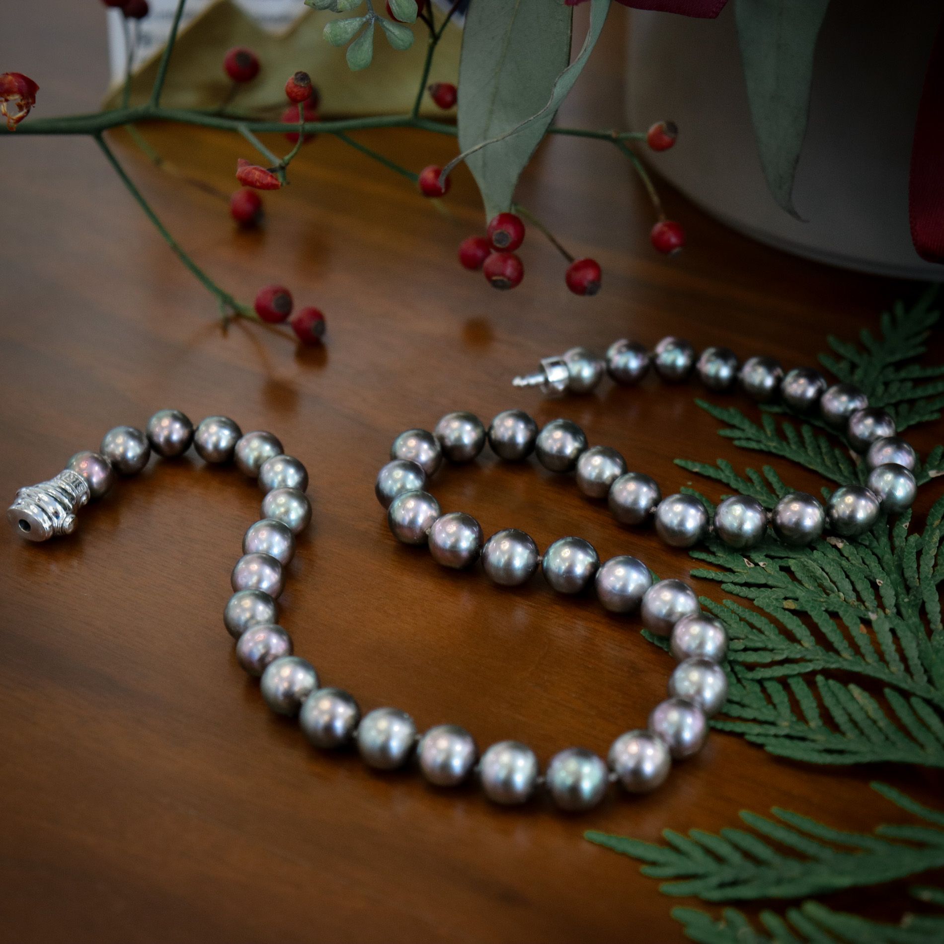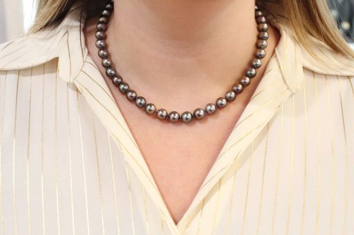 A eye catching strand of round peacock Tahitian pearls, with an 18k white gold button-style clasp. These pearls are a deep black colour with overtone lustre of pink, purple, green & blue. A contemporary take on the classic pearl strand. We love the button clasp for it's ease of use. A truly wearable jewellery staple.
