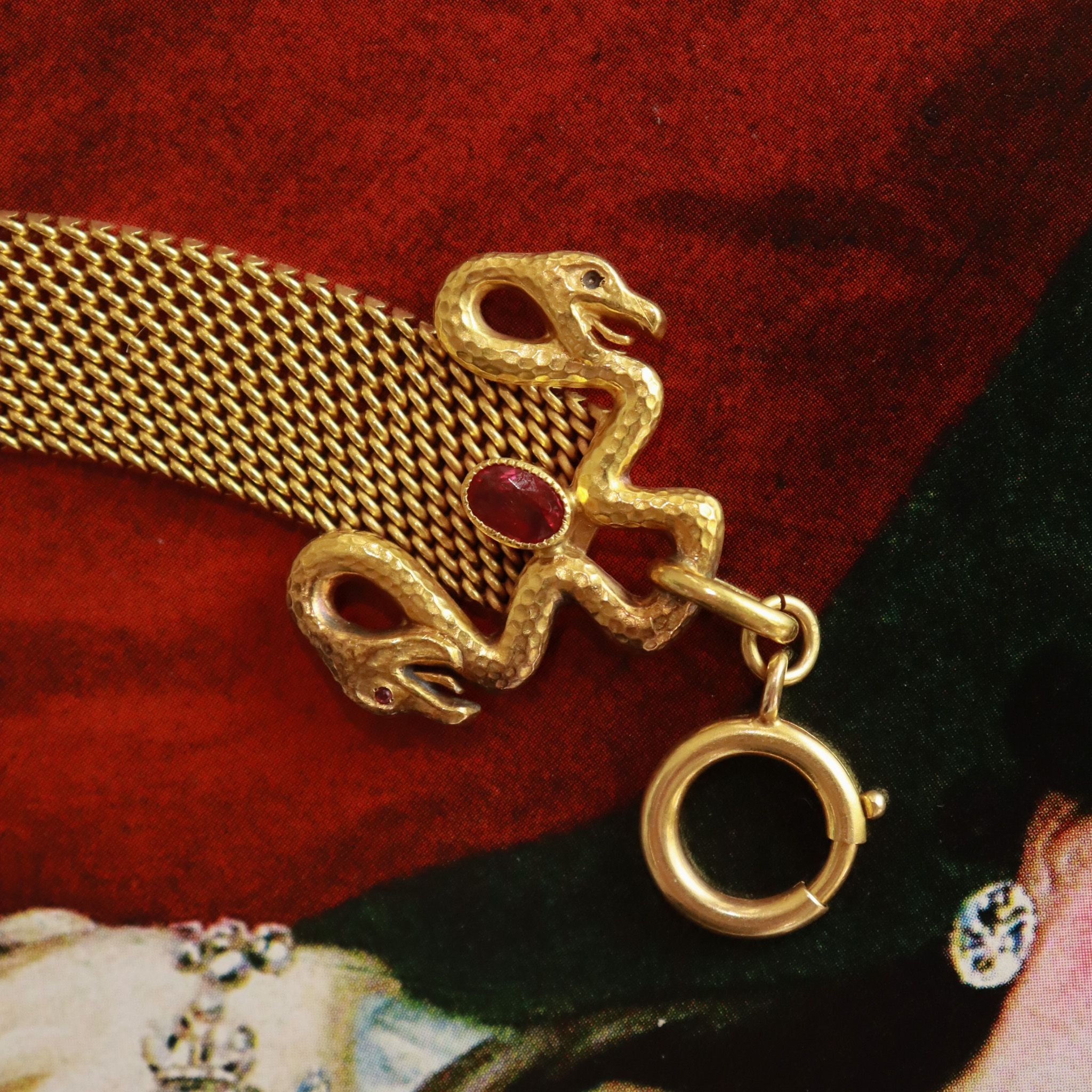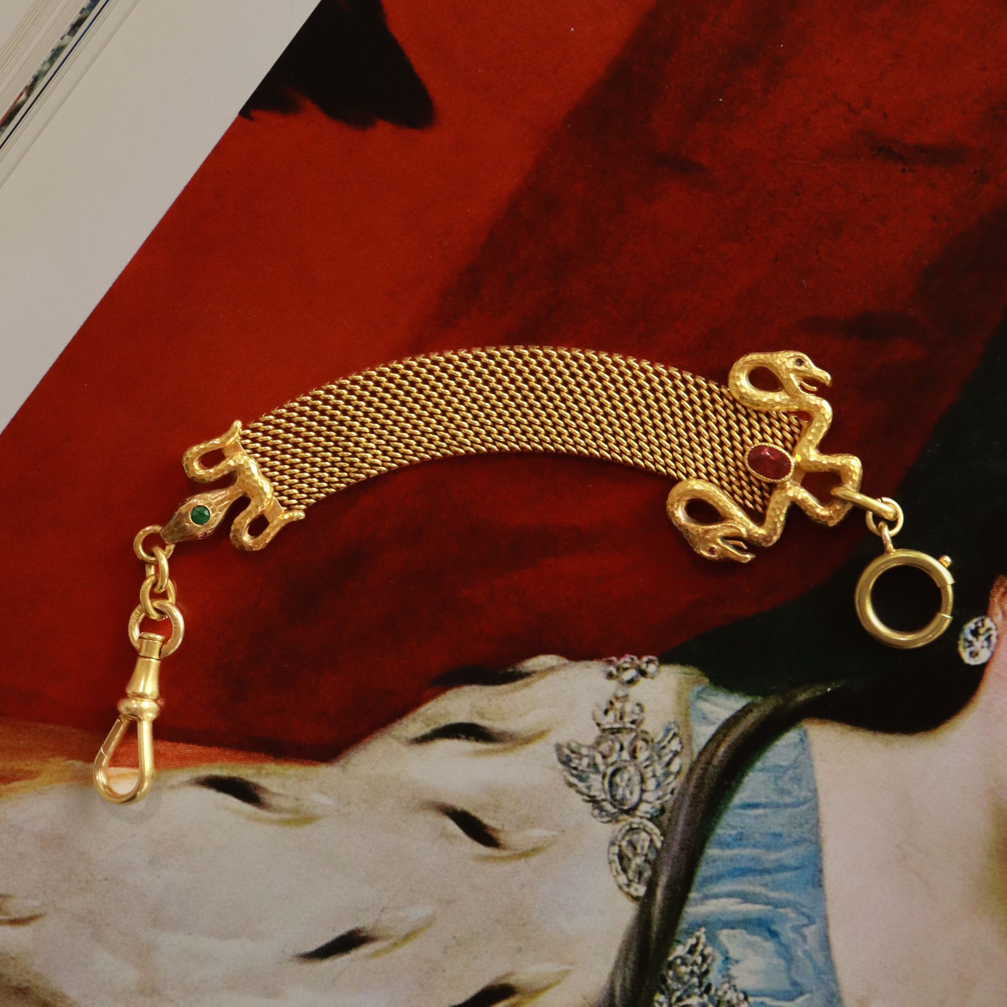 A true showcase of the skill in this antique hand fabricated fob chain. This once adorned the chatelaine chain of a Victorian lady, carrying personalized monogrammed fobs for sealing notes & love letters. The three snakes are crafted from 18k yellow gold, adorned with a ruby & emerald, joined together by a hand made 22k chain. We envision this being a paired with an extender chain and worn as a bracelet - or added to an antique chain adorned with charms. The genius of the double clasp ends make this a versatile one of a kind find.