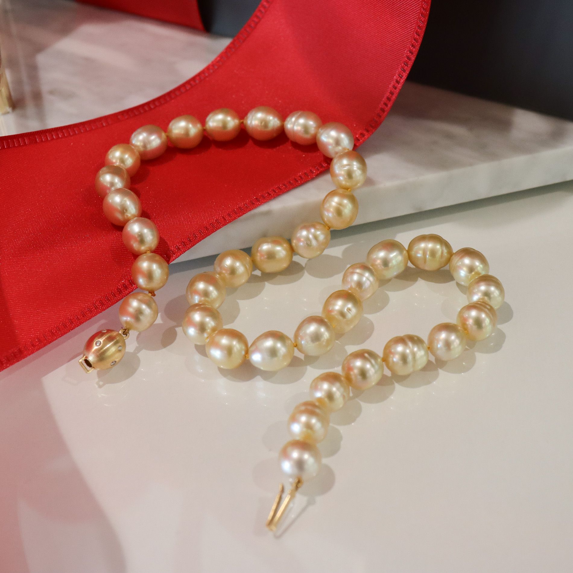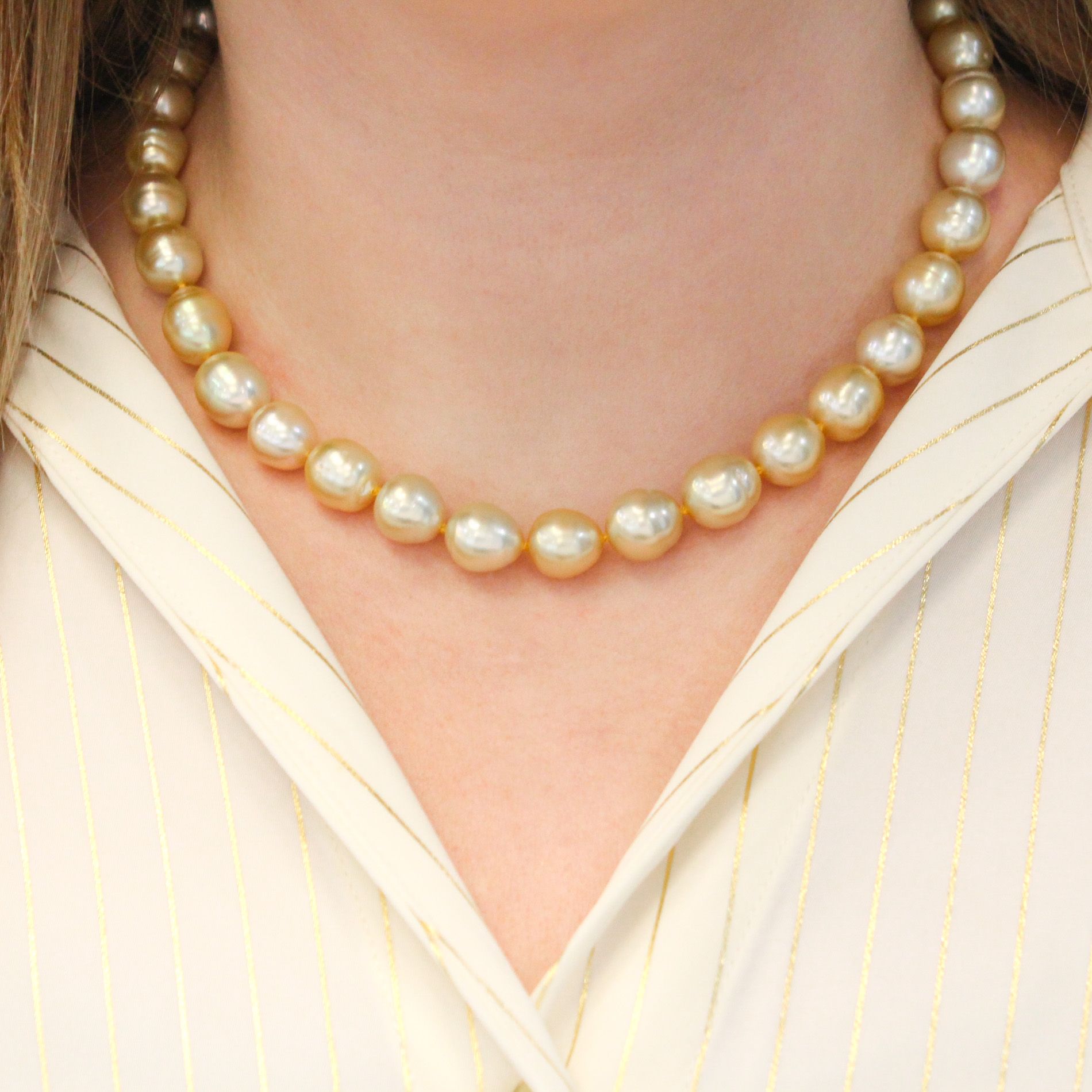 One strand of Golden South Sea Baroque pearls, with a matching oval diamond clasp. By German designer J. Köhle Pforzheim, sold by Birks.