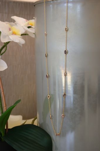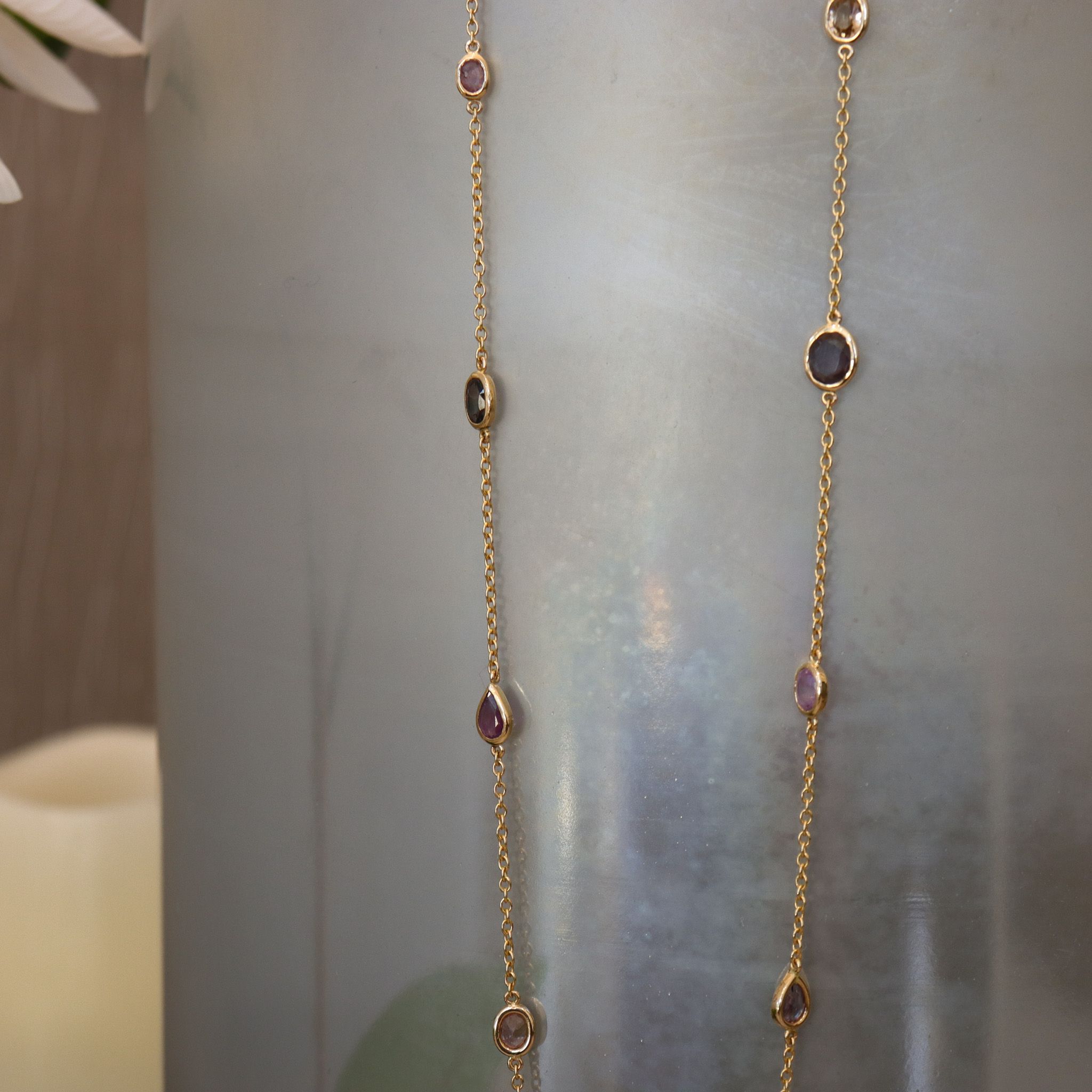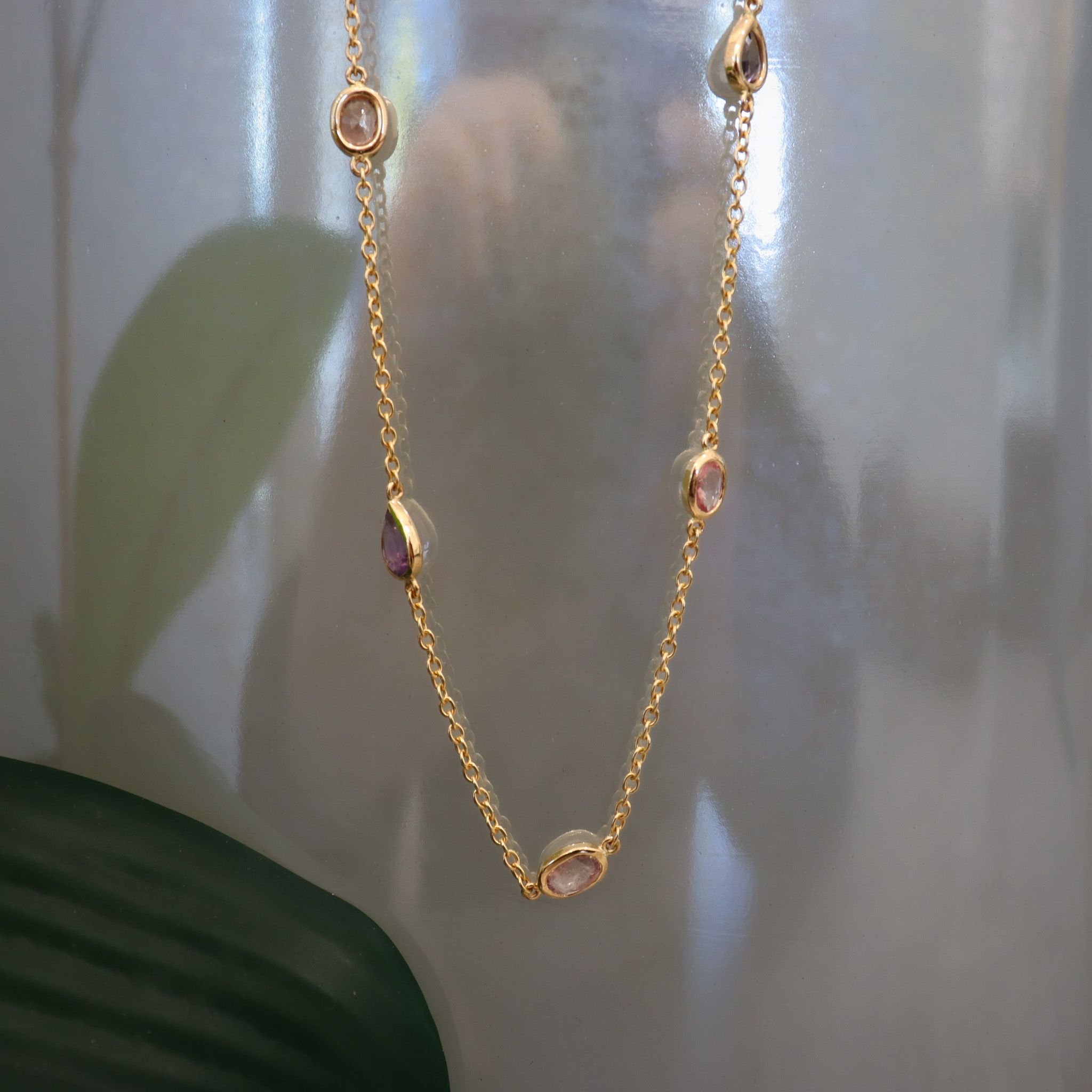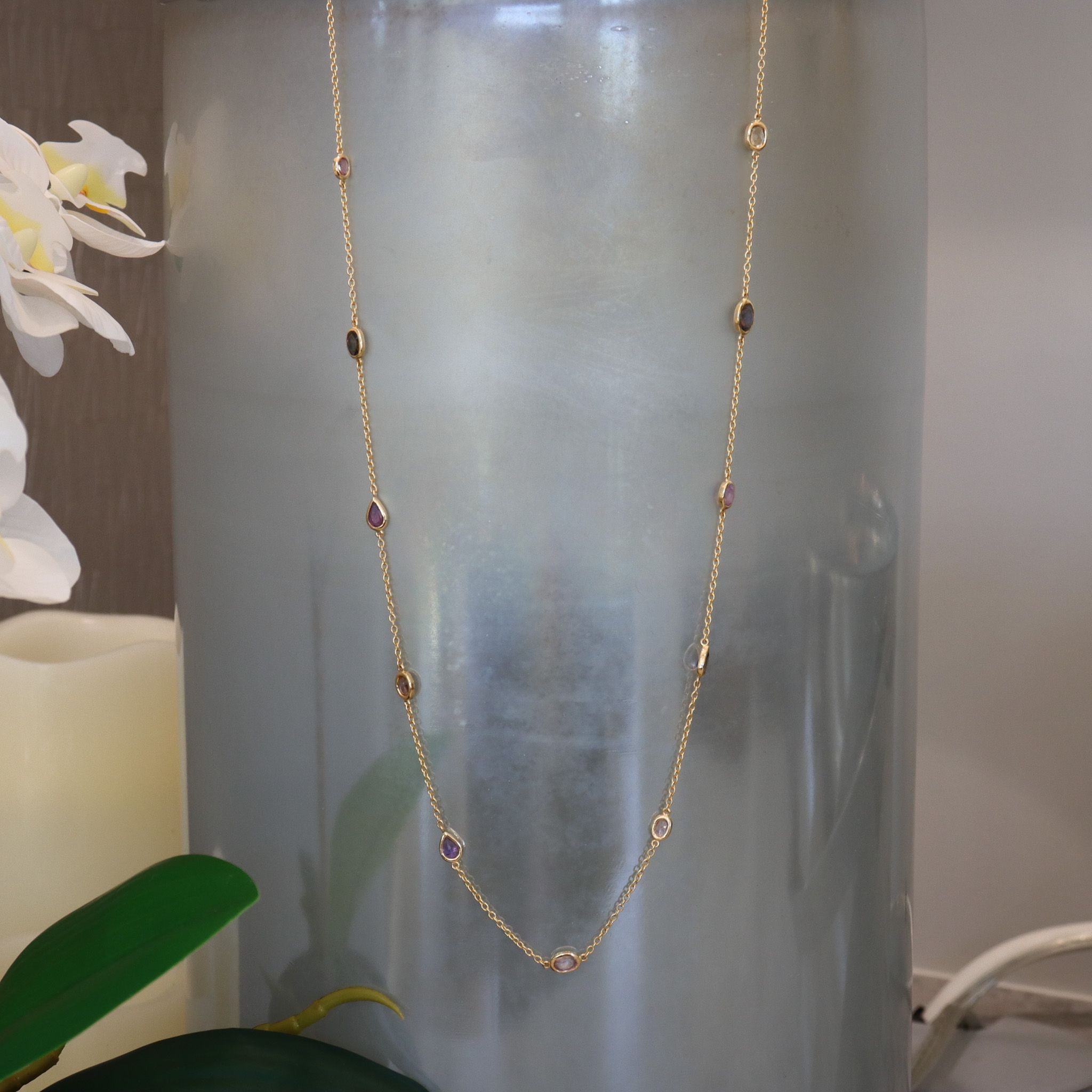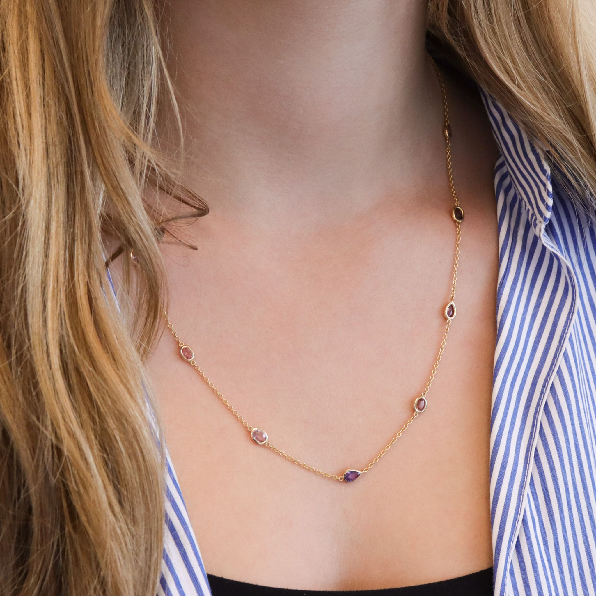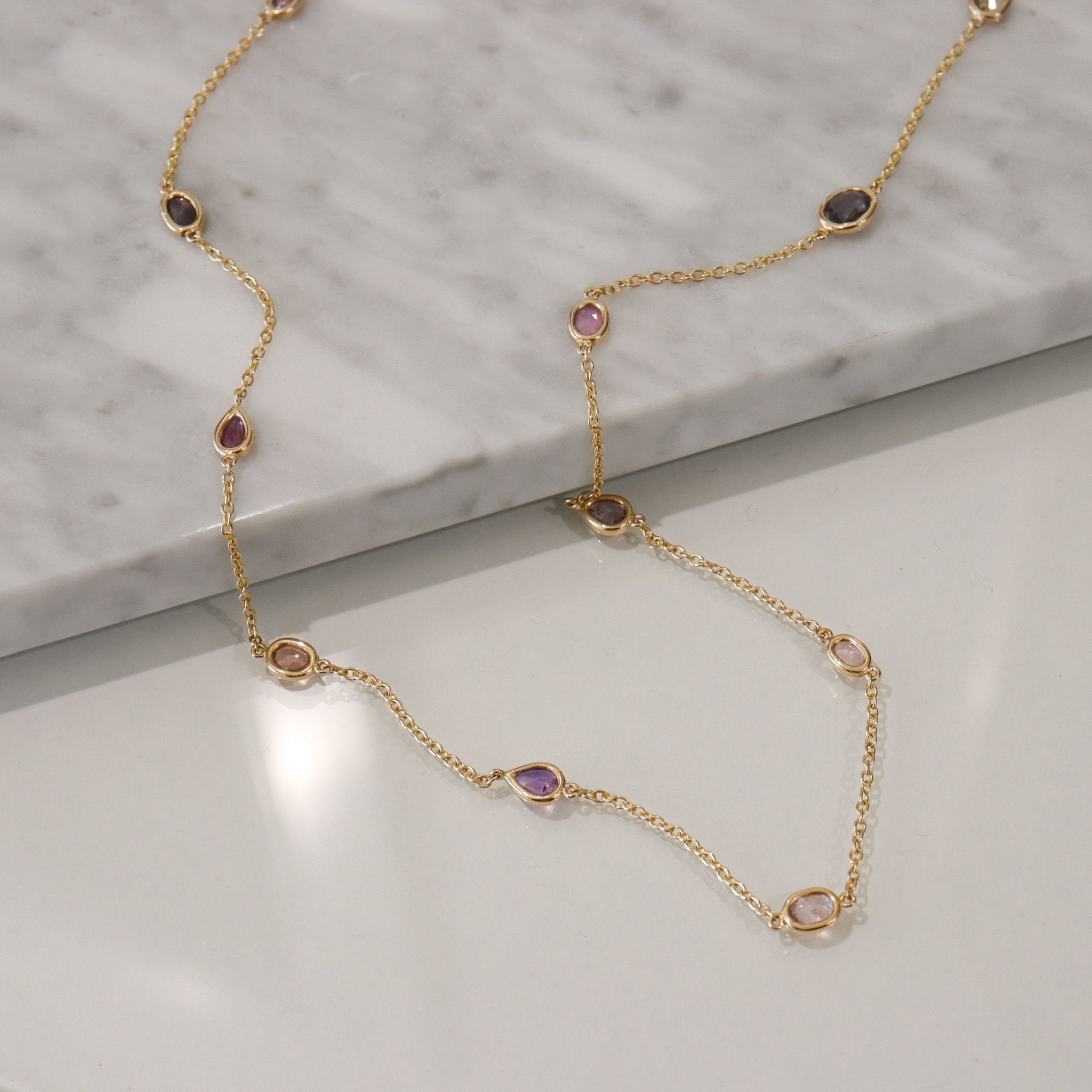 Adorn your neck with this gorgeous collection of natural, fancy-colour sapphires encased in hand-fabricated 18k yellow gold bezels. Ranging from extremely light green, to dark purple, light to medium pink, purplish pink and light orangey pink colour, their eye clean clarity are sure to dazzle.