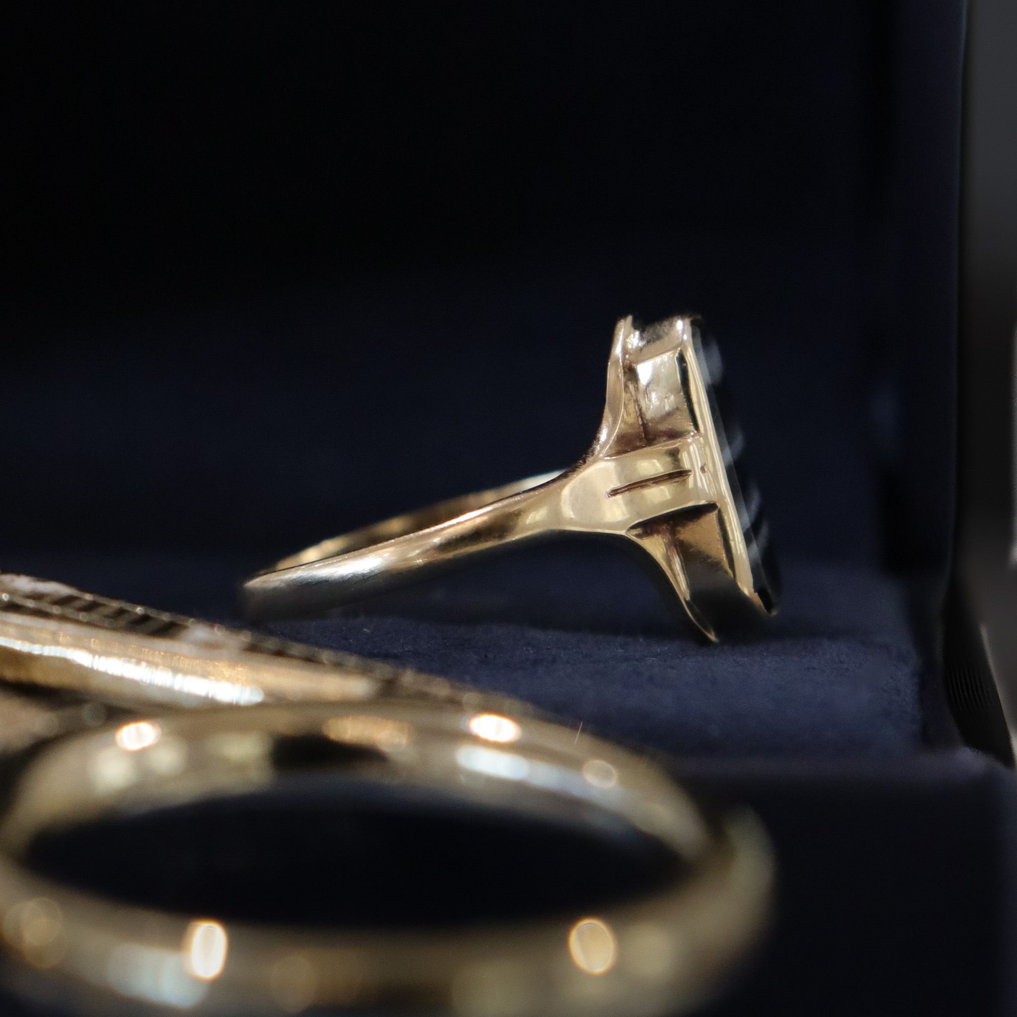 During this Era platinum and precious metals were once again rationed for the war effort. Making yellow gold the metal choice of the time. Various alloys were used to create thinner sheets of metal which gave jewellers a chance to experiment with new finishing techniques. With these new alloys came various shades of gold, sometimes seen in a single piece. Gemstones were also in short supply meaning a lot of pieces were made with more metal versus housing gemstones. Less expensive stones became more popular including topaz, amethyst, aquamarine and citrine. Diamonds were reserved for the use of pave settings and as accent stones. It was not uncommon during this time to commission a bespoke piece using metals and gemstones already owned.