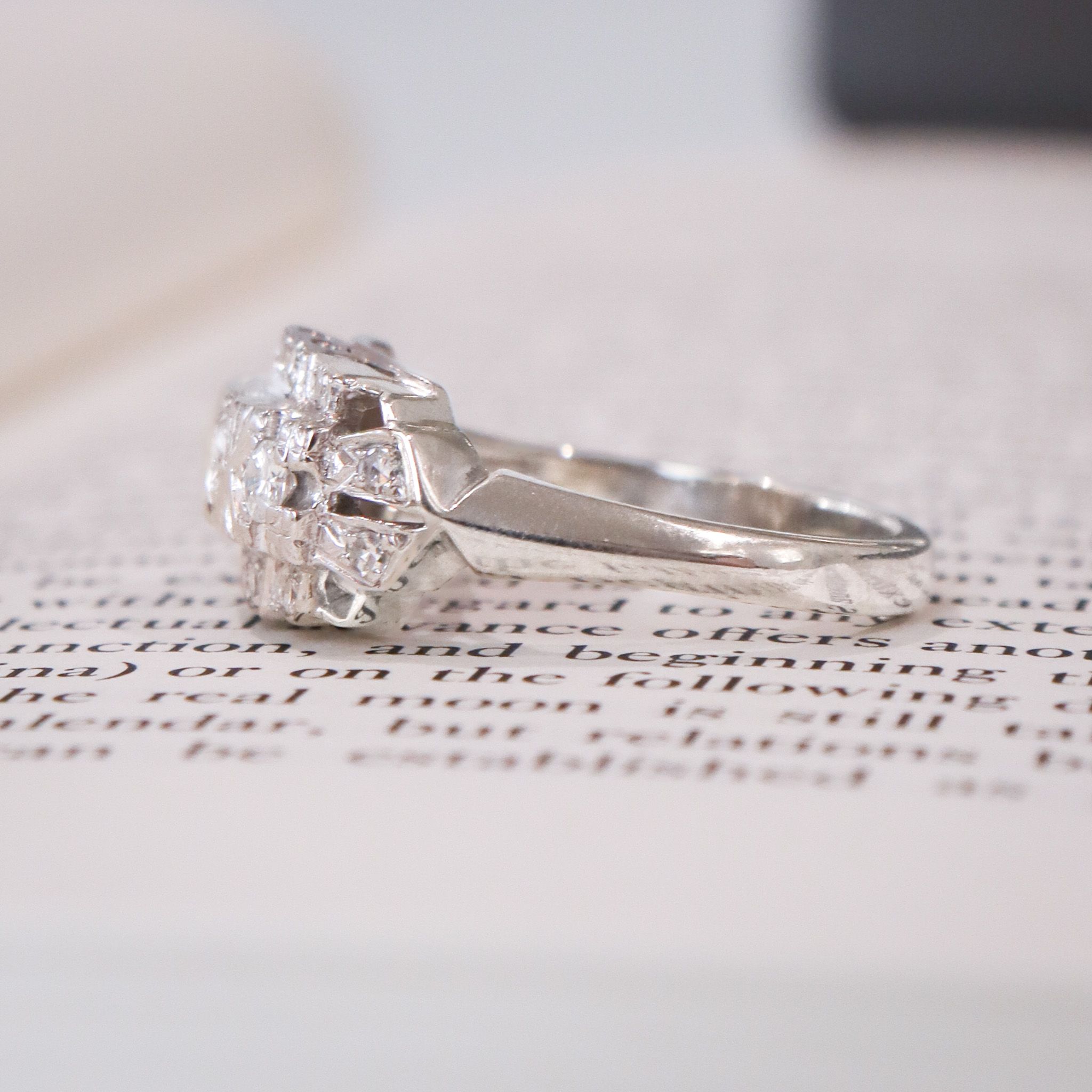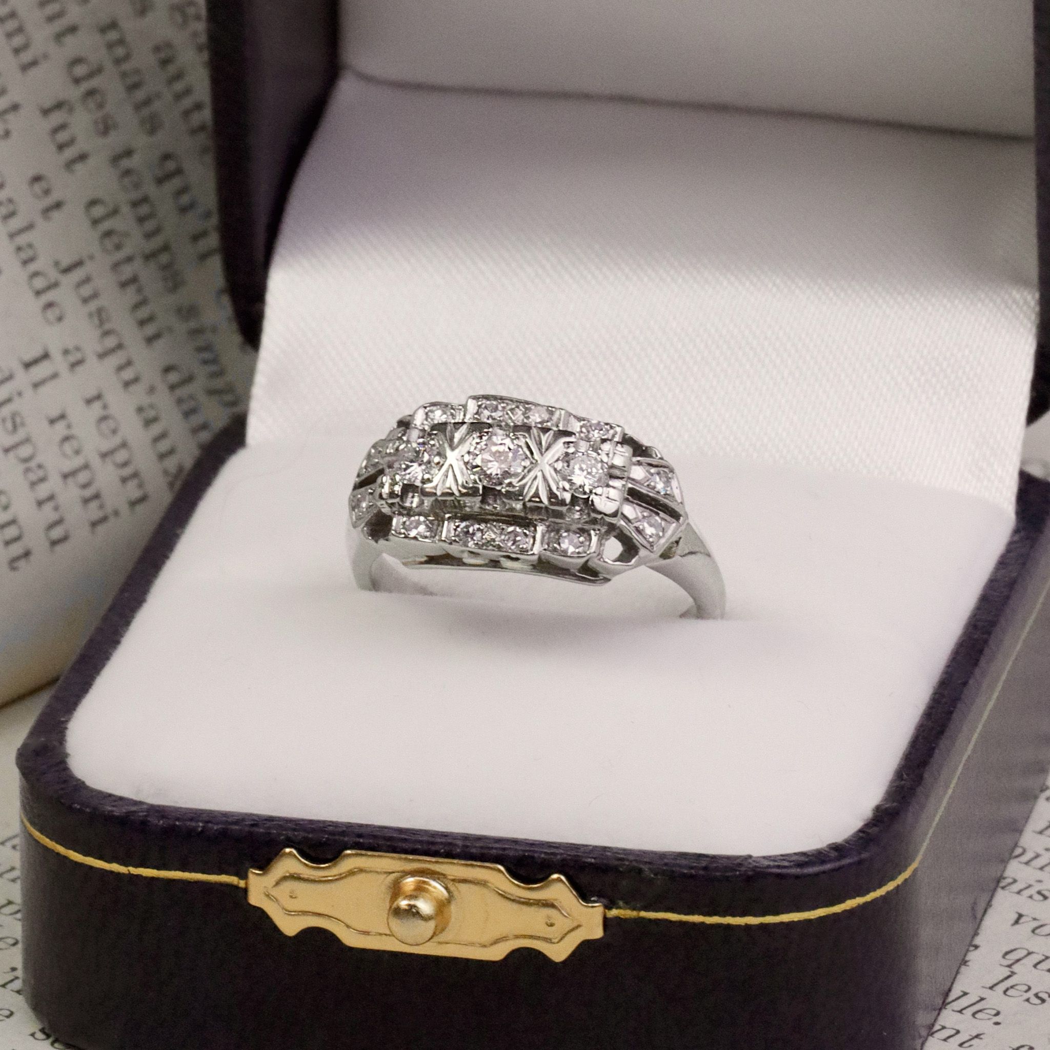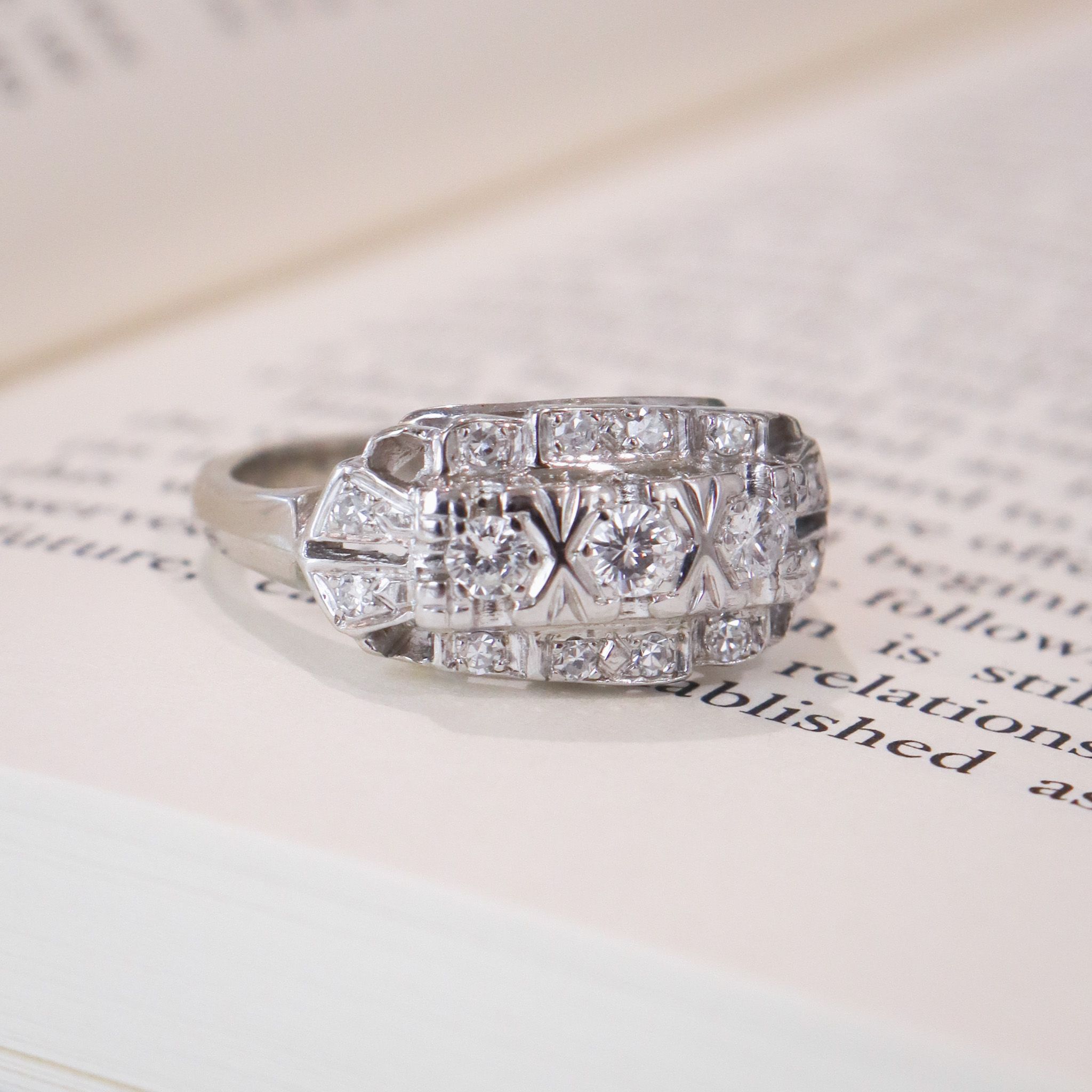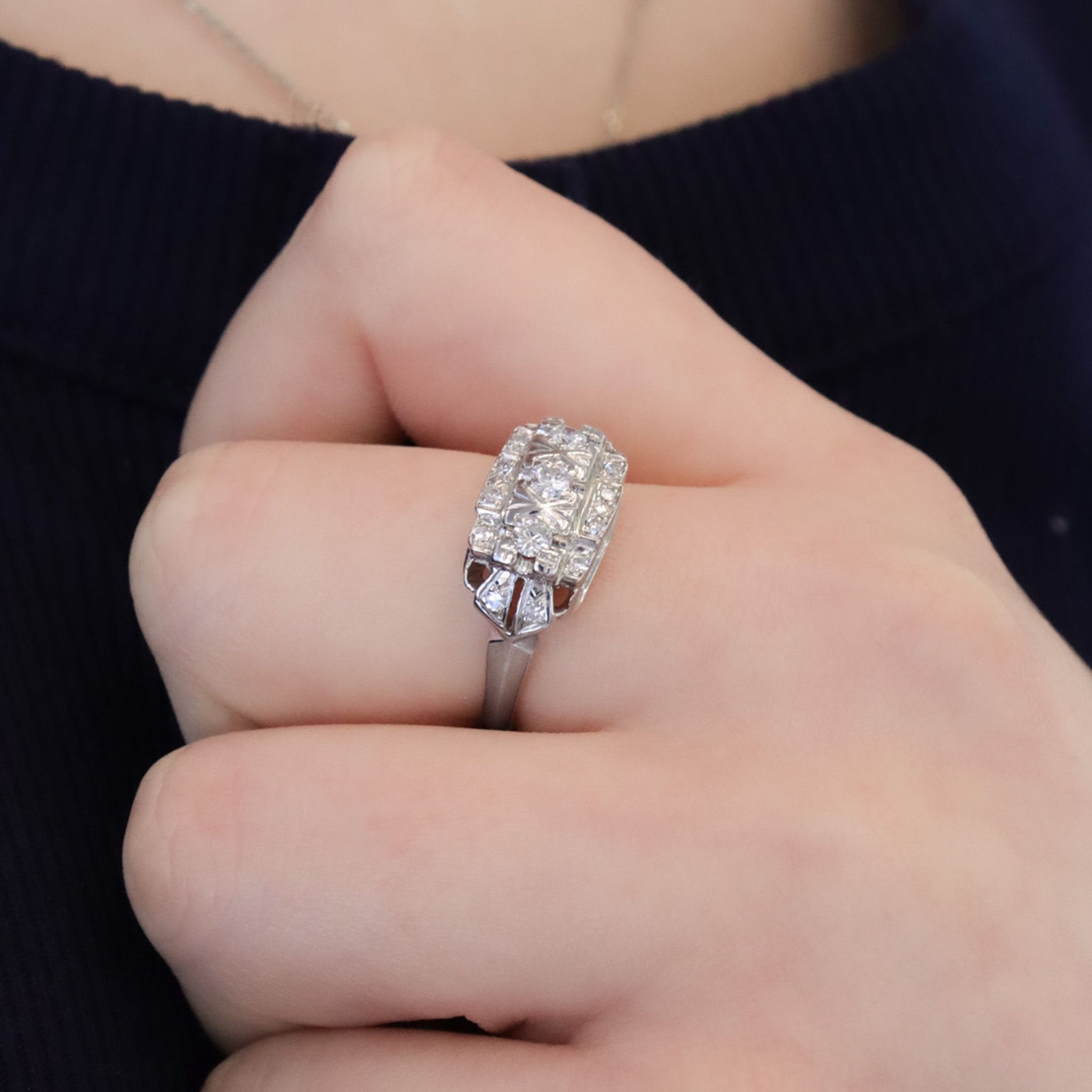 In a post war world, people looked toward fun and lighthearted motives such as animals, insects and flowers to keep peoples spirits up. The era was also a revival for centre stones in engagement rings, most popularly using the marquise cut with diamond.