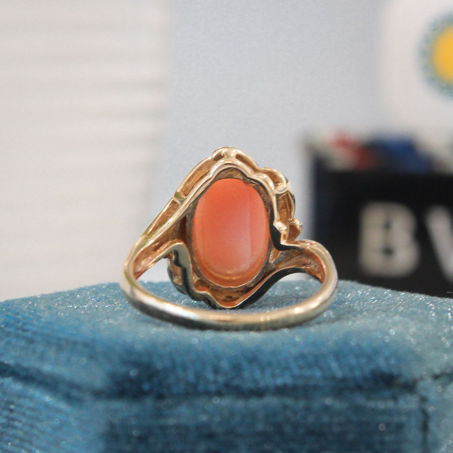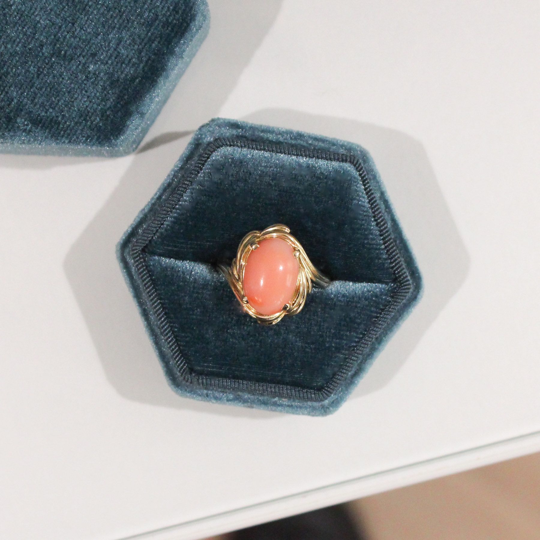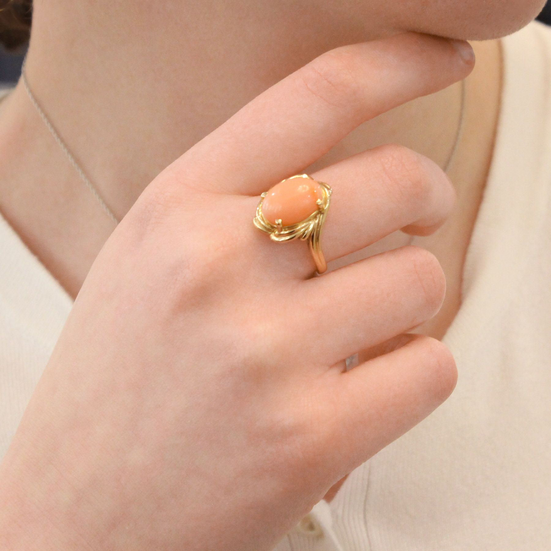 Soft waves of gold encircle this gorgeous peachy coral, set in 14k yellow gold. The warm tones of this ring are just so lovely.
