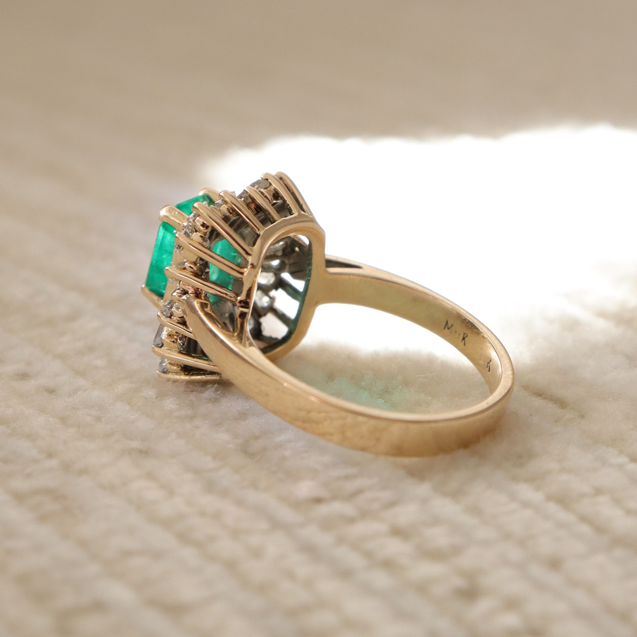 This natural emerald is surrounded by a dazzling tutu of tapered baguette diamonds. Set in 14k yellow gold, this retro beauty is certainly a conversation starter and ready for it's next chapter.
