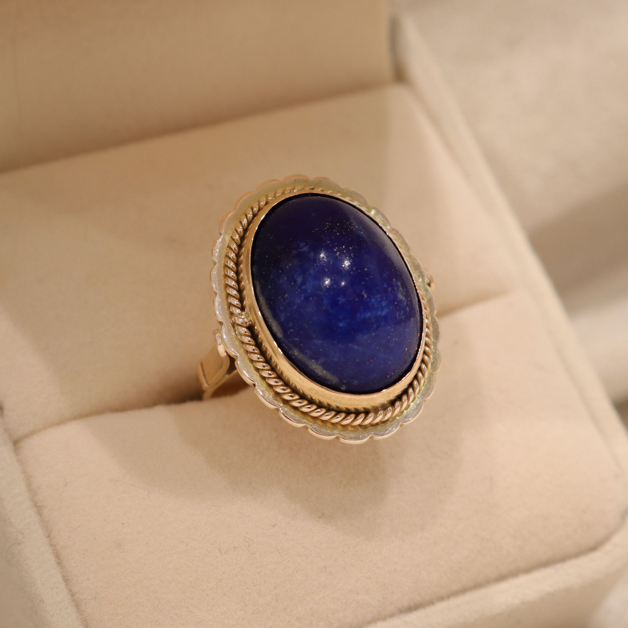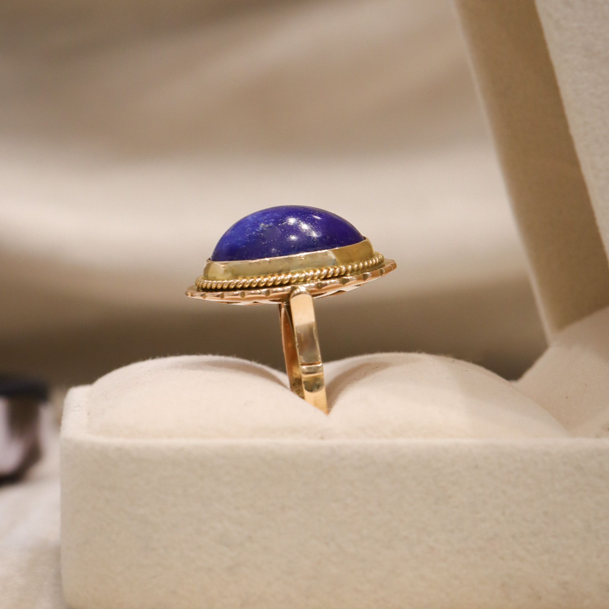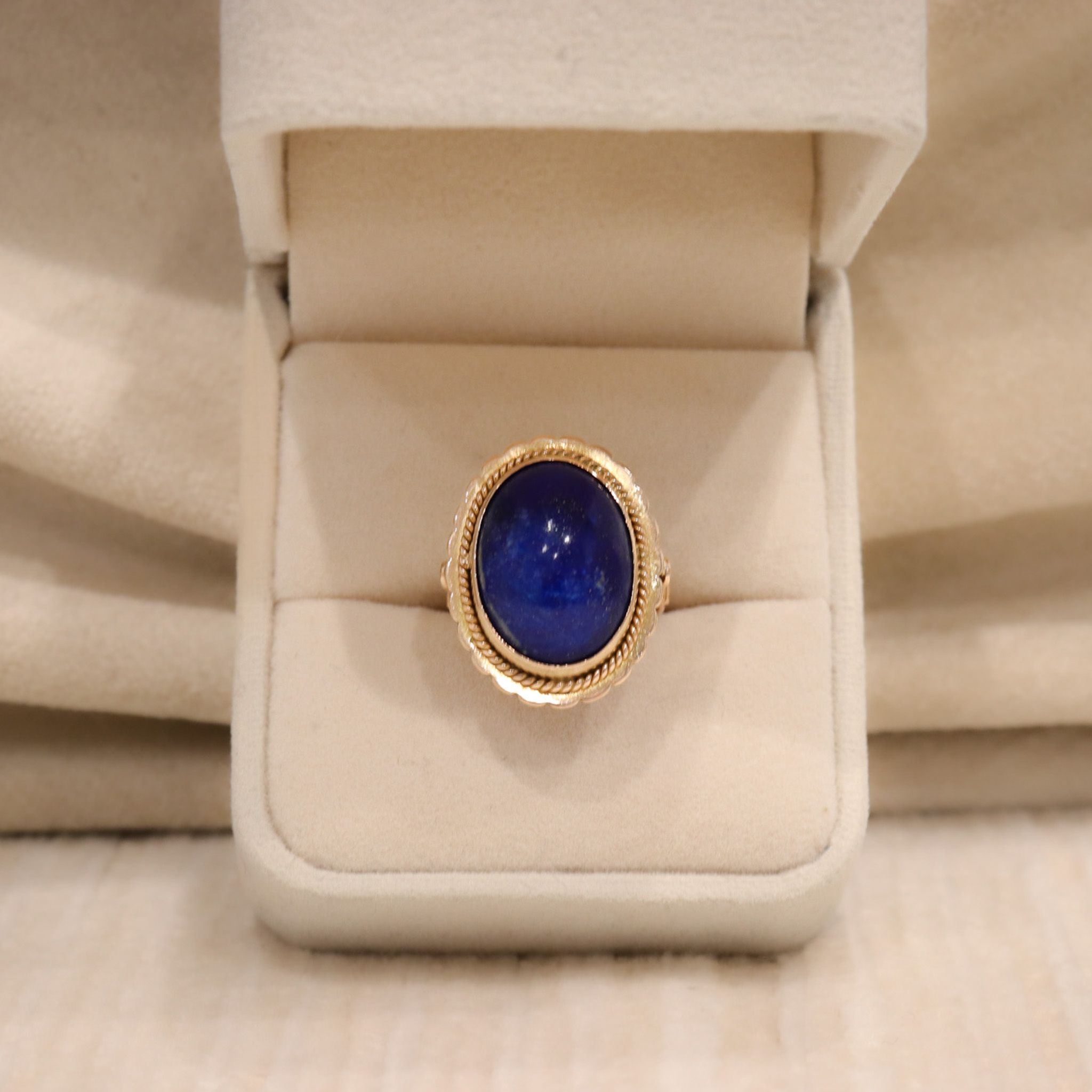 Woven gold wraps around a rich blue lapis, accentuating the sparkling gold flecks in the stone. This classic retro ring is great for stacking with other bands, or wearing as a standalone piece.