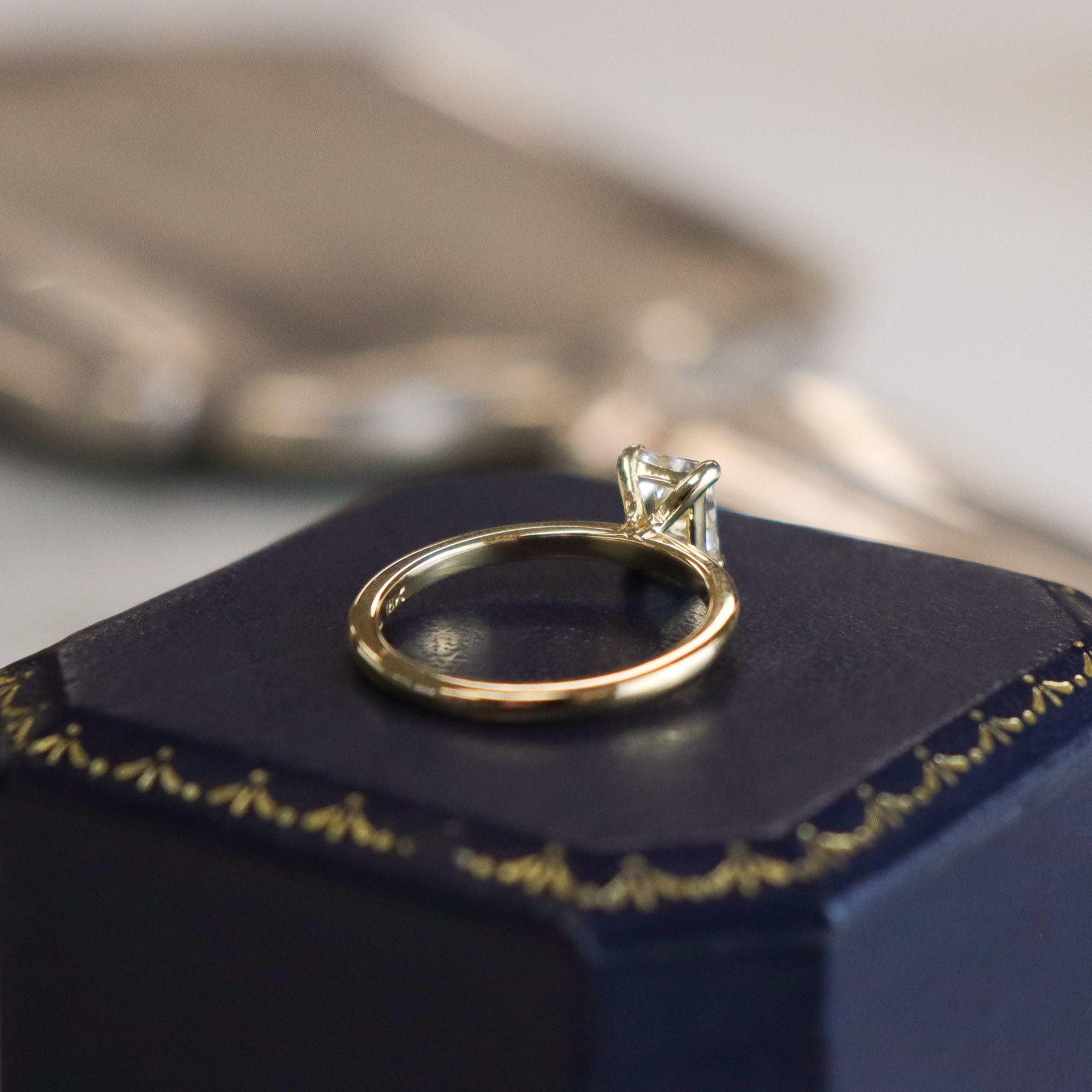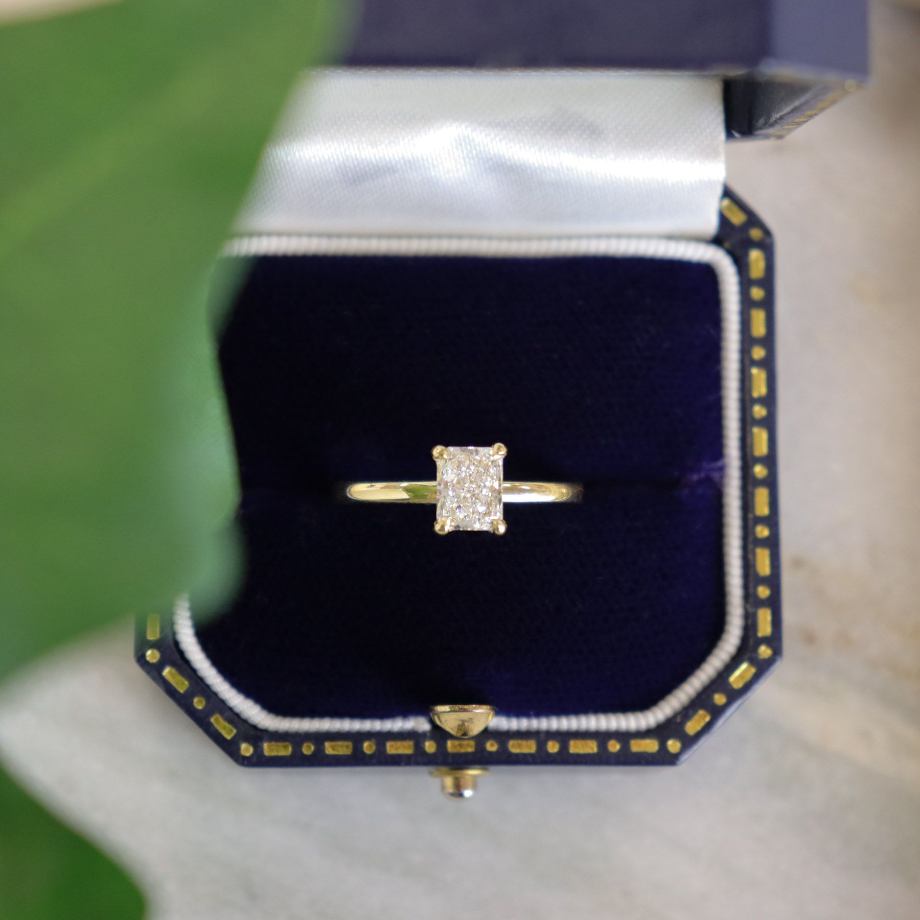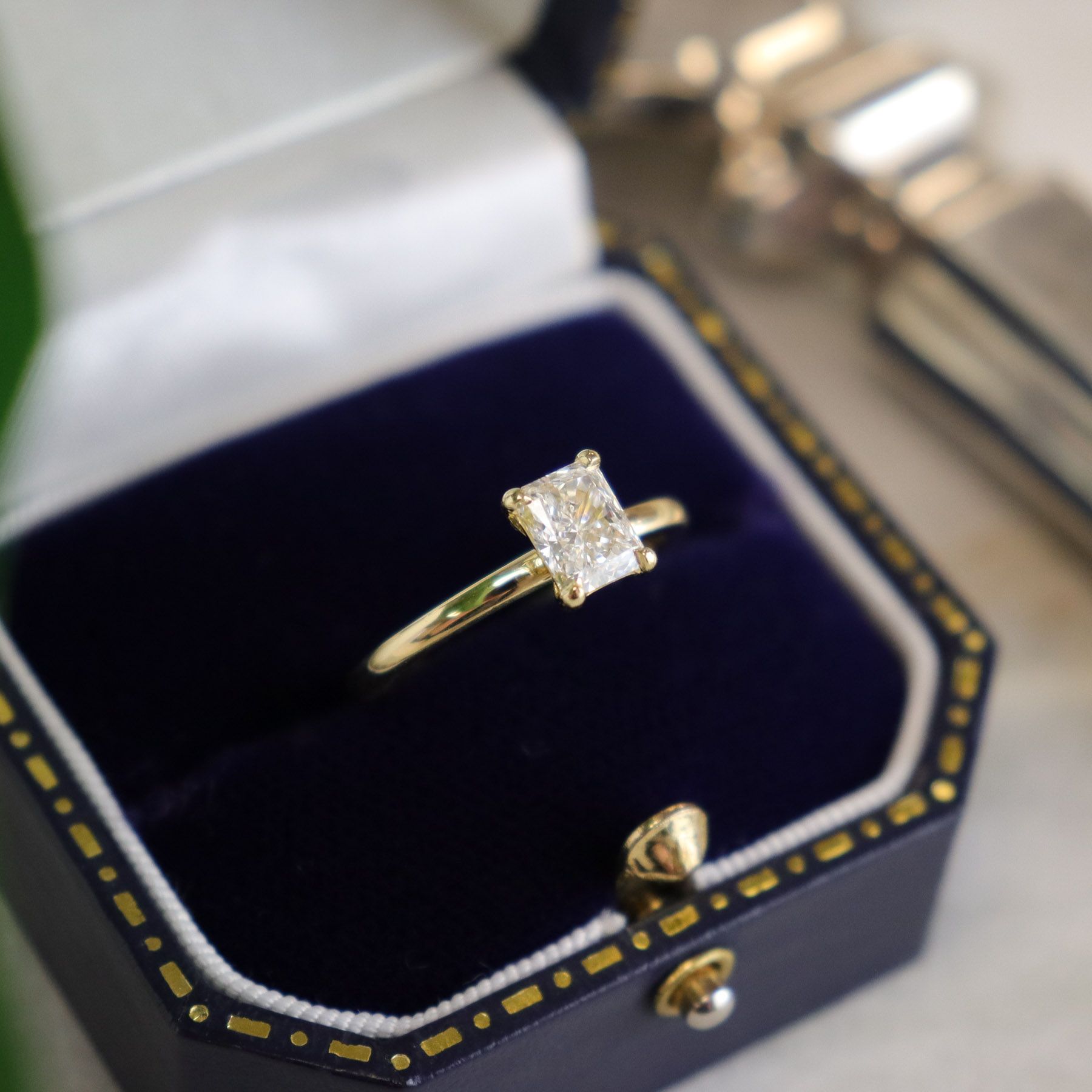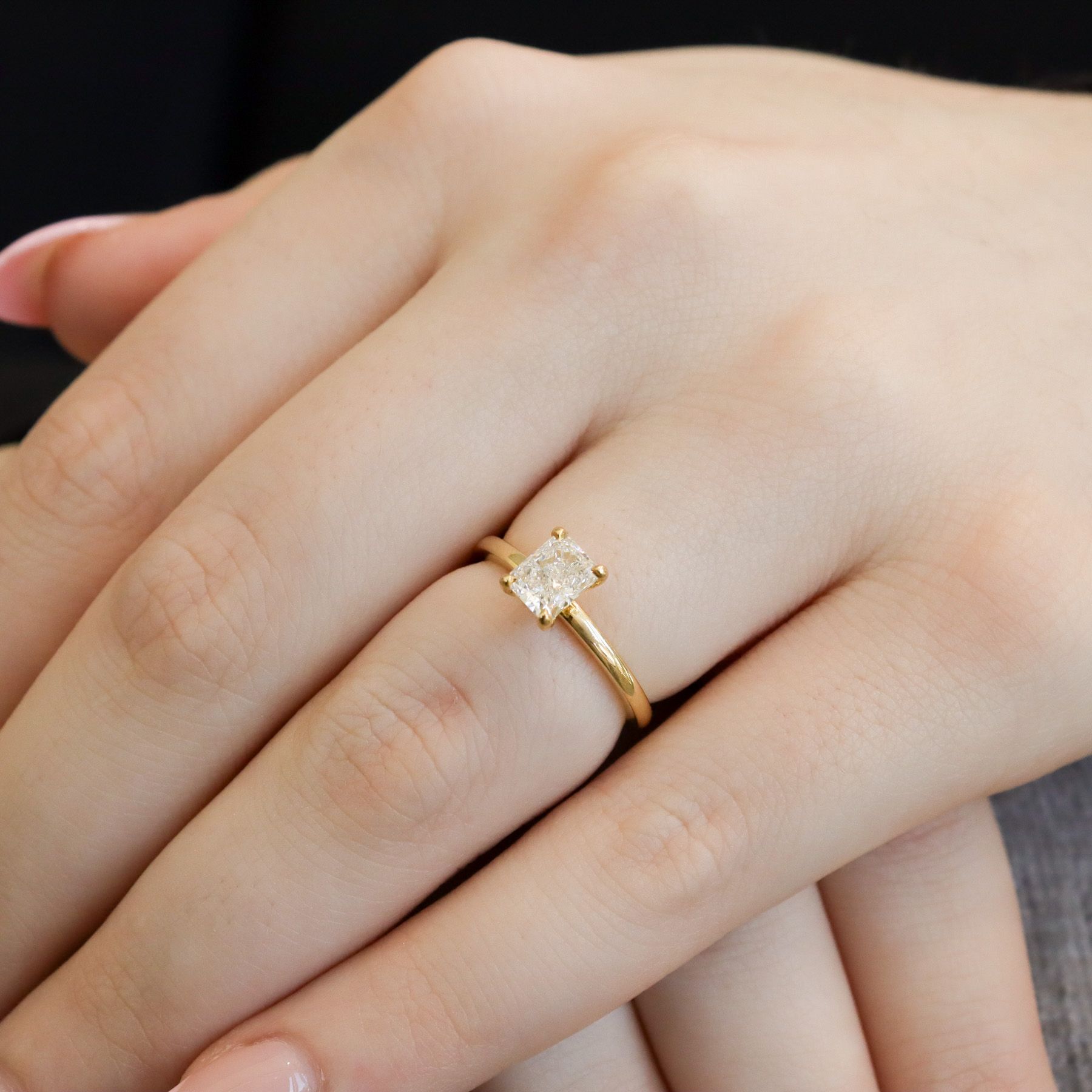 A lovely solitaire diamond engagement ring, featuring a colourless GIA certified 0.87ct cushion cut diamond, securely set in an 18k gold ring.