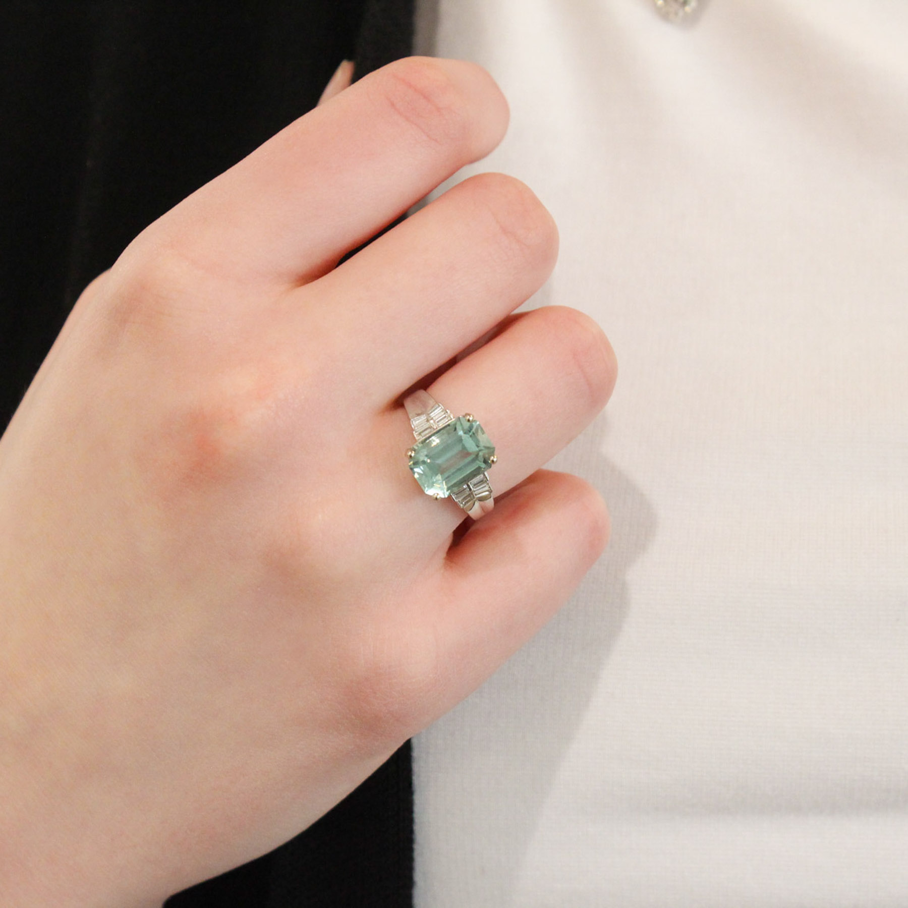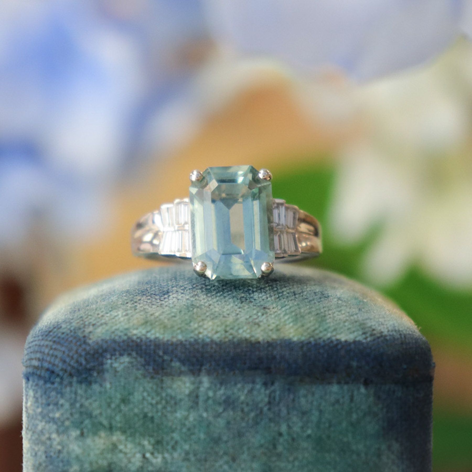 The deep blue green of this Aquamarine is stunning- the colour of a tropical ocean on a stormy day. Framed beautifully with baguette cut diamonds, flashing a bright white sparkle. This ring is bound to be a favourite to wear, and destined to be a future family heirloom.
