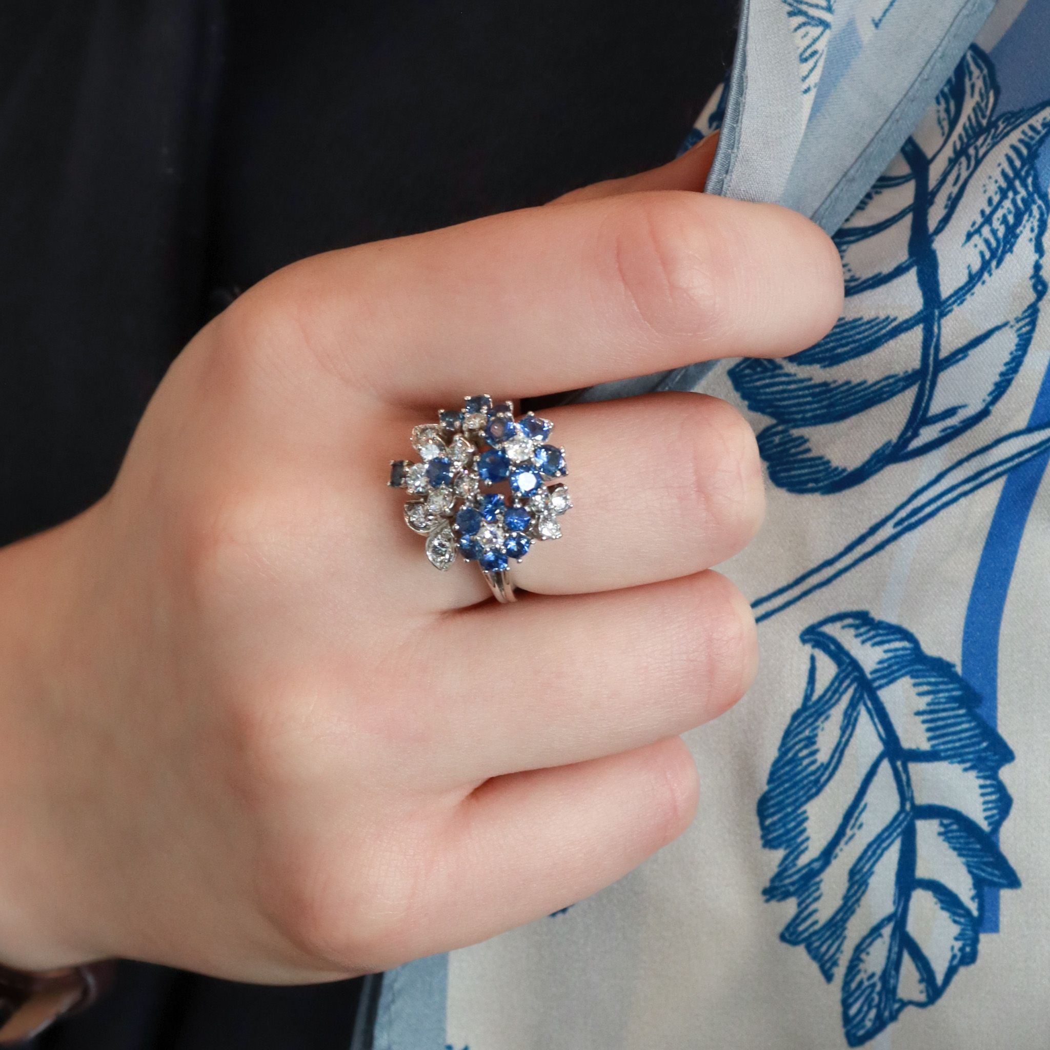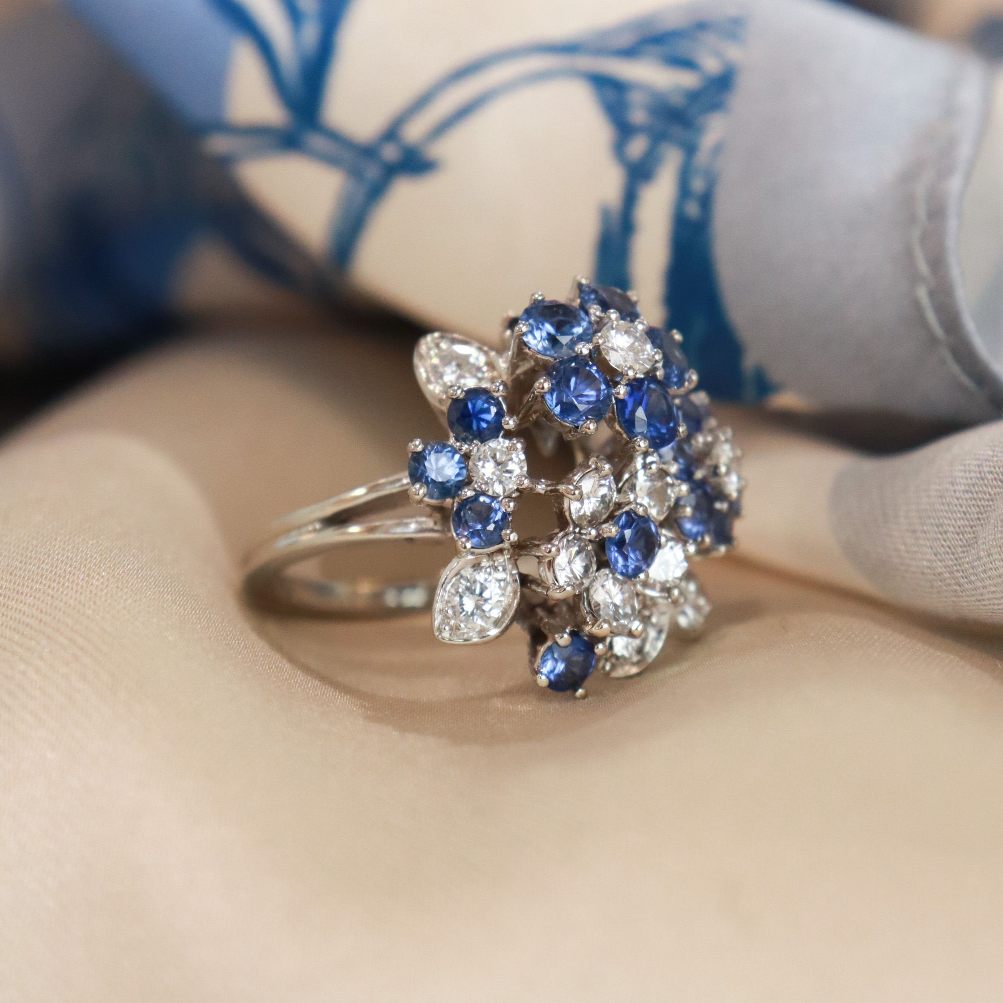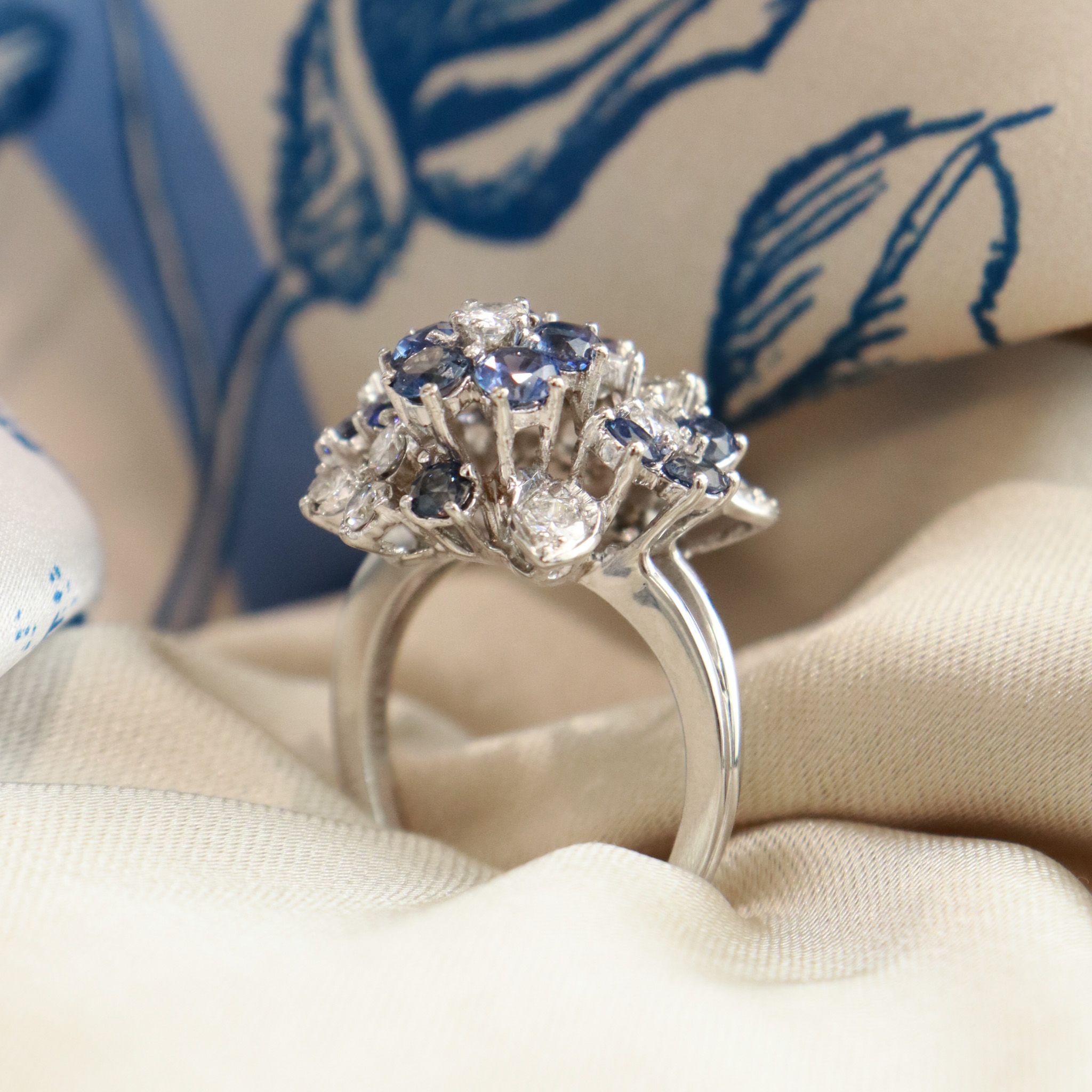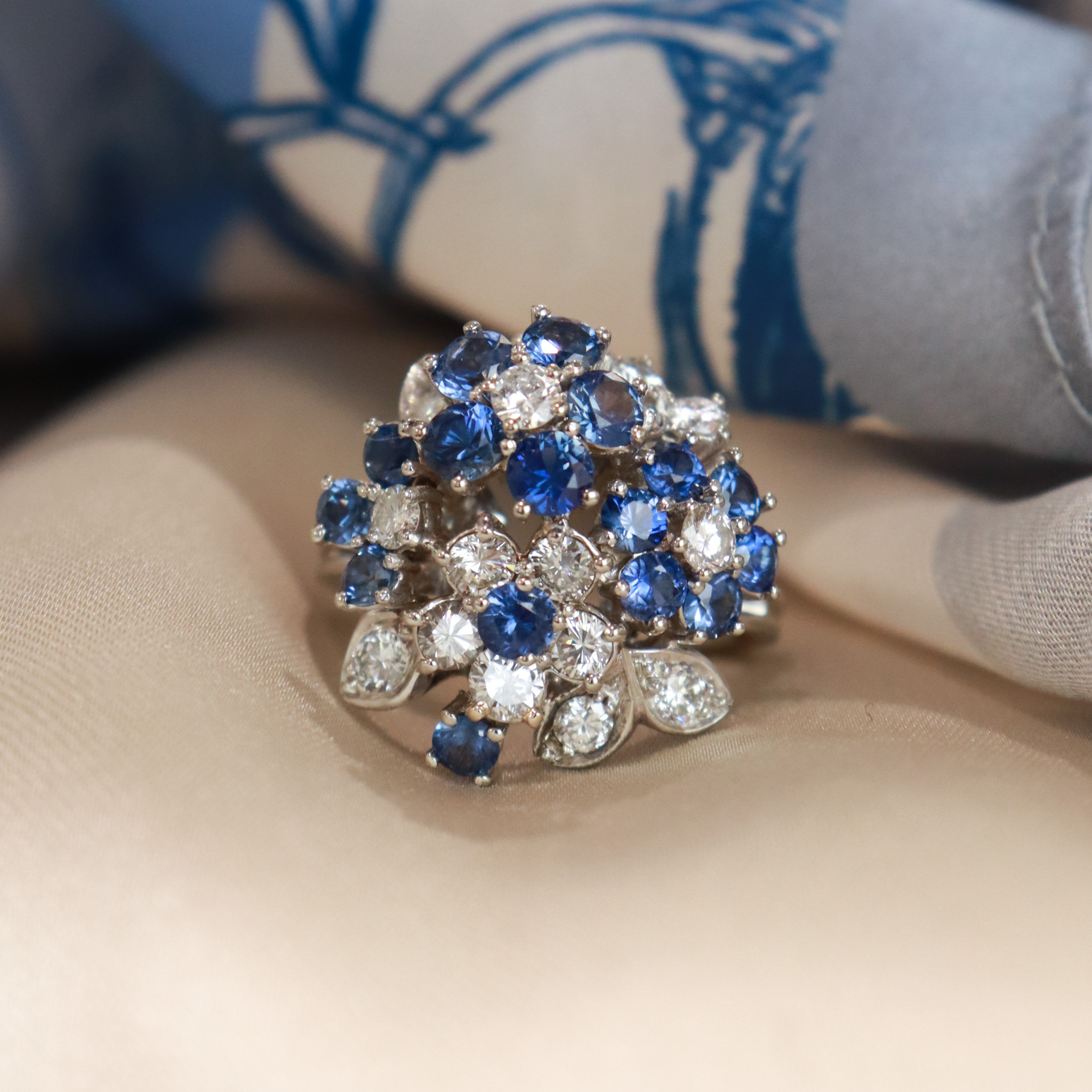 A bouquet of flowers that will never fade. This expertly crafted cluster of flowers are made of sapphires & diamonds, set in 18k white gold. Who dreams of spring? This ring delivers flower filled dreams.