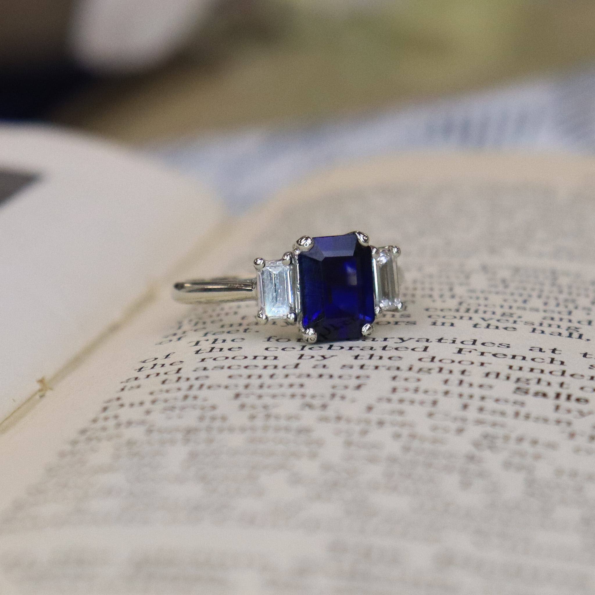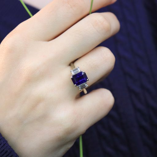 This sleek ring has a stunning deep royal blue sapphire, flanked by two colourless, set cut diamonds. A classic design, this would make a stunning engagement or right hand ring. We love sapphires for their durability, and this ring will stand up to everyday wear.