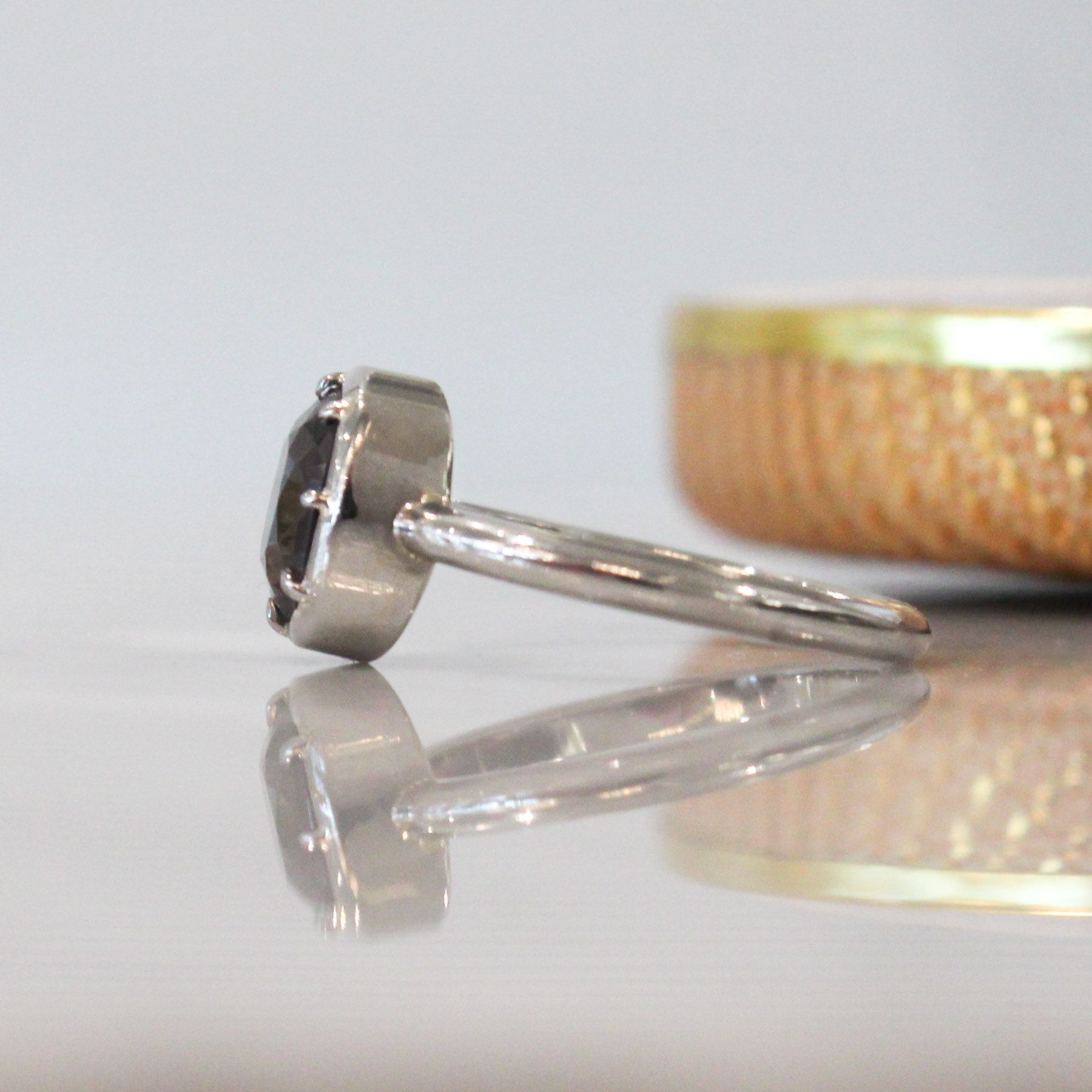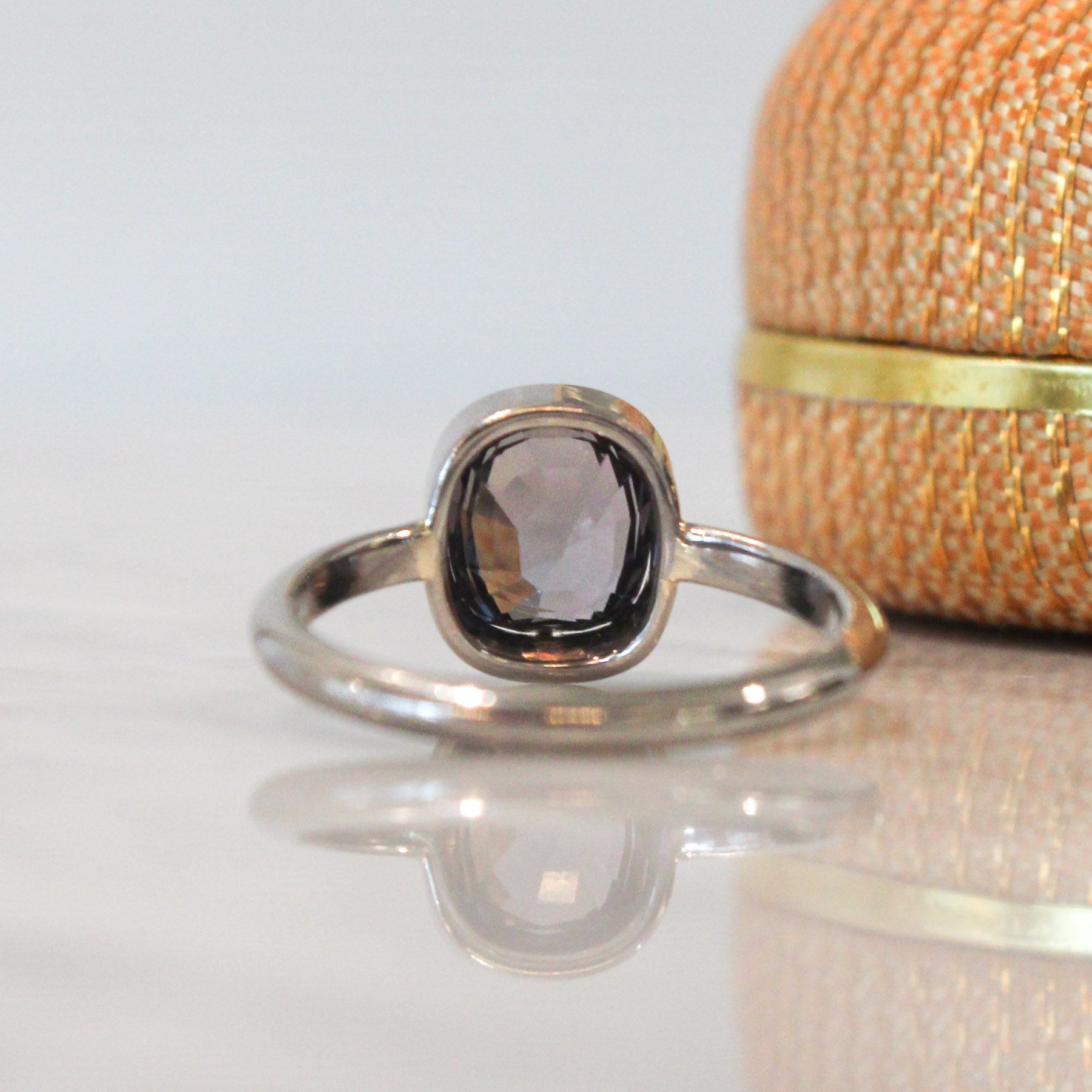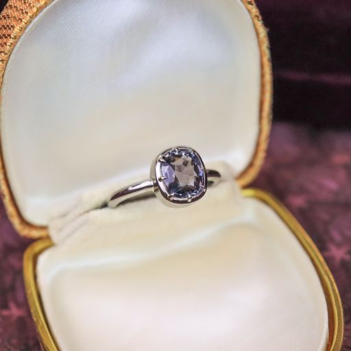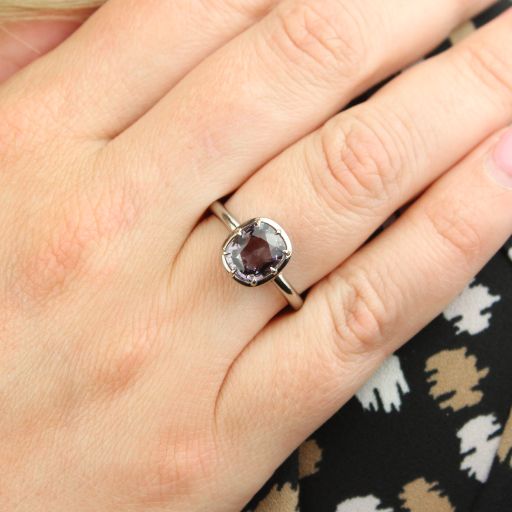 When we saw this deep, lavender grey spinel, we knew we wanted to set it in 18k Palladium white gold. We love alloying gold with palladium for it's deep gunmetal colour, hypo-allergenic properties & workablity when fabricating. We gave this ring eight talon claws and a custom made Collet setting. The result was a moody, unique ring, substantially crafted, with a rounded shank for maximum comfort. This ring is suitable for everyday wear.