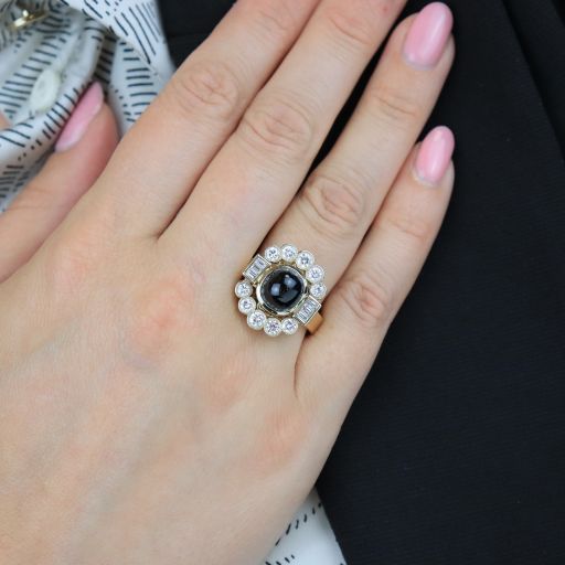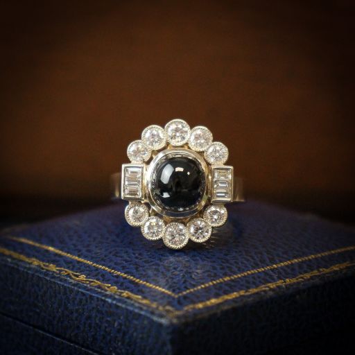 A testament to the multi generational life of a gemstone, this high dome, 5.90ct sapphire was rescued from a worn out Edwardian ring. Given a new life in this 18K yellow gold dinner ring, it will be sure to catch the eye of anyone who shares your table. With a nod to the original era, we designed this ring with a baguette & round brilliant diamond halo, but the heart of this incredible ring is the stunning deep blue sapphire. A sturdy comfort fit shank & a protective bezel setting guarantees this ring will be a multi generational heirloom.
