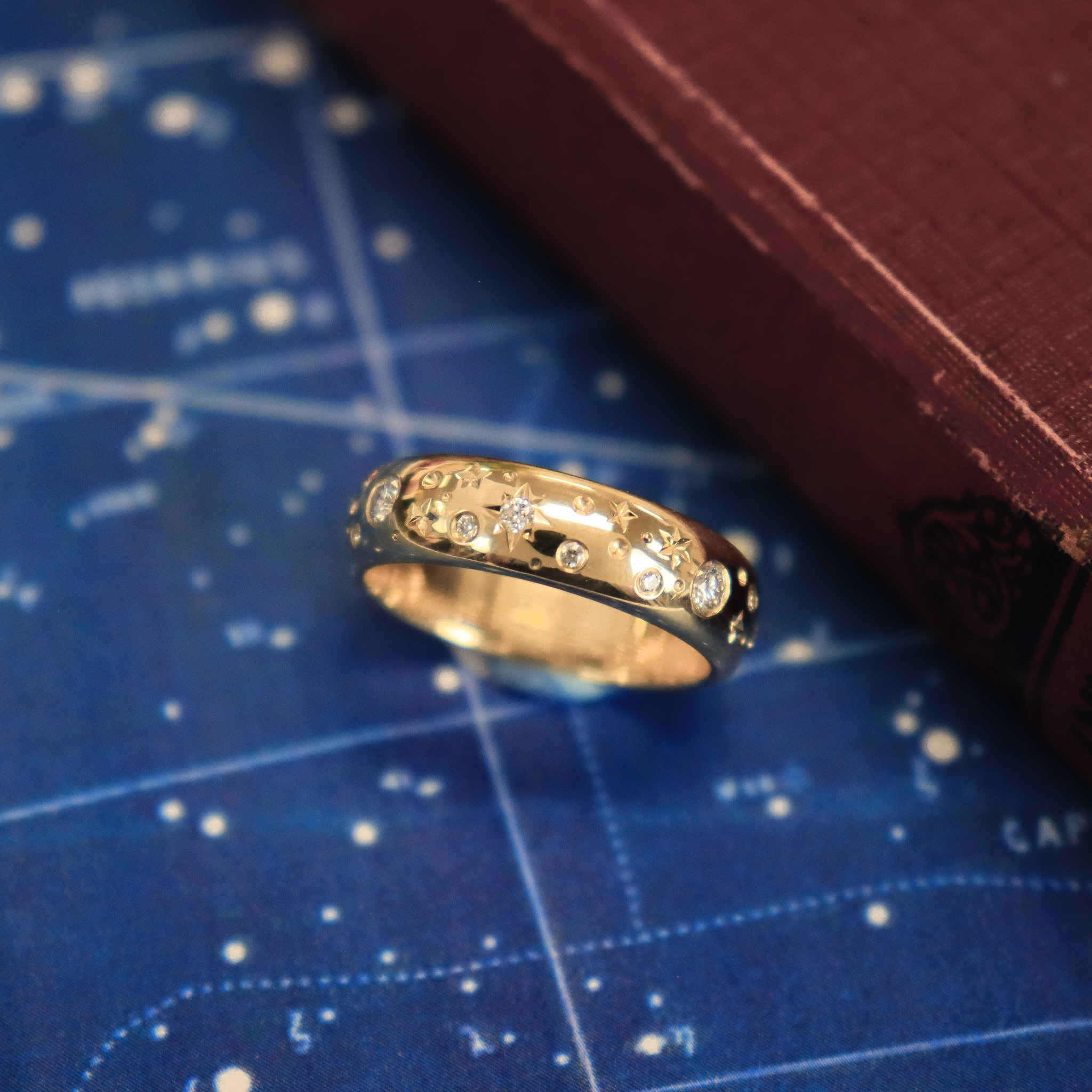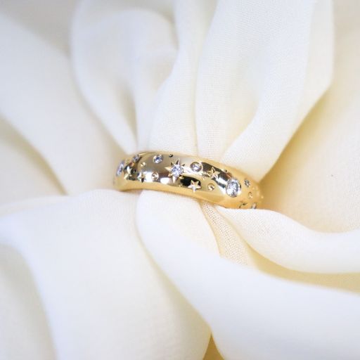 Made in house, thoughtfully set with a whimsical design. We have made many variations of these galaxy rings. From family wedding bands, set with mismatched sentimental diamonds, to a fresh take on birthstone rings, this is one of our favourite ways to re-purpose old treasures into a unique piece.