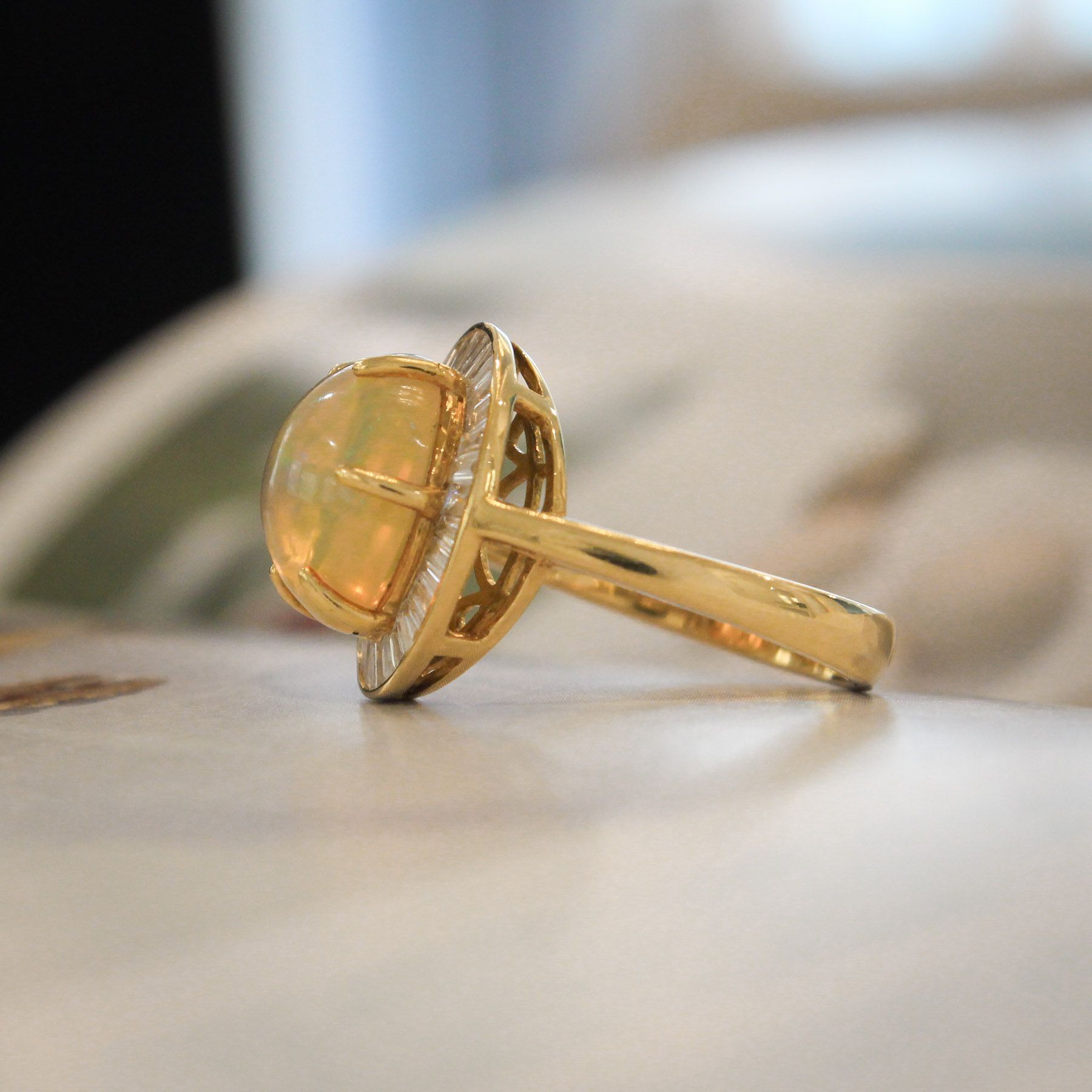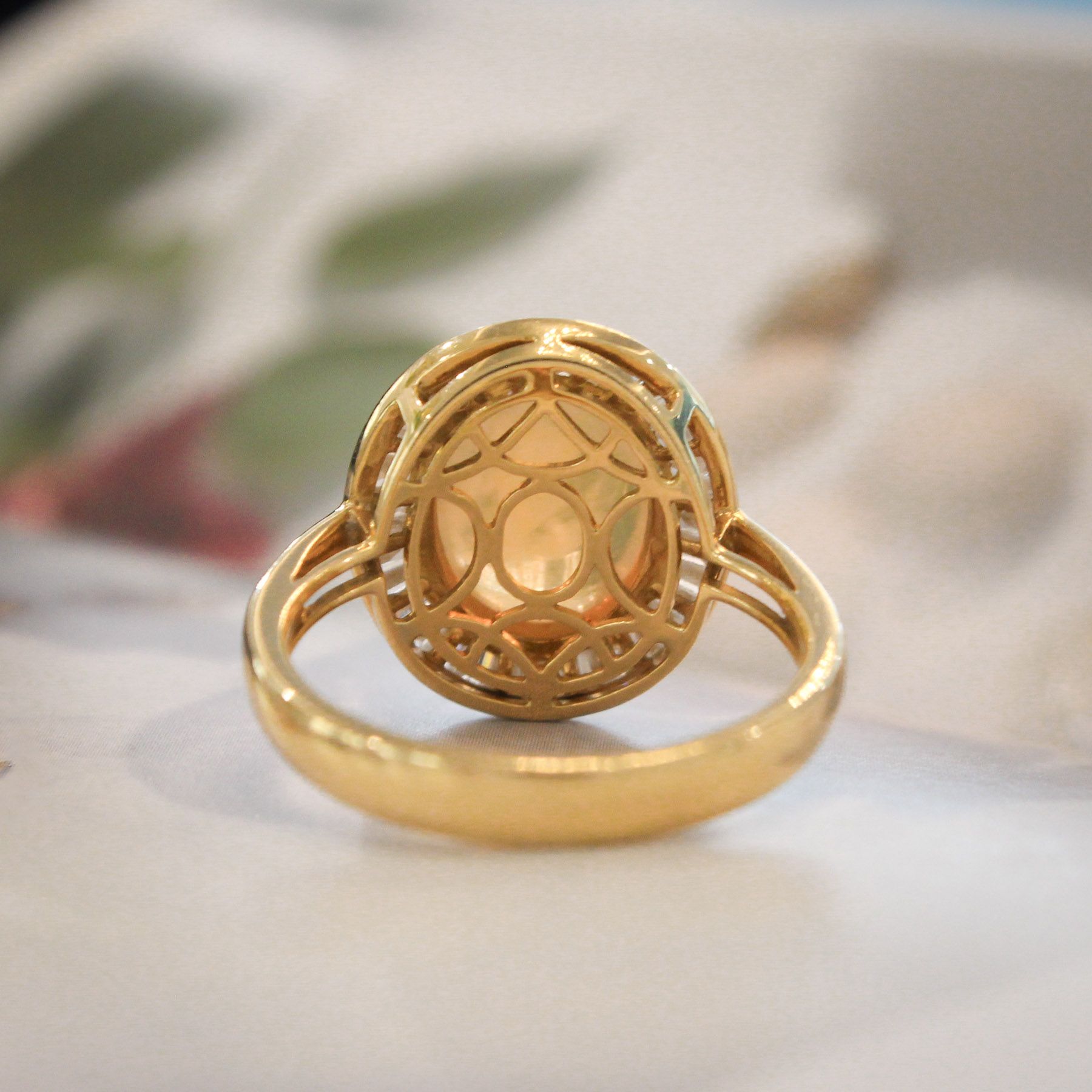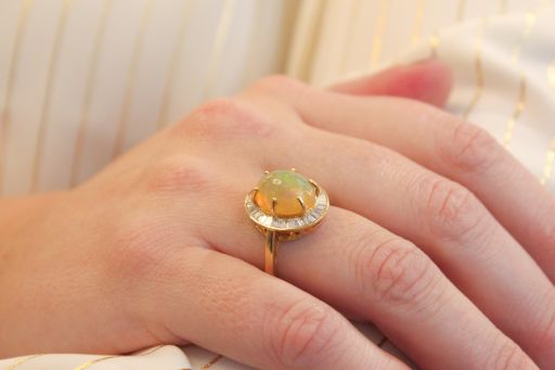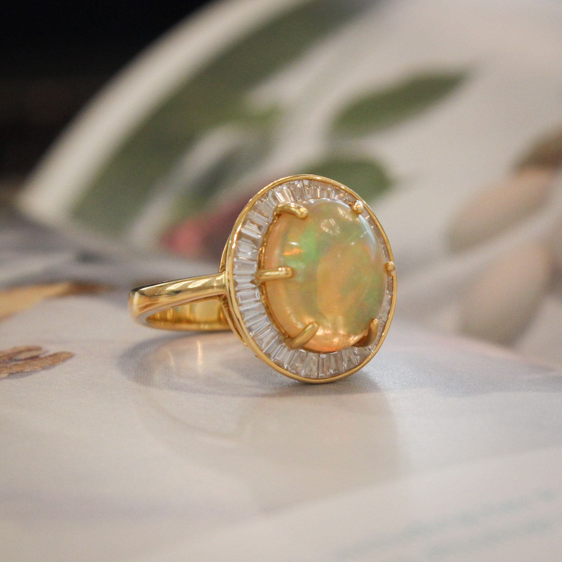 A ballerina diamond halo ring, set with a large jelly opal, showing a multi-directional play of colour. Prominently featuring flashes of green & yellow, orange & red.