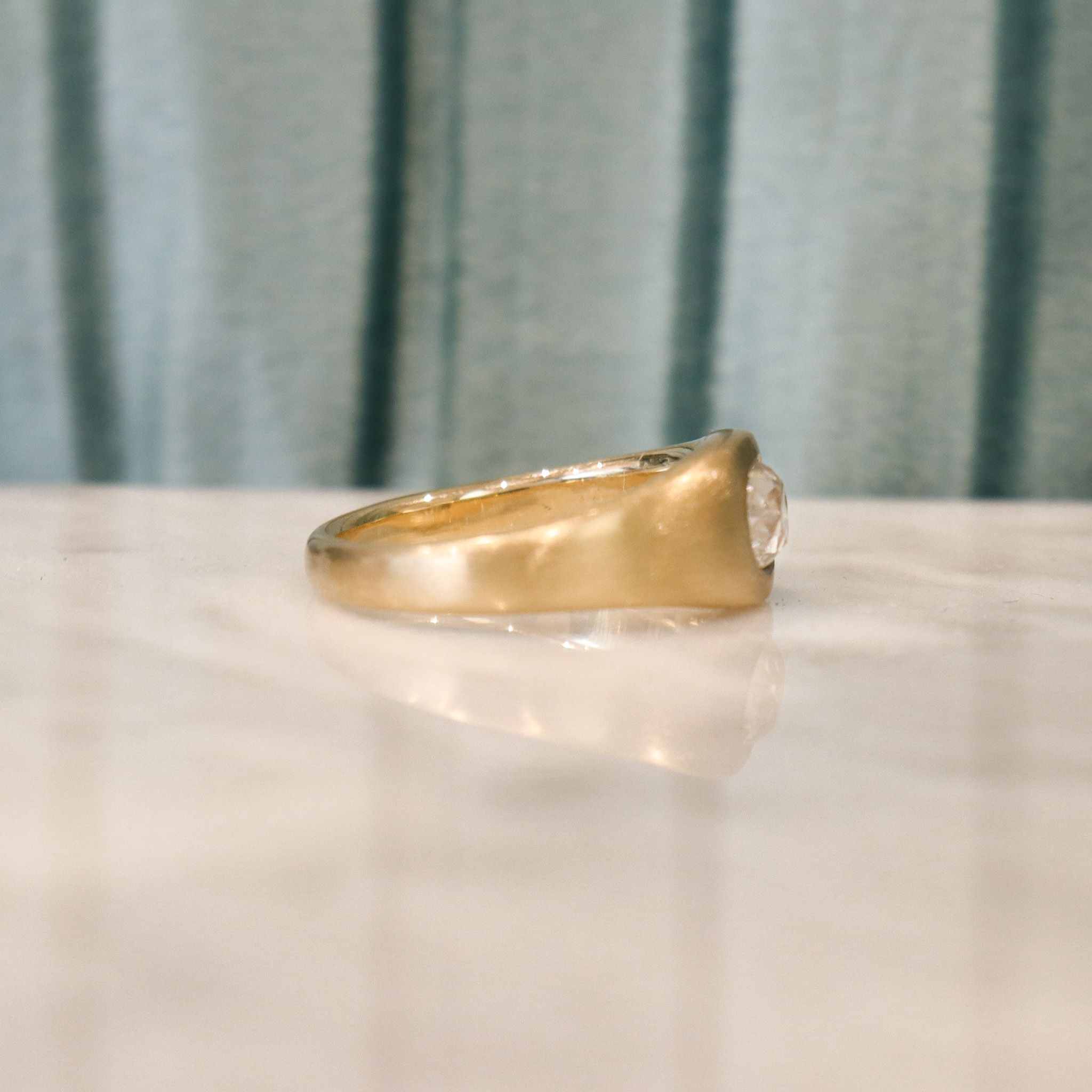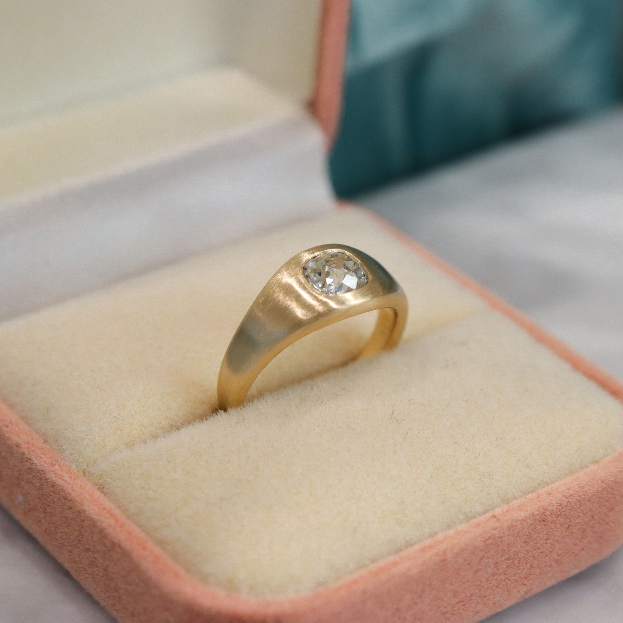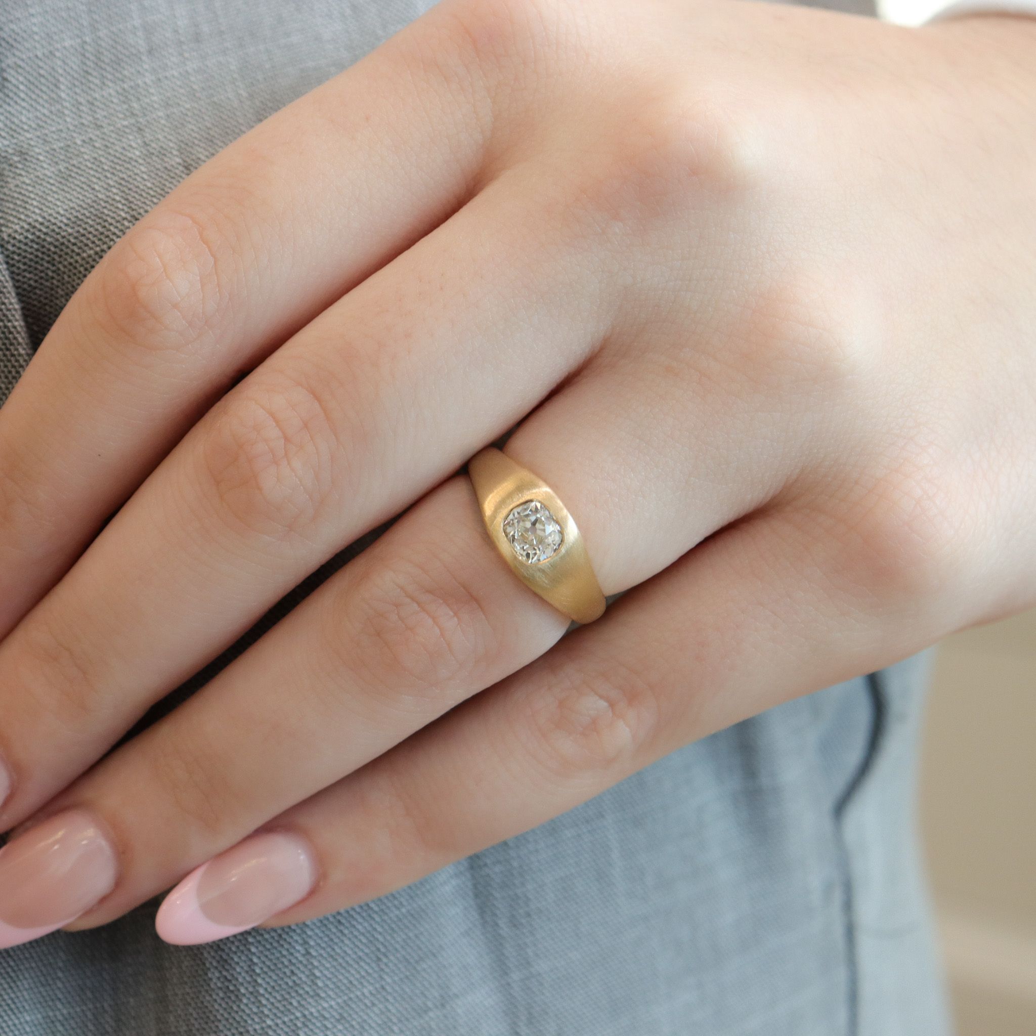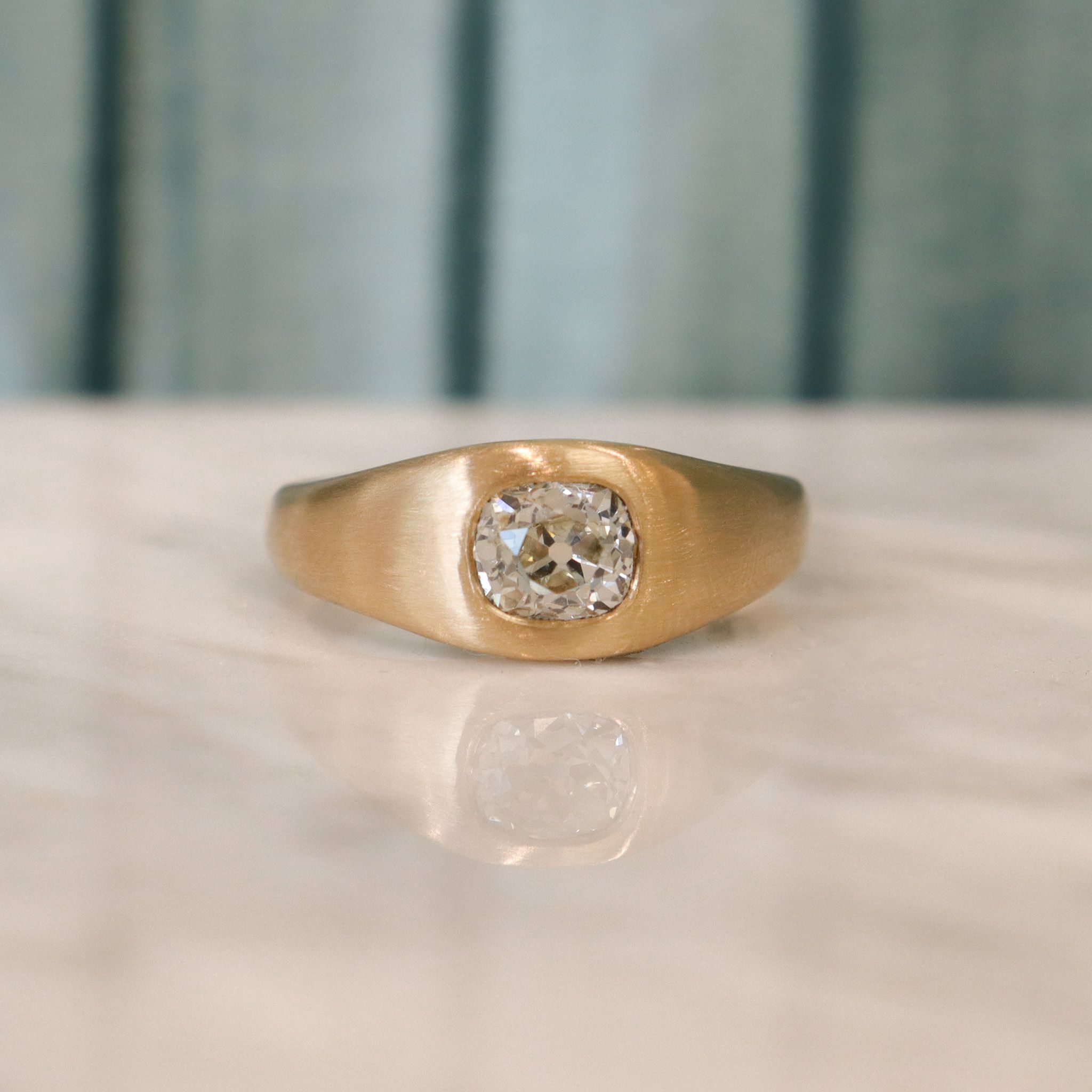 We've given the most charming old mine cut diamond a new life in this custom fabricated signet ring. Flush set in an 18k, warm tone of brushed yellow/champagne gold, the diamond sings a song with notes of rainbow sparkle. Perfect for everyday wear, versatile in a stack or on its own– this ring is just waiting to become a treasured heirloom.