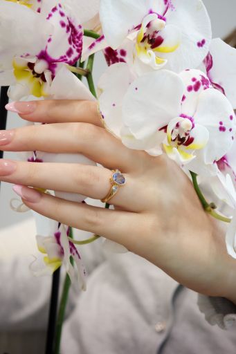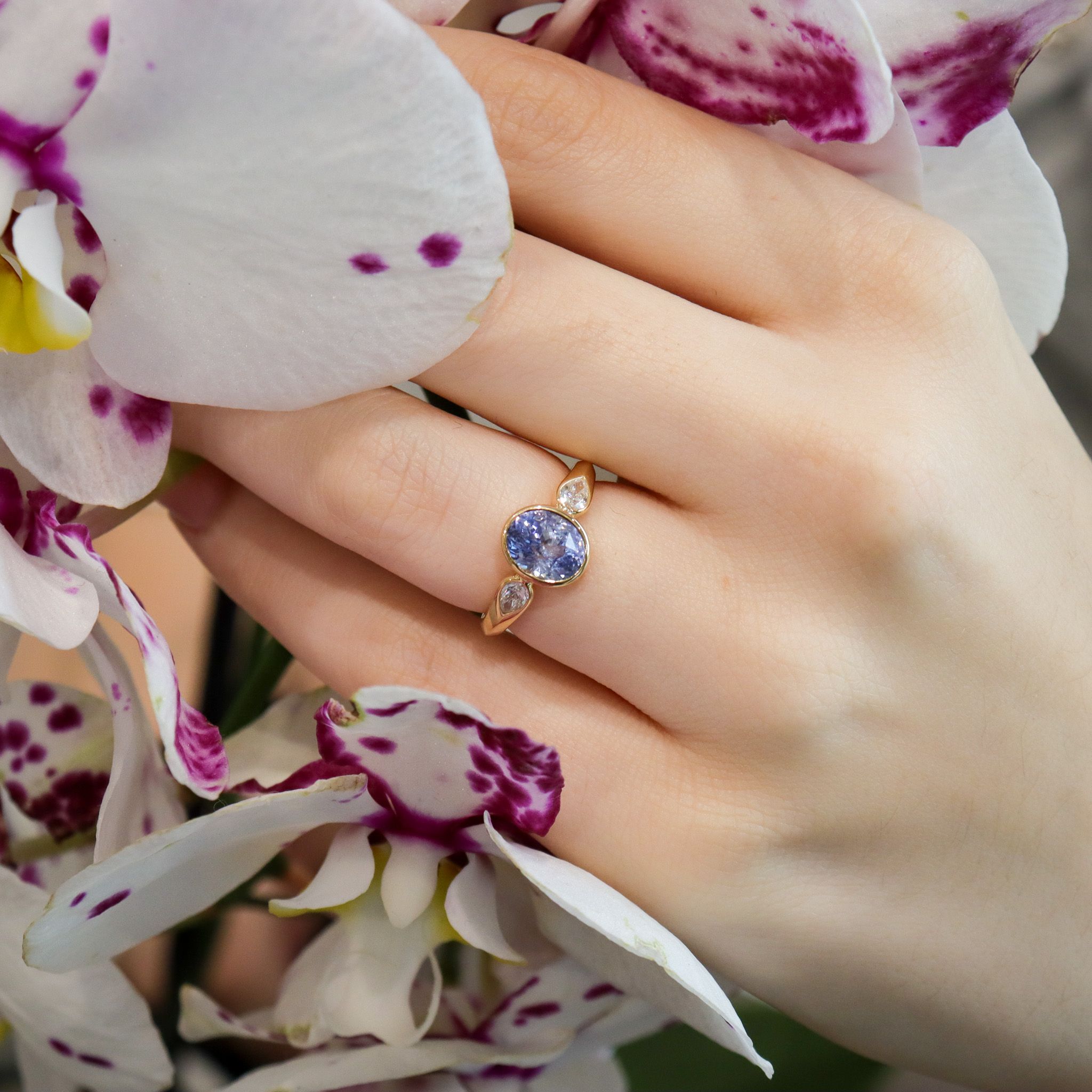A captivating 2.54ct natural unheated brilliant oval cut periwinkle sapphire is the marvel of this 18k yellow gold hand-fabricated ring. Find the shoulders subtly accented by two pear-shaped diamonds, weighing a combined 0.30ctw, set flush within a comfortable knife edge band that tapers ever so slightly. This three-stone ring is ready to outlive generations to come.