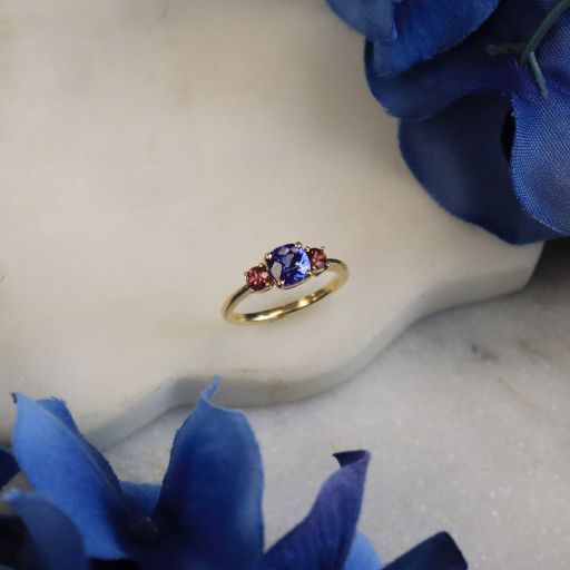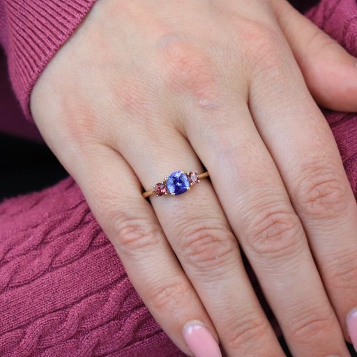 A bright beauty! A classic 3 stone ring but given a fresh take with playful pops of colour. A cushion cut Tanzanite is flanked by two rhodolite pink garnets, set in a tapered shank. Don't be fooled by the delicate look of this ring, it's made sturdy for a lifetime of wear. Fabricated with our signature comfort fit, this baby feels so good on the hand.