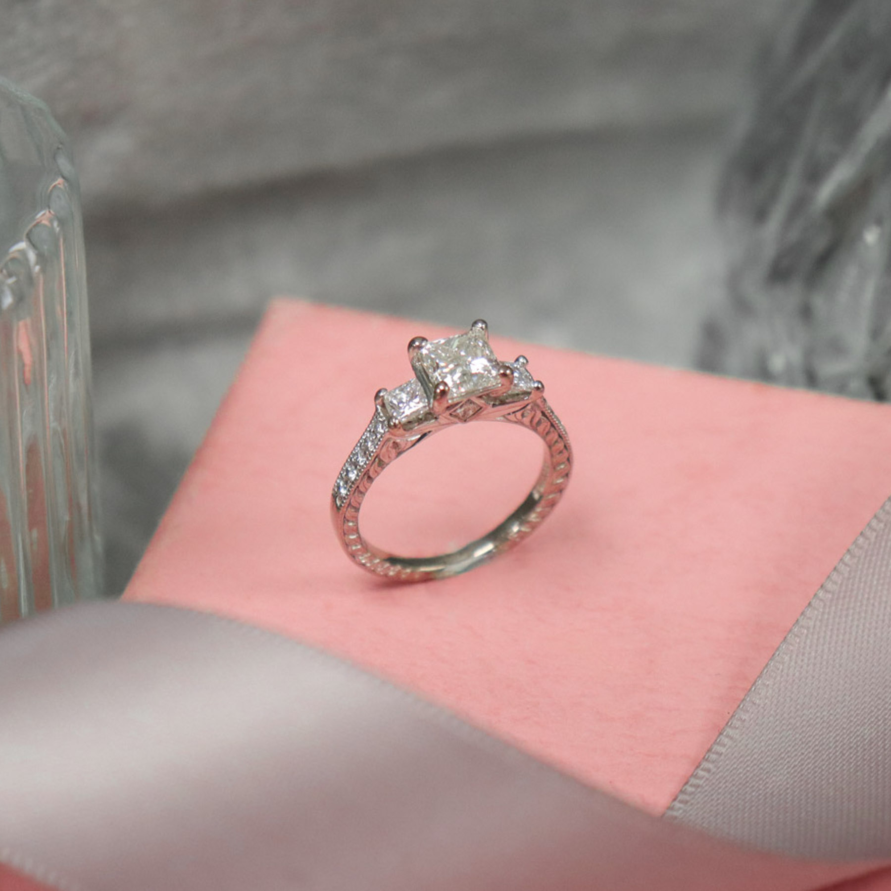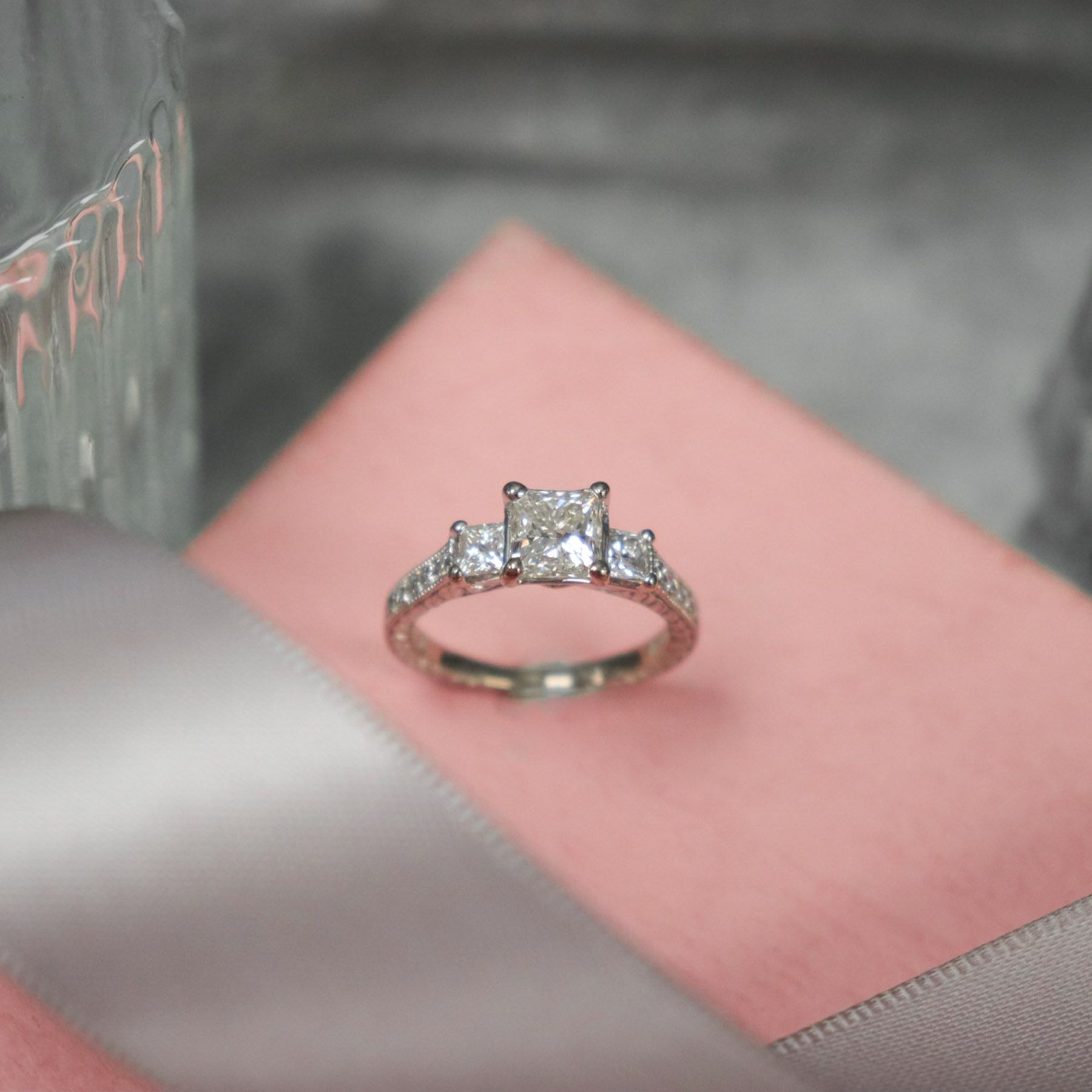 This ring is dreamy! A beautiful 19k white gold engagement ring with 1.74ct of natural diamonds. We're in love with the engraving that covers this ring, and the thoughtful details in the setting. Such a romantic design.