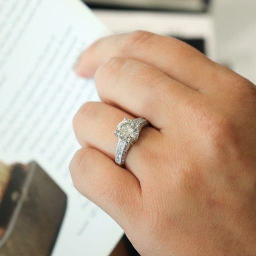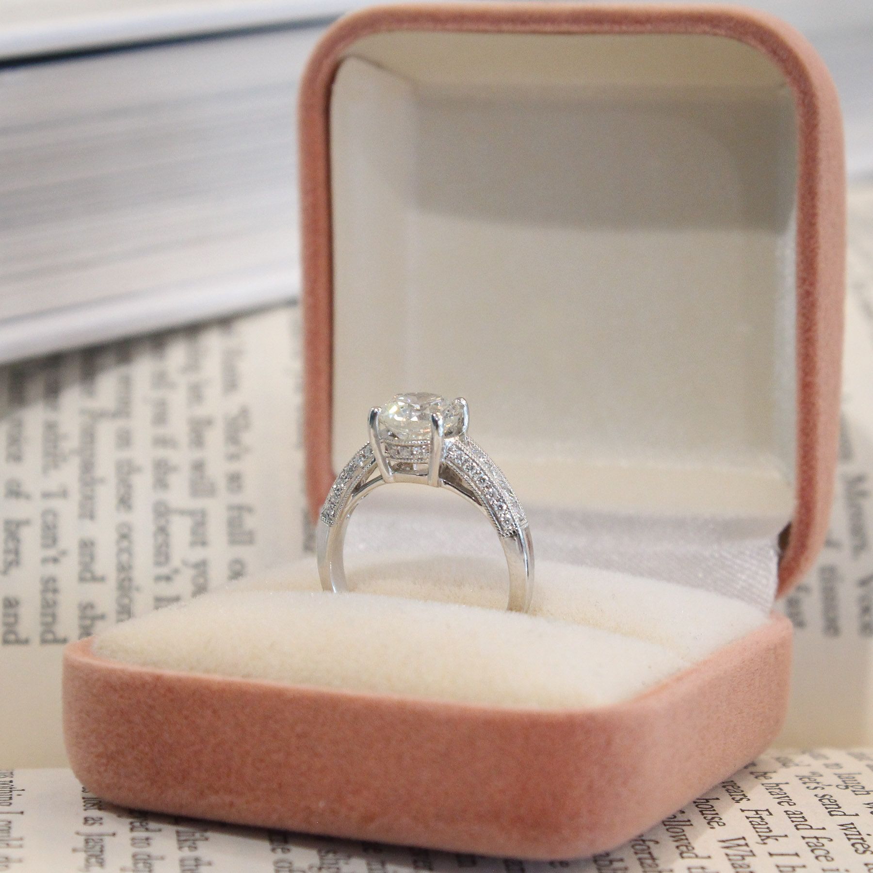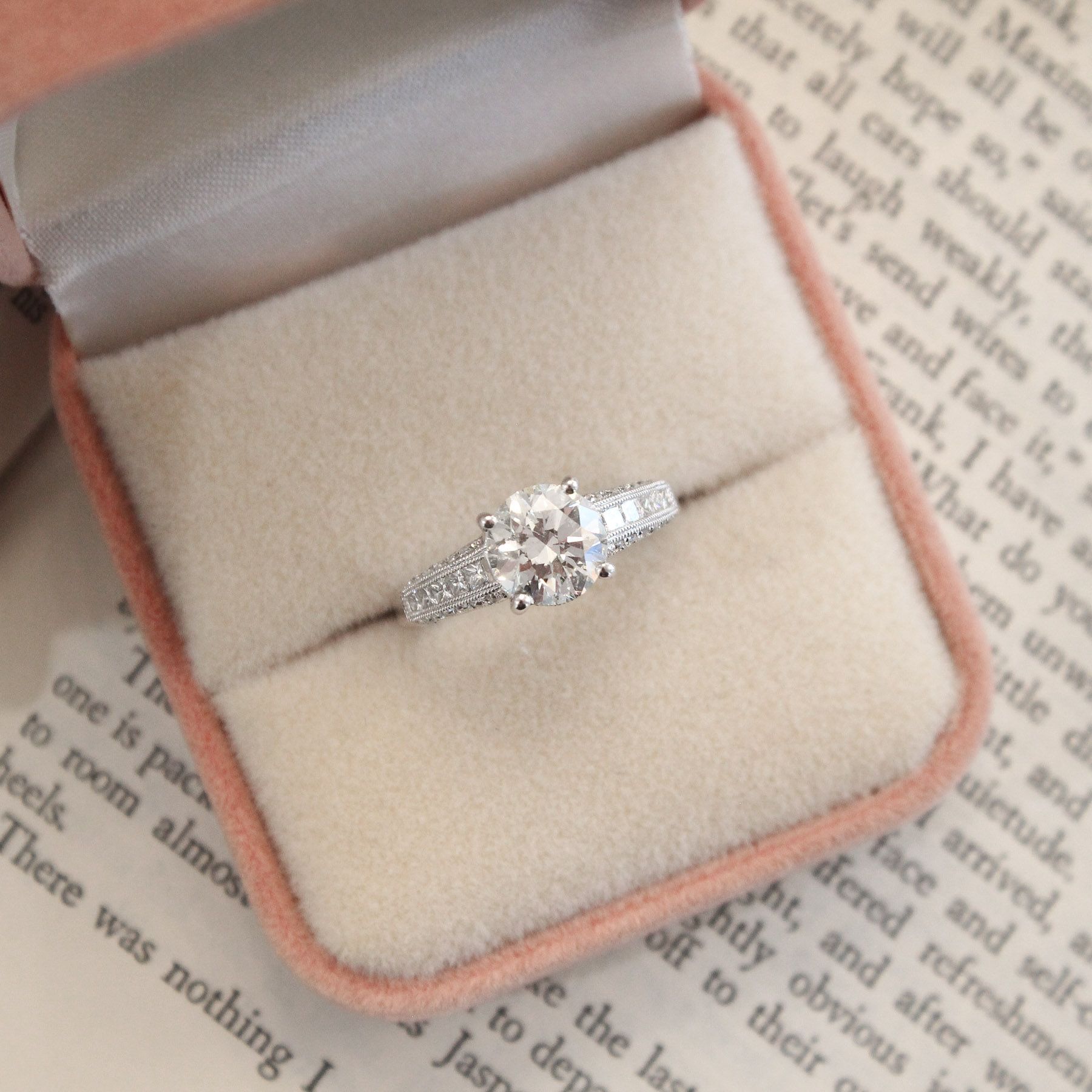 A classic solitaire design, elevated by the romantic channel and bead set diamonds that cascade down the sides of this ring, Well built, we're a fan of the profile of the ring, where the 2ct diamond is set lower, allowing for functional everyday wear. It also has the sweetest pave set halo of diamonds under the centre stone and fine millgrain details encompassing the diamonds in the setting- swoon! This engagement ring has us drooling.