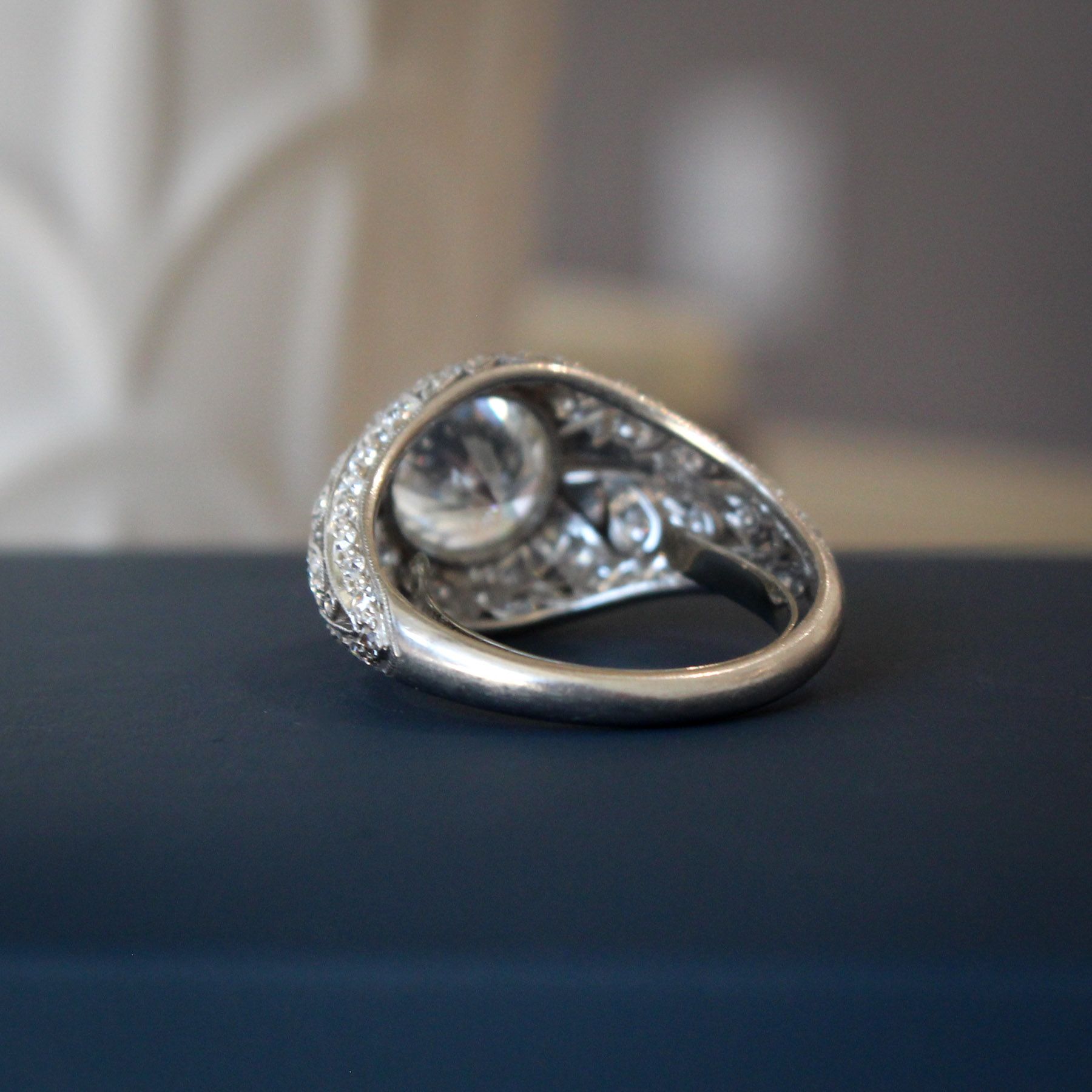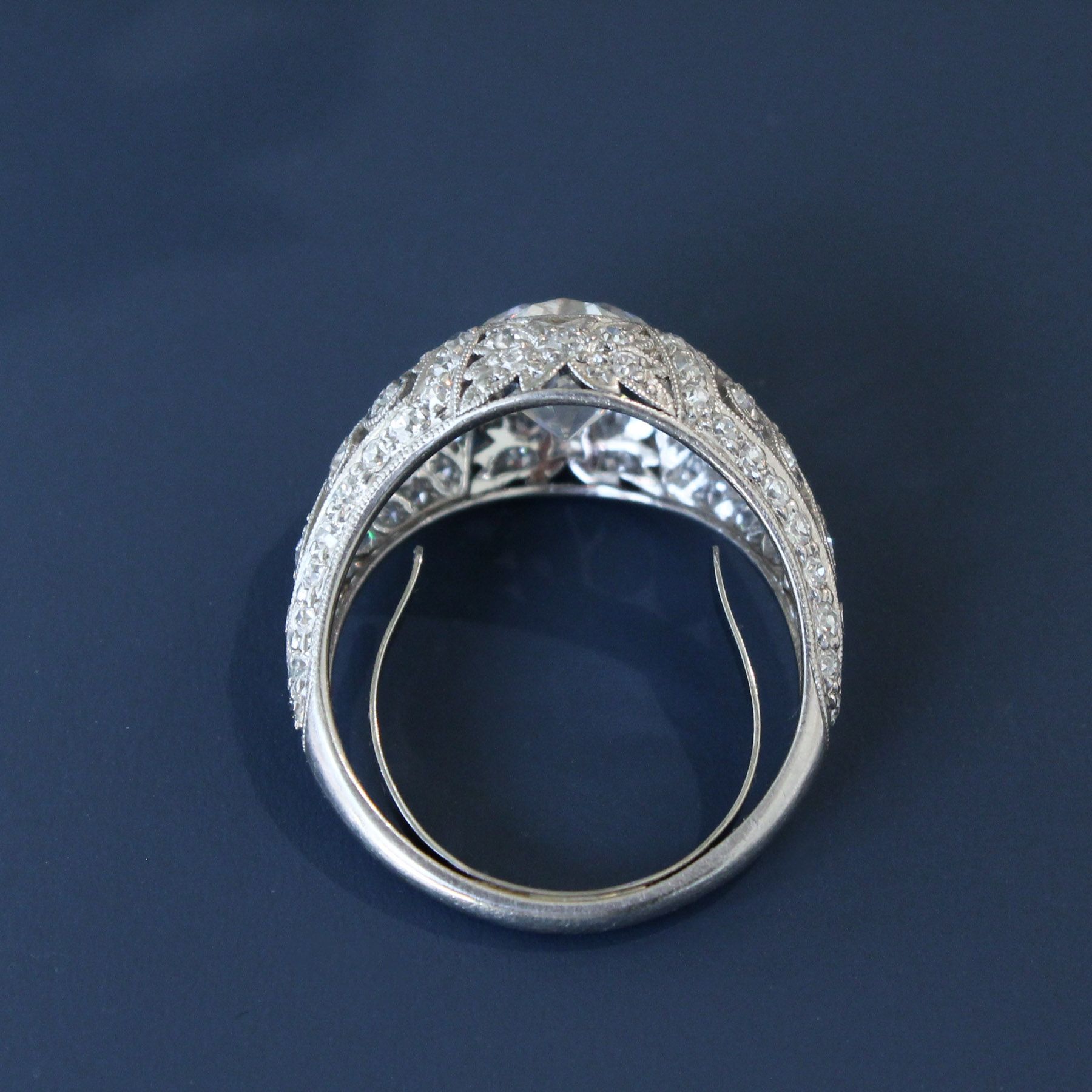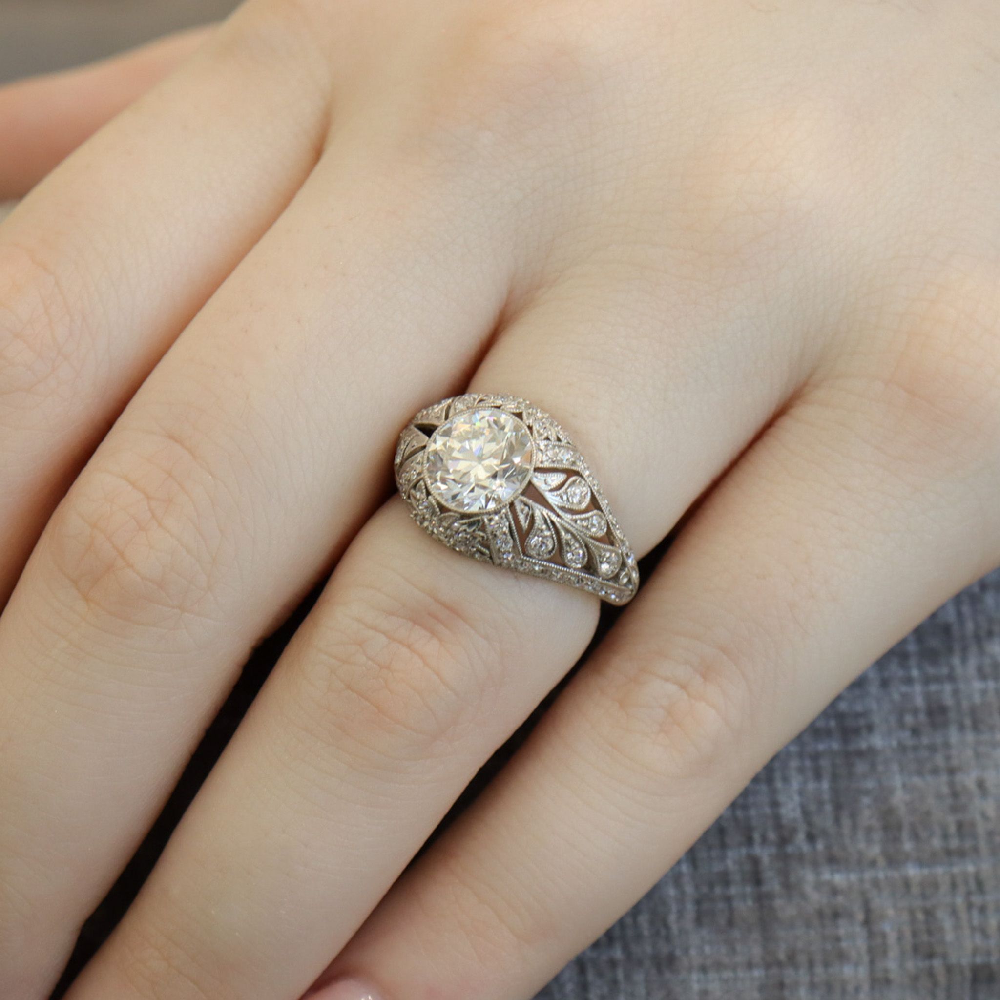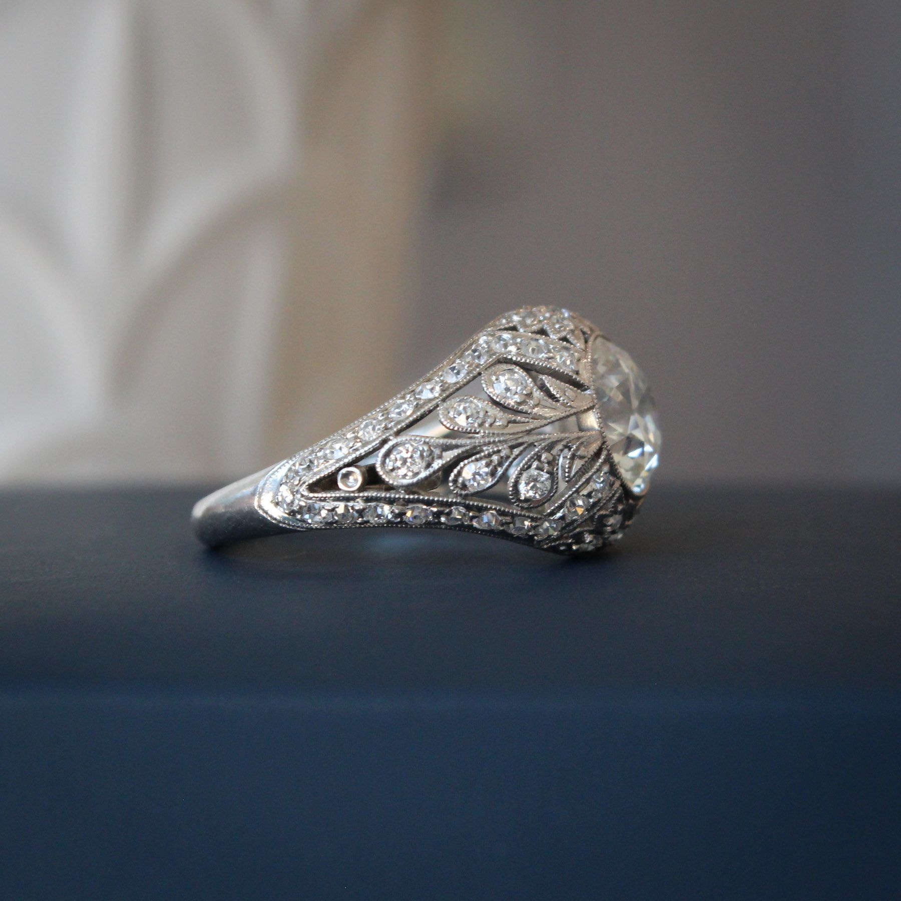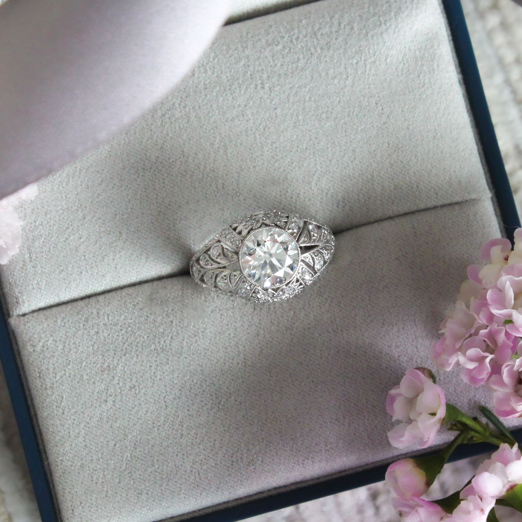 This Art Deco engagement ring makes our heart skip a beat! In the centre sits a bright and sparkling, exceptional quality, European-cut diamond weighting 2.20ct. The bezel-set stone is dramatically encircled with milligrain edging, fine piercing work, and intricate hand-engraved decoration set with single & European cut diamonds. It's not often we see an antique piece in perfect condition- this exceptional Art Deco ring looks as though it could have left the master platinum jewellers bench yesterday.